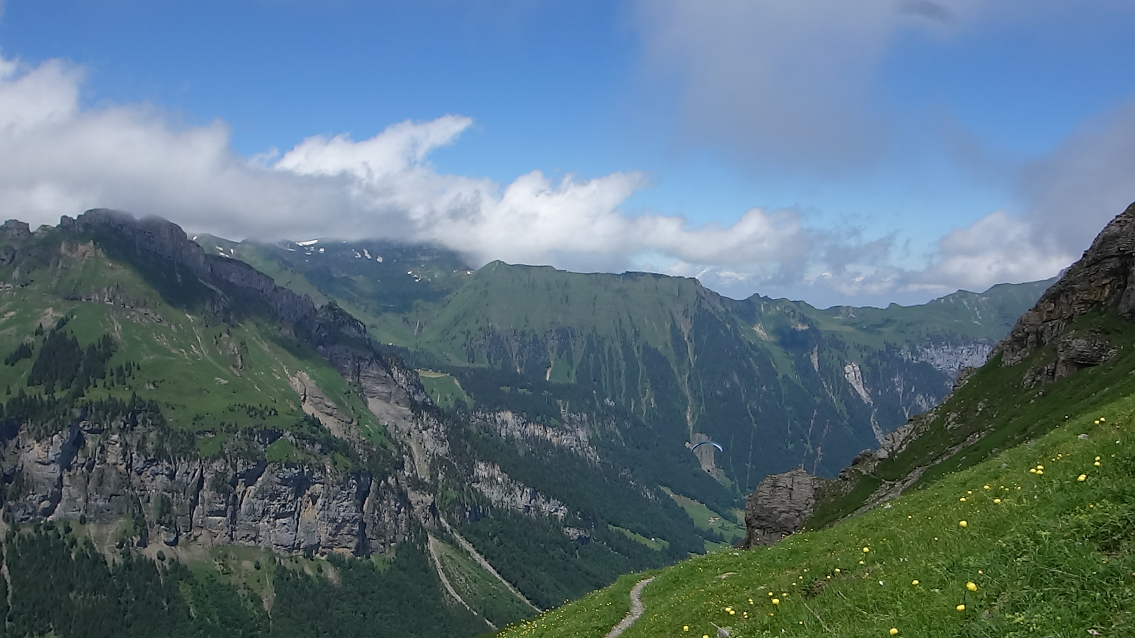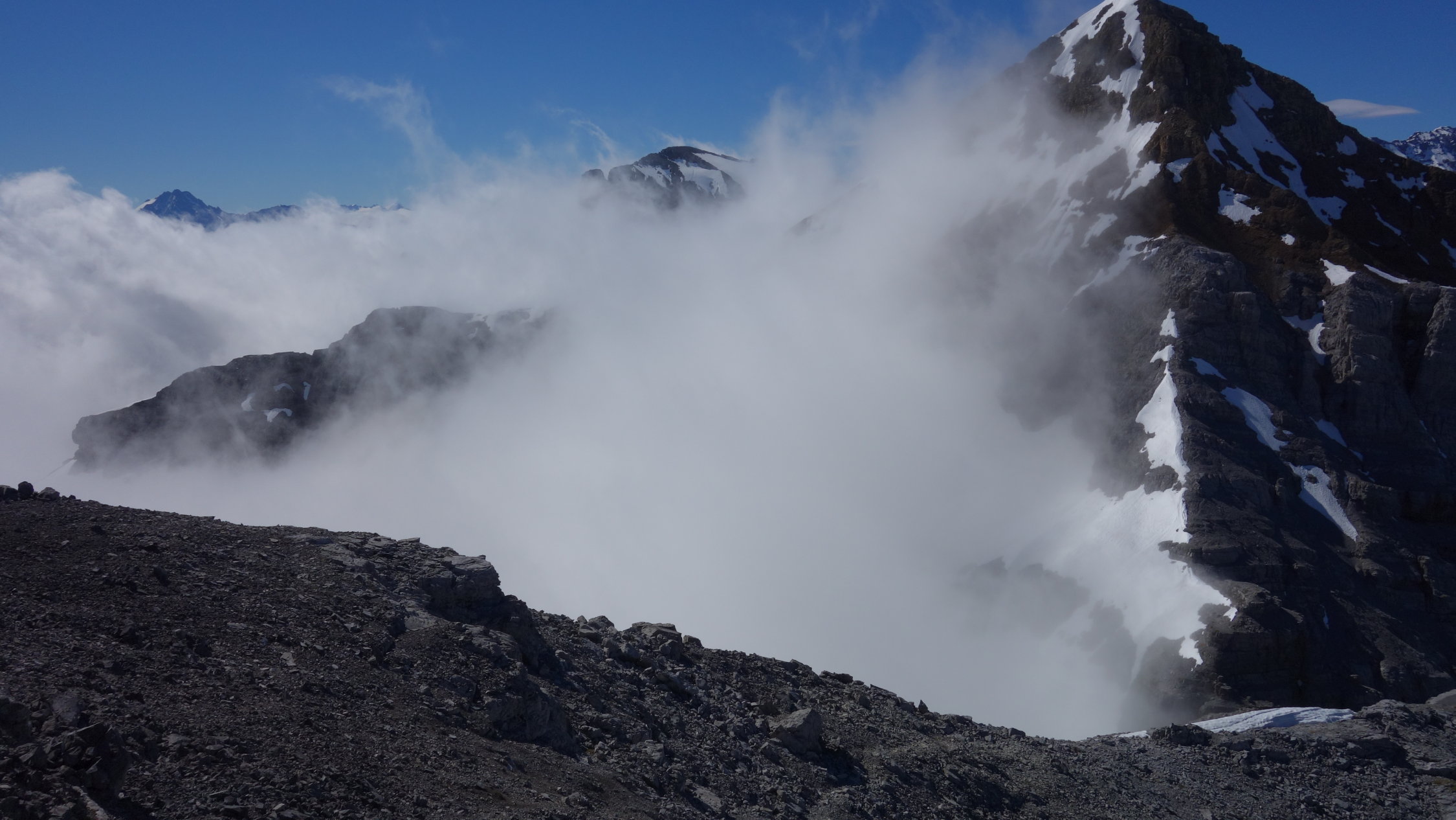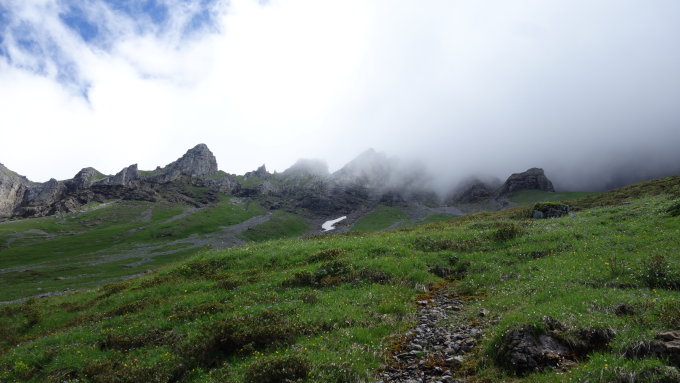 Von Biwaldalp auf den Schlieren mehrheitlich trocken. Es muss nur ein kleines, unkritisches Schneefeld begangen werden.