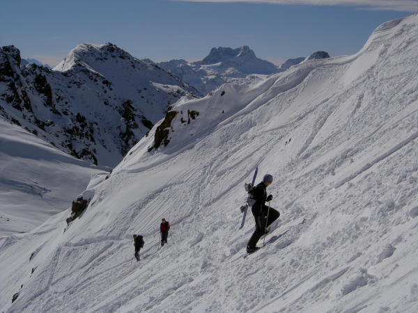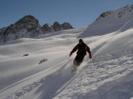 Bemerkenswerte Frühwinterverhältnisse mit 30 bis 40 cm Pulver, der sich mit der Unterlage erstaunlich gut gebunden hat. Nur vereinzelte kleine Lockerschneerutsche an extremen Steilhängen beobachtet. Aufstiegsspur auf für Snowboarder geeignet. Das Gebiet wurde übers Wochenende von ca. 50 Personen befahren, es gibt jedoch noch freie Stellen...