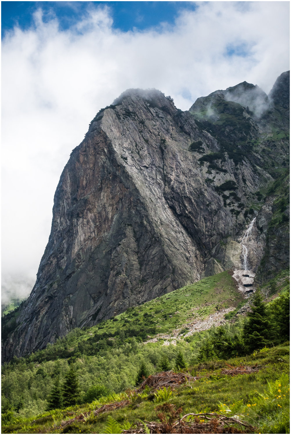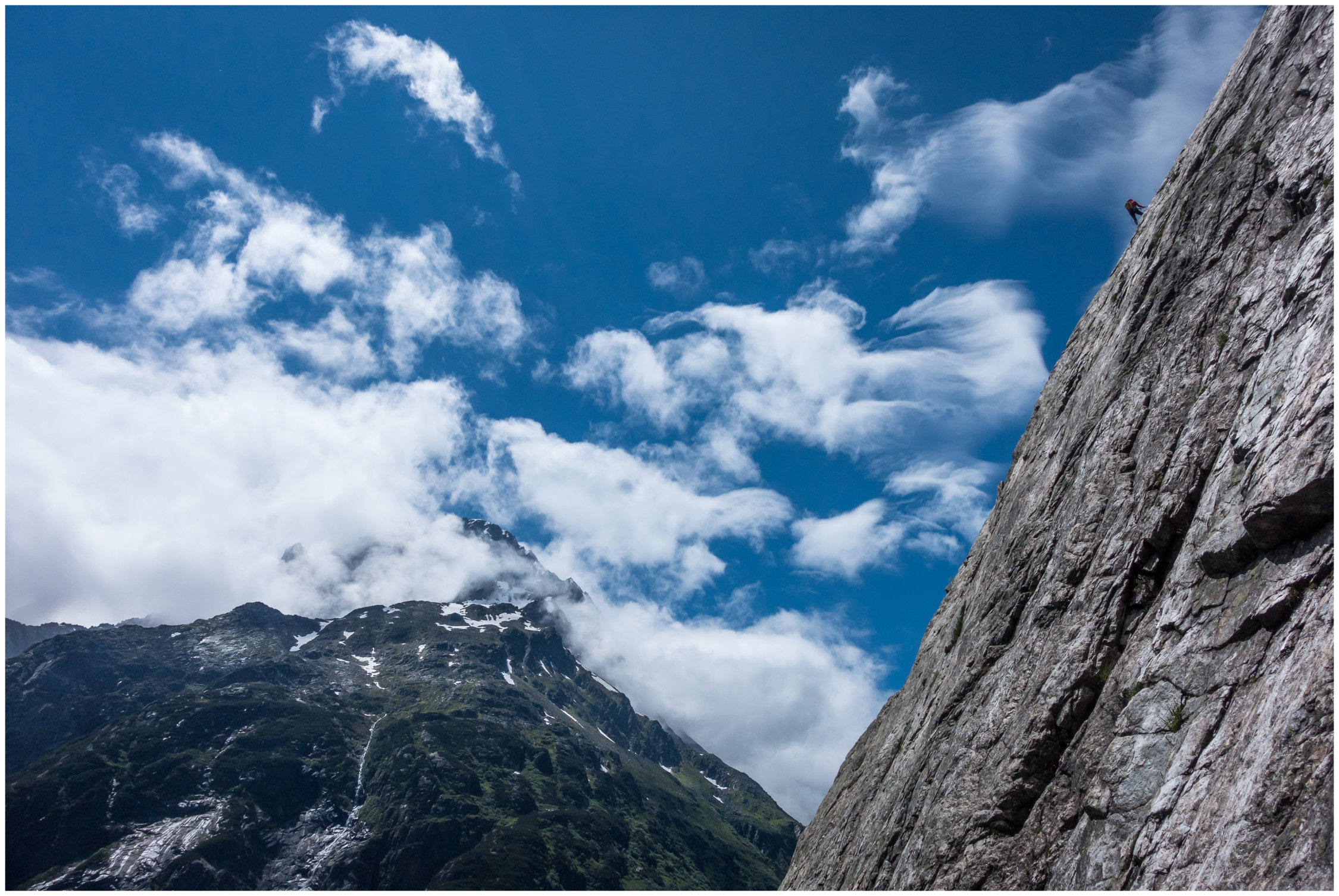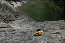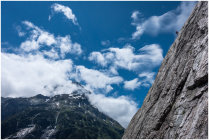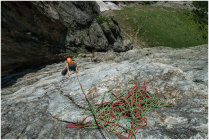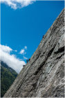 Nach den Regenfällen von gestern (wahrscheinlich bis in die Nacht) gab es noch die eine oder andere nasse Stelle in der Route - trotz dem wir erst um 12:30 eingestiegen sind. In der 1. SL sind die nassen Stellen leicht zu umgehen. In der 4. SL sind zwei Bolts komplett im Feuchtgebiet (es tropft von oberhalb über die grosse Felsstufe rechts der Route).. man kann aber die Stellen trotzdem klettern, da die Tritte und Griffe gerade dort ziemlich kantig sind und man nicht auf Reibung klettern muss...