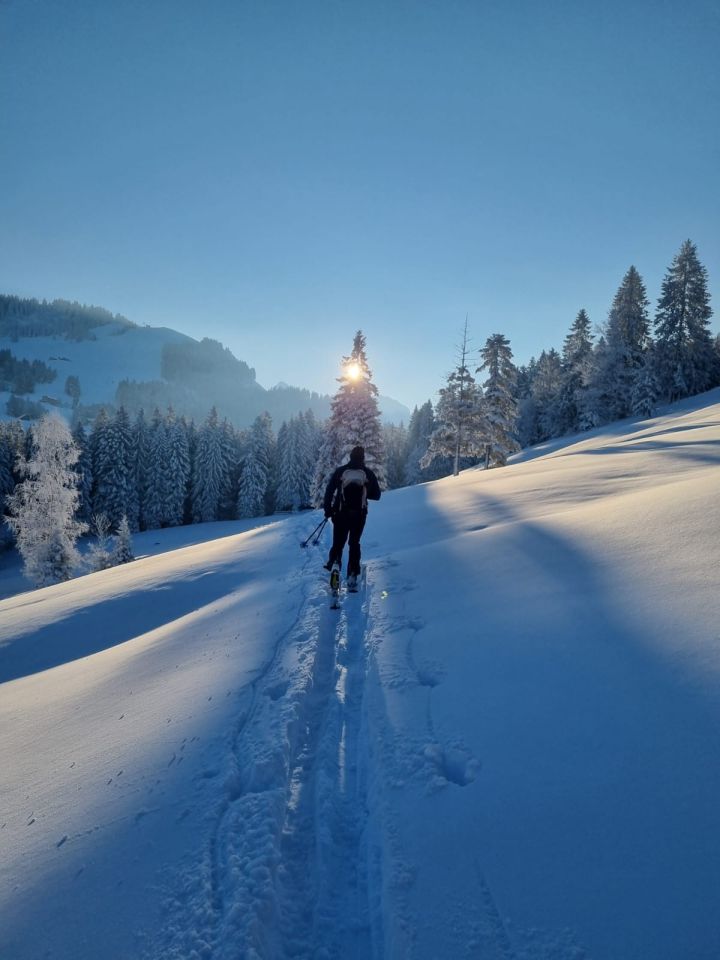 Vom Parkplatz zum Mostelbberg, weiter über Hochstuckli und Spielmettlen. Kein Steinkontakt bis zum Parkplatz. Fast zu viel Neuschnee, eher langsam.