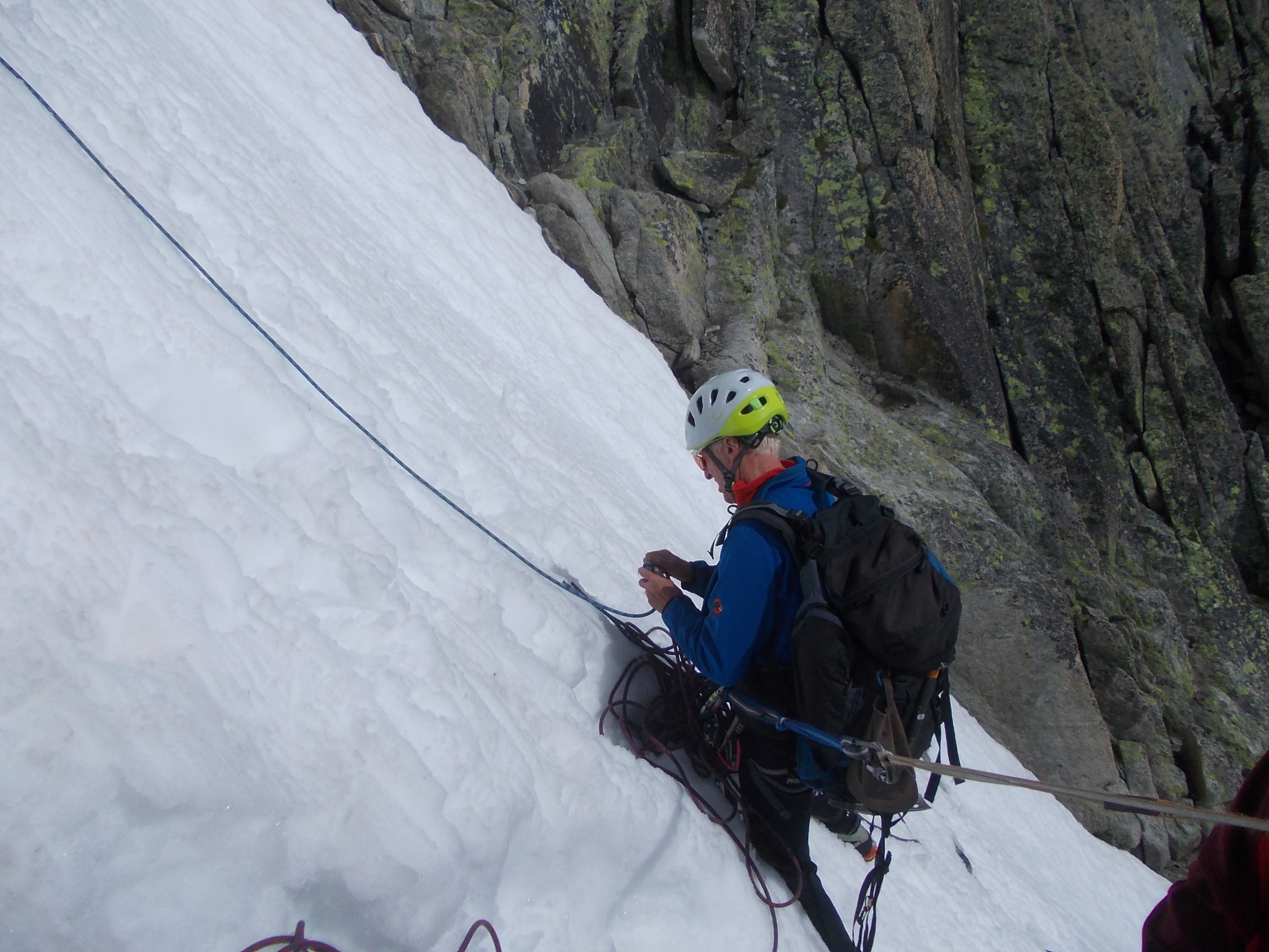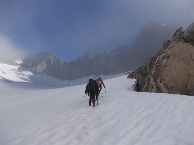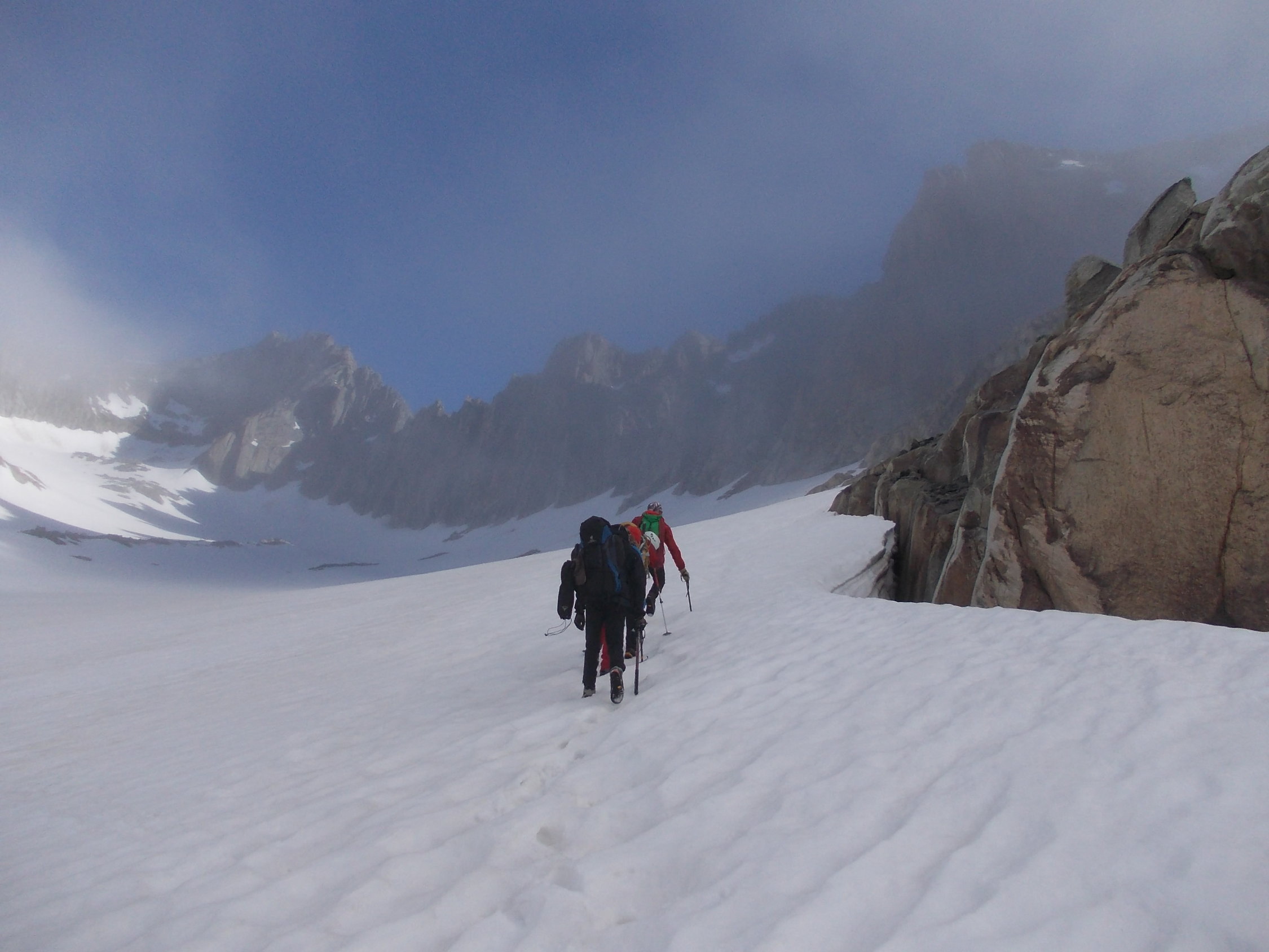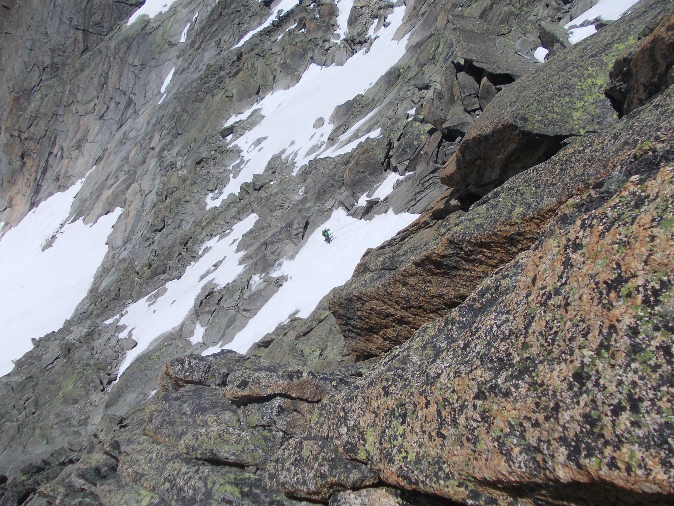 Ab etwa 2600 m ist die Schneedecke fast bis komplett geschlossen. Der Schnee trug auch während unseres verspäteten Abstiegs immer noch recht gut. Die bange Frage beim morgendlichen Zustieg war: würde der Fels halbwegs trocken sein? Er war es, und zwar voll und ganz!