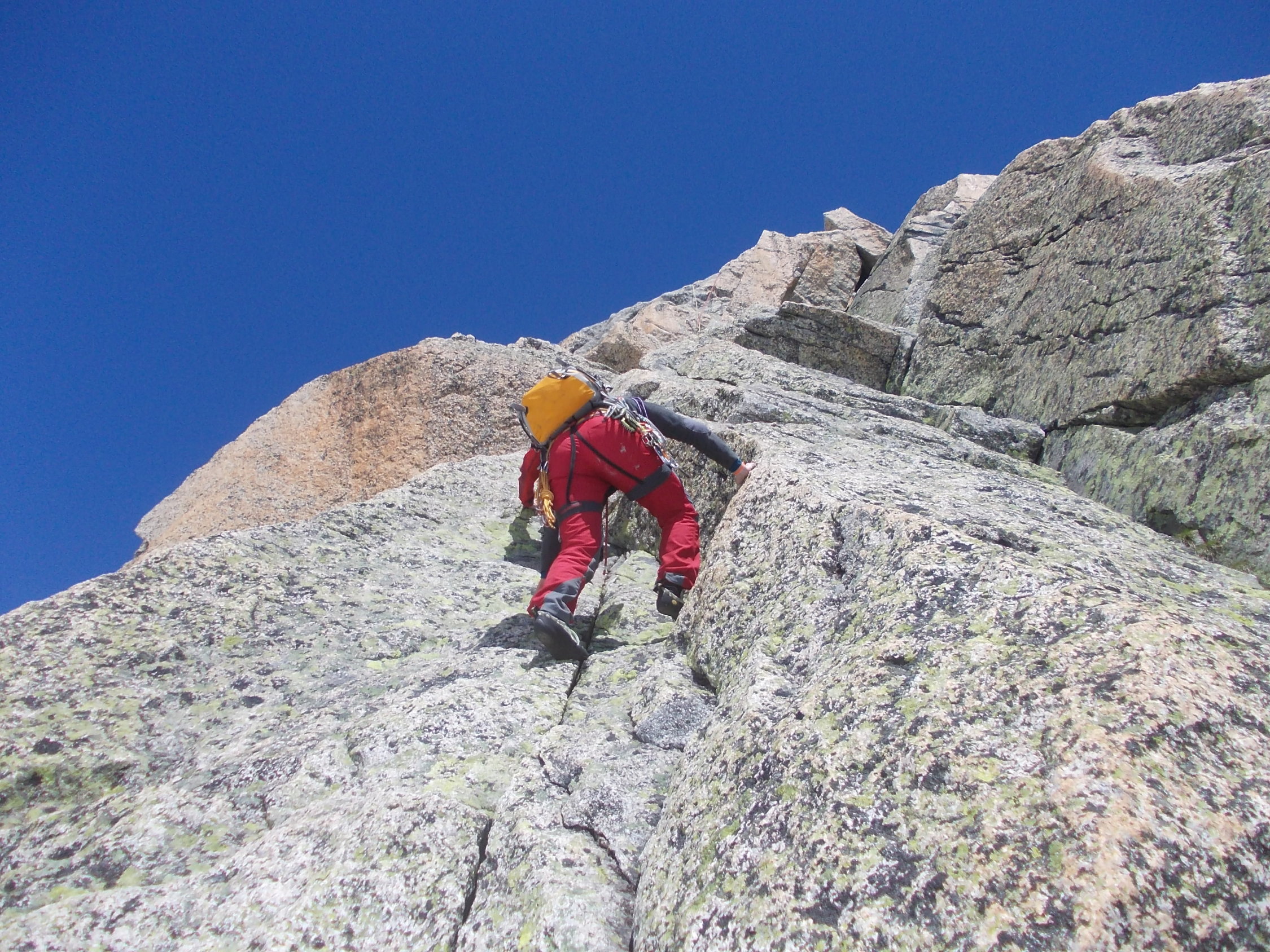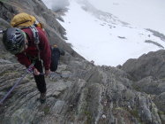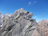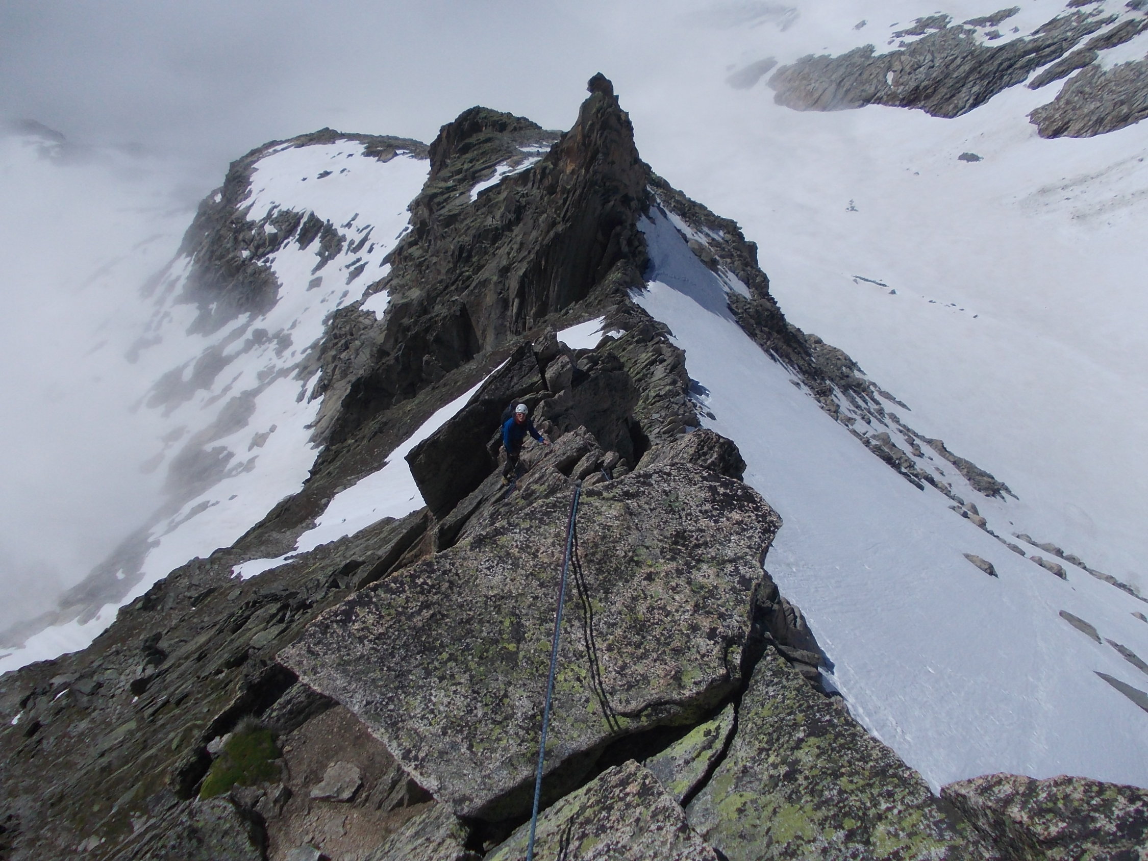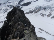 Insgesamt großartige alpine Klettertour, derzeit noch mit einem guten Schuß Hochtourencharakter. Die Steigeisen waren zumindest für die Steilflanke unterhalb des Einstiegs am Morgen nützlich. Ansonsten trugen wir diese im Nachhinein betrachtet zu Übungszwecken über den Grat :-).
