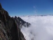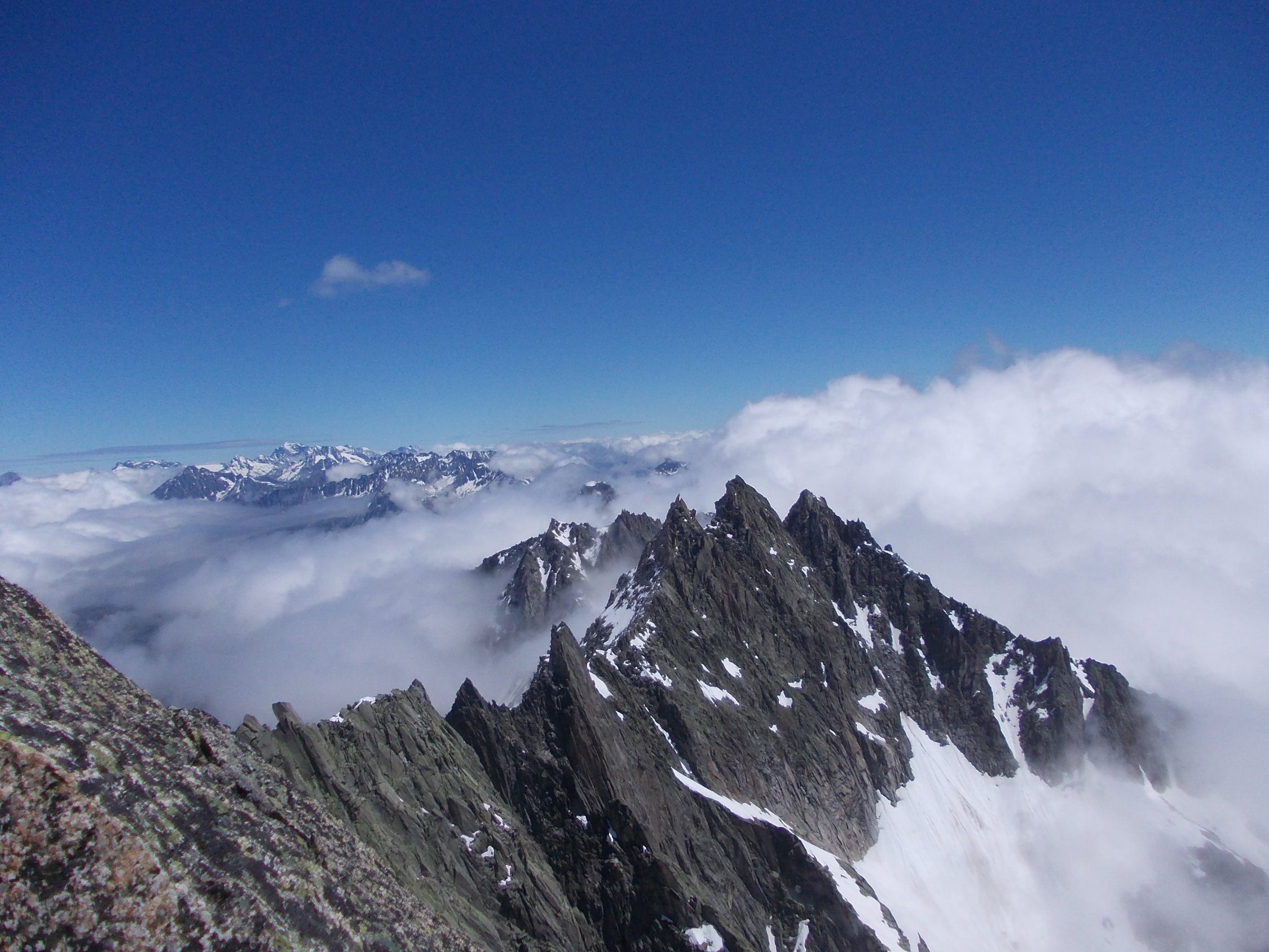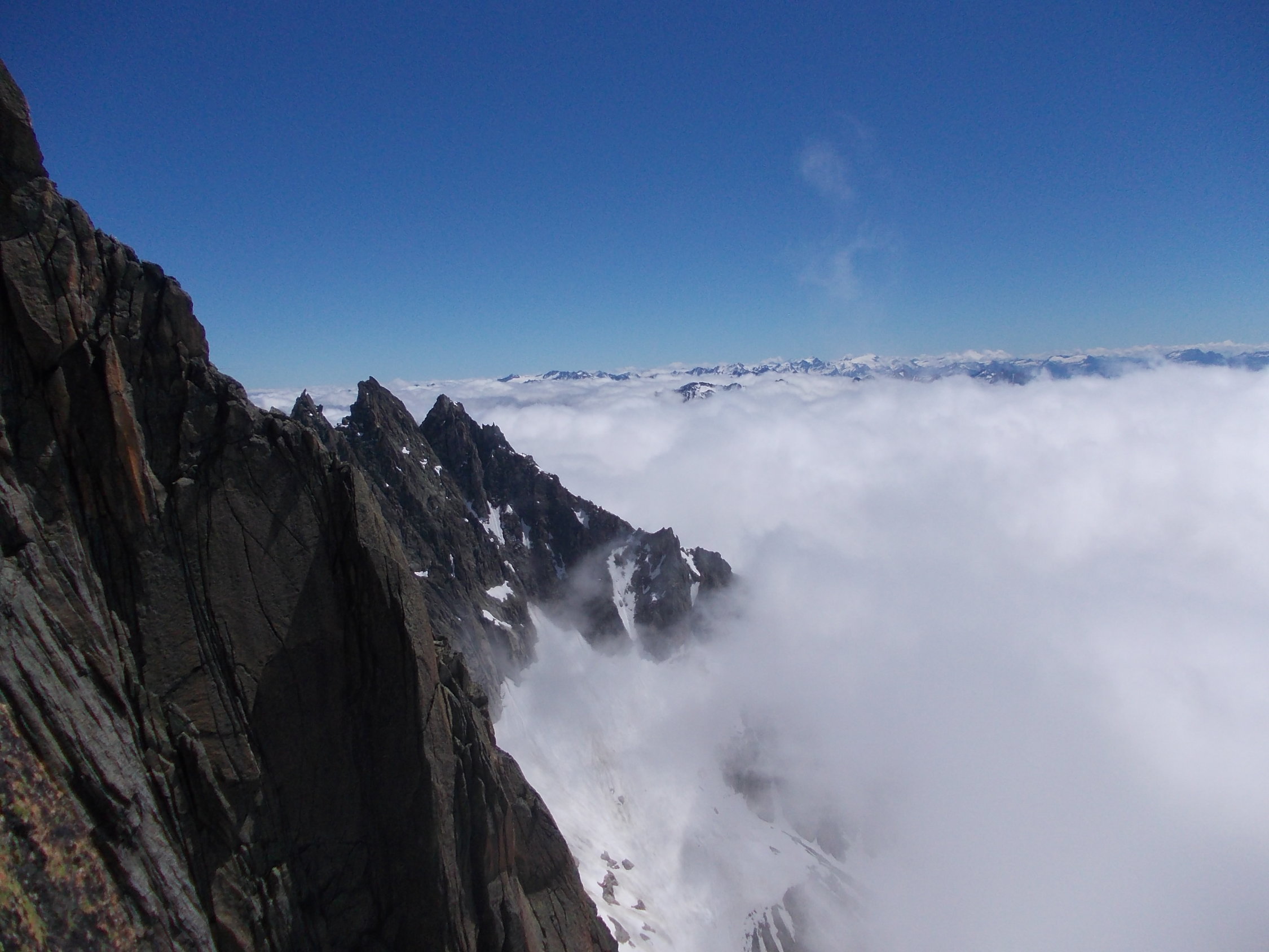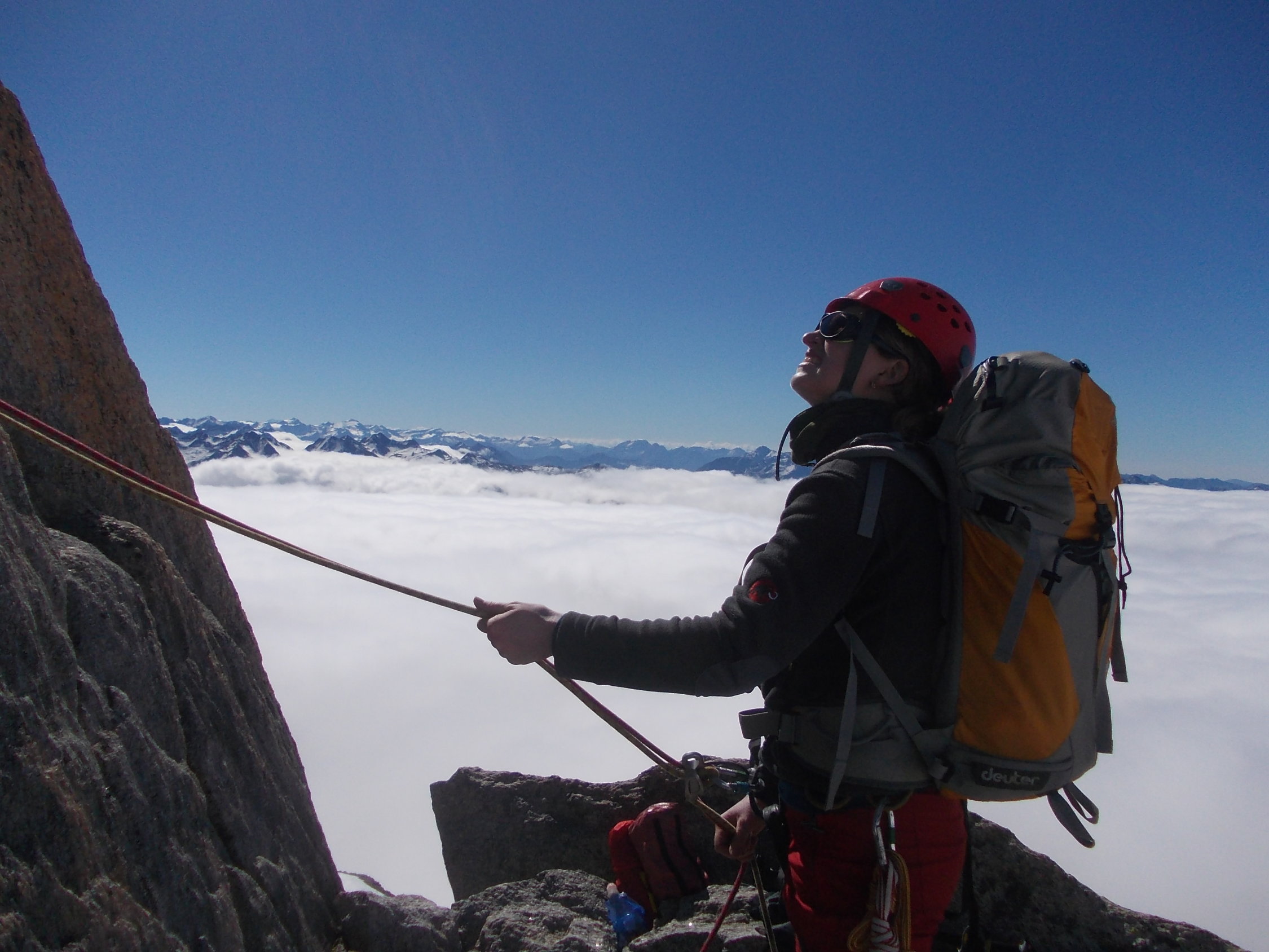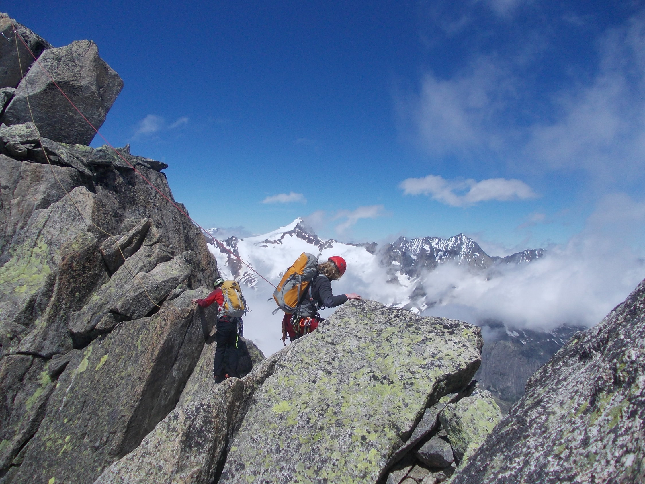 5.30 in der Früh Aufbruch vom Tätsch bei zähem Nebel und leichtem Nieseln. Erste Nebellichtungen mit Erreichen des Tiefengletschers. Ab Einstieg kletterten wir bis zum Finale auf dem Gipfel unter einem strahlend blauen Himmel in einer herbstlich anmutenden Inversionslage. Im Abstieg holte uns dann der Nebel wieder, der inzwischen deutlich über 3000 hinaufgekrochen war.