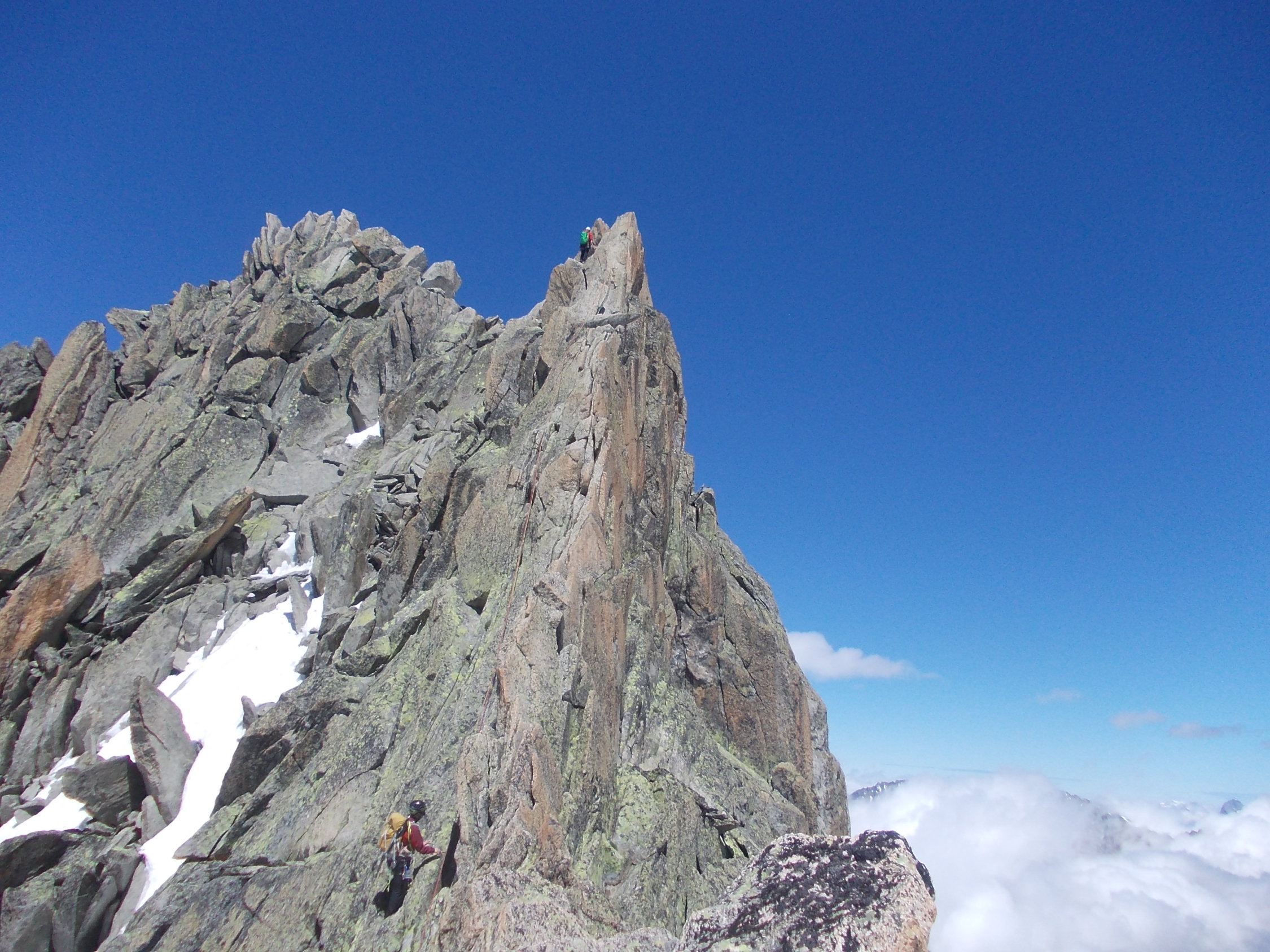 Weder Gedränge, noch lästige Überholmanöver trübten das Erlebns. Mit uns fast zeitgleich starteten noch eine Zweier- und eine Dreierseilschaft, später sichteten wir noch zwei "Späteinsteiger". die verschiedenen Gruppen verteilten sich in idealer Weise über die Route.