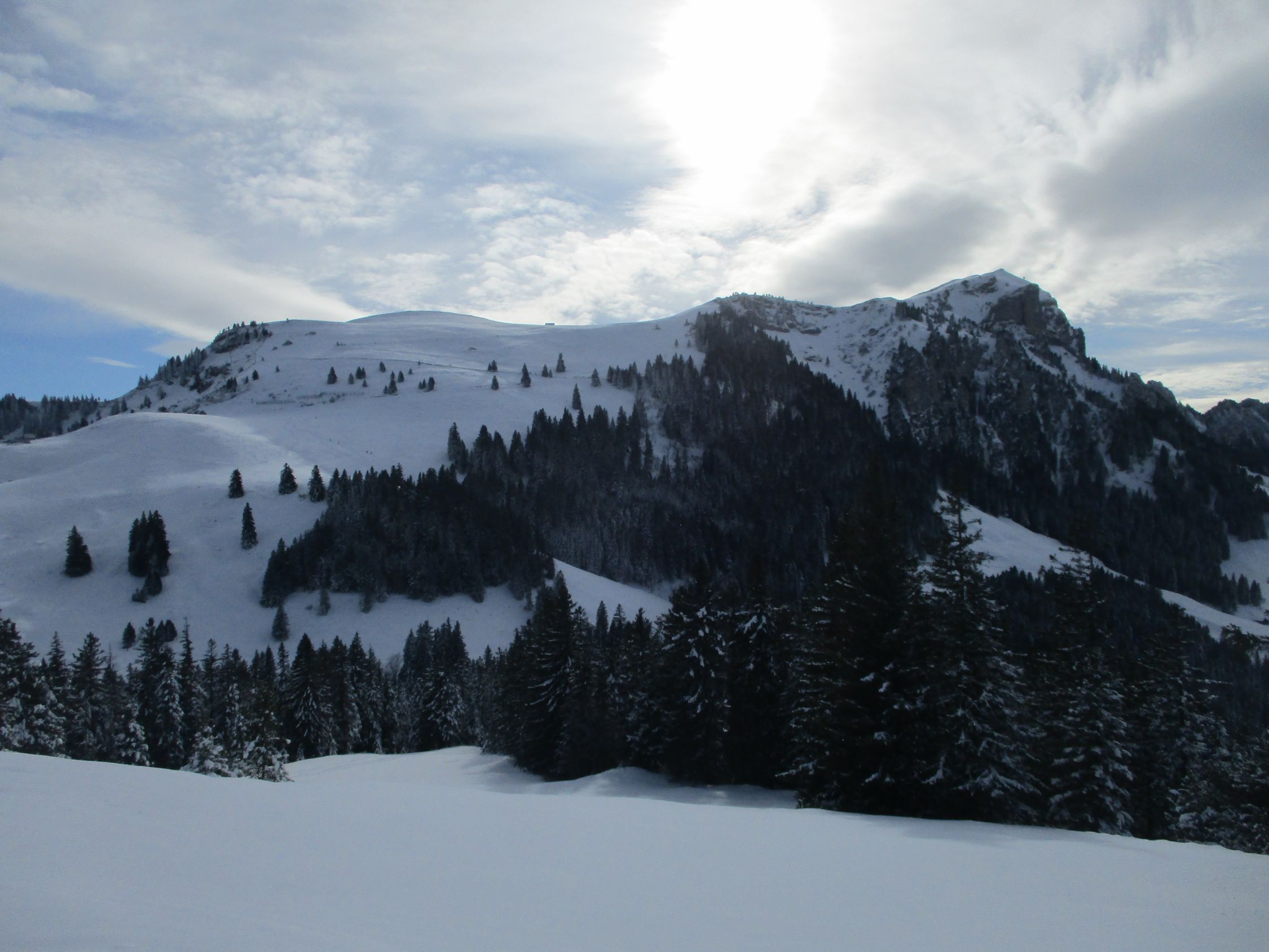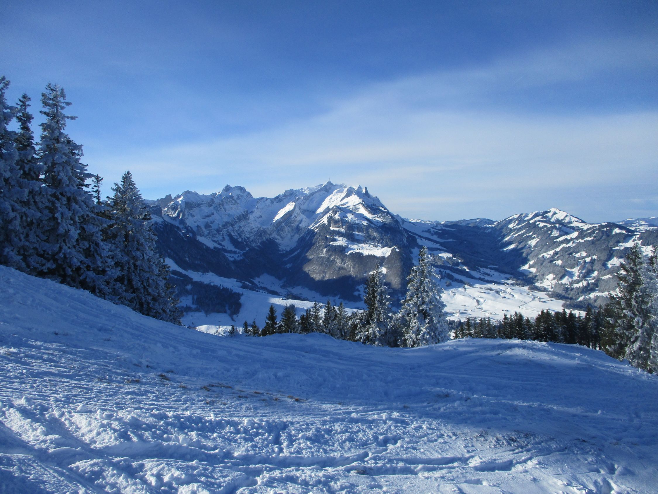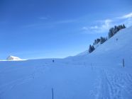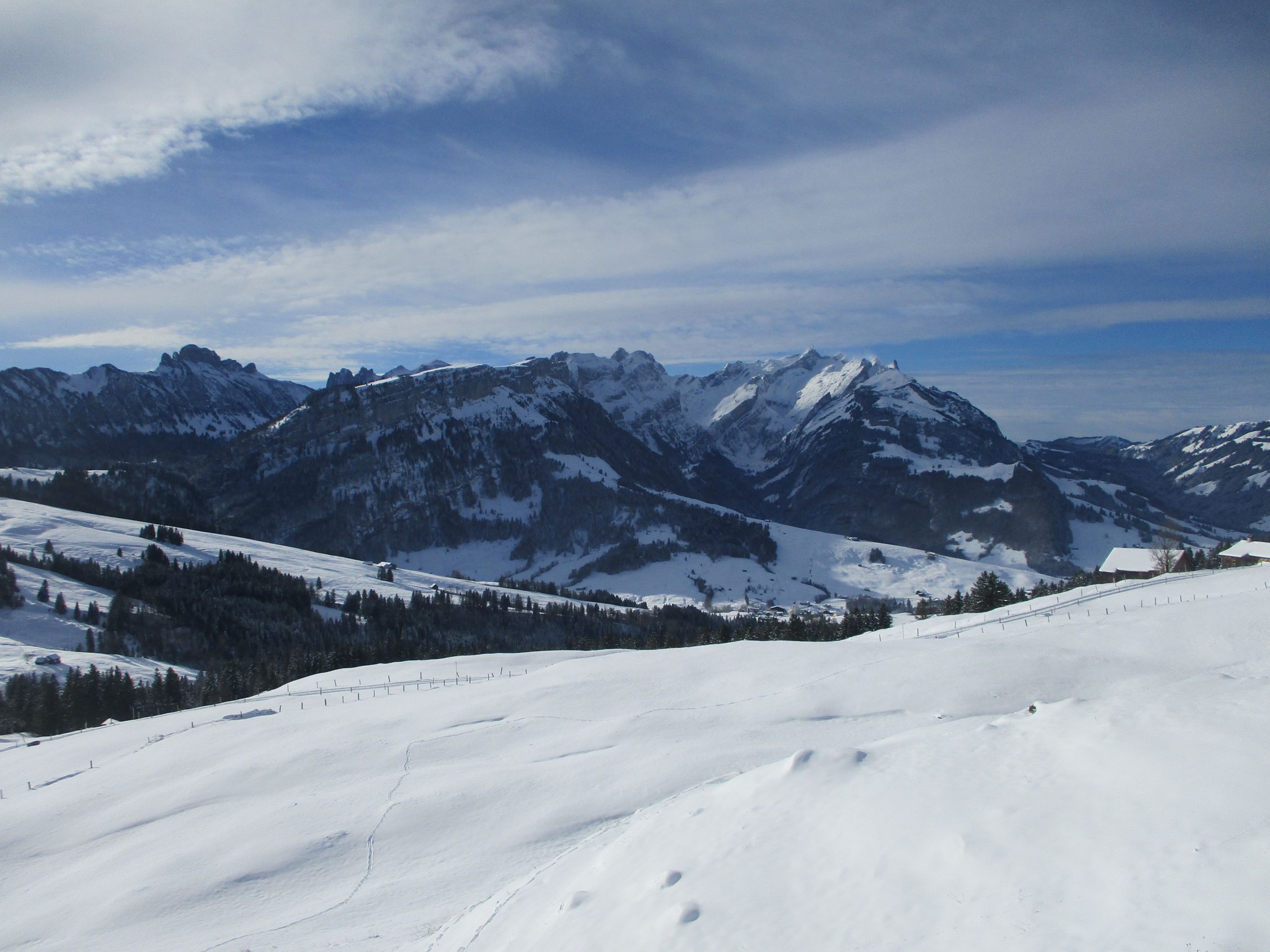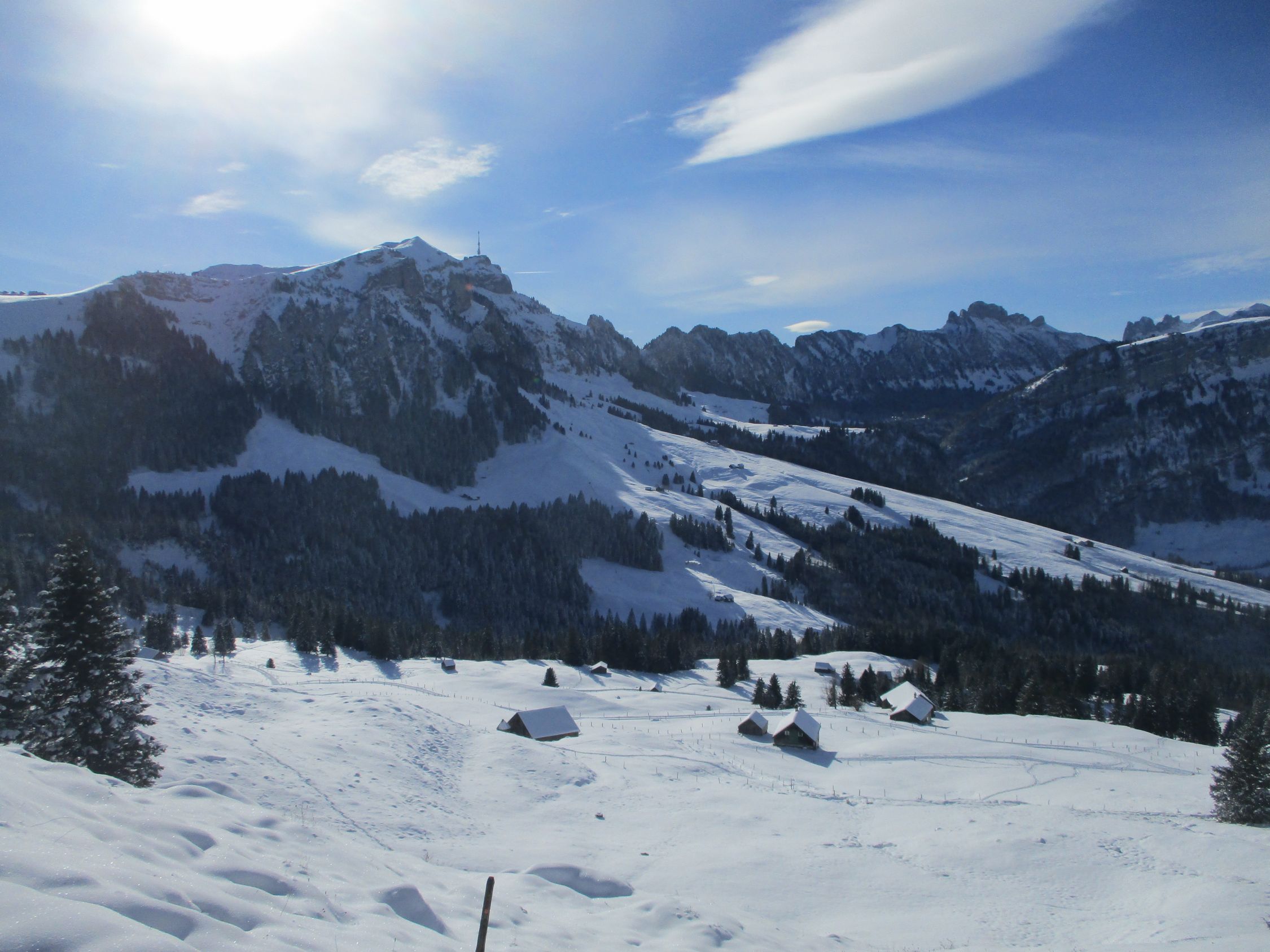 Ein herrlich sonniger Morgen. Ab ca. 11 h zogen die ersten Hochwolken rein, es blieb für die nächsten 2 h aber weiterhin überwiegend sonnig, Wettertechnisch war es im Vergleich mit gestern der bessere Tag hier im Appenzell. Mit der Schneeüppigkeit, wie gestern zwischen Kronberg und Schwägalp angetroffen, konnte diese Tour zwar nicht mithalten, dennoch waren heute auch einige Skifahrer auf der Route unterwegs.