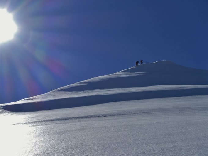 Die grosse Spaltenzone auf ca. 3300 m links gegen die Nordwand umgehen. Das heisst zwischen zwei grossen Spalten nach links queren und dann direkt ca. 100-150m am Rande der Nordwand hoch (ca.35-40°steil). Für den Abstieg haben wir im harten Firn Stufen geschlagen. Dann wieder rechts in etwas flacheres Gelände und dem linken oder rechten Grat schön auf den Gipfel folgen. Aktuell ist der linke Grat attraktiver zu begehen, d.h. der Sattel beim Klein Doldenhorn wird nicht begangen.