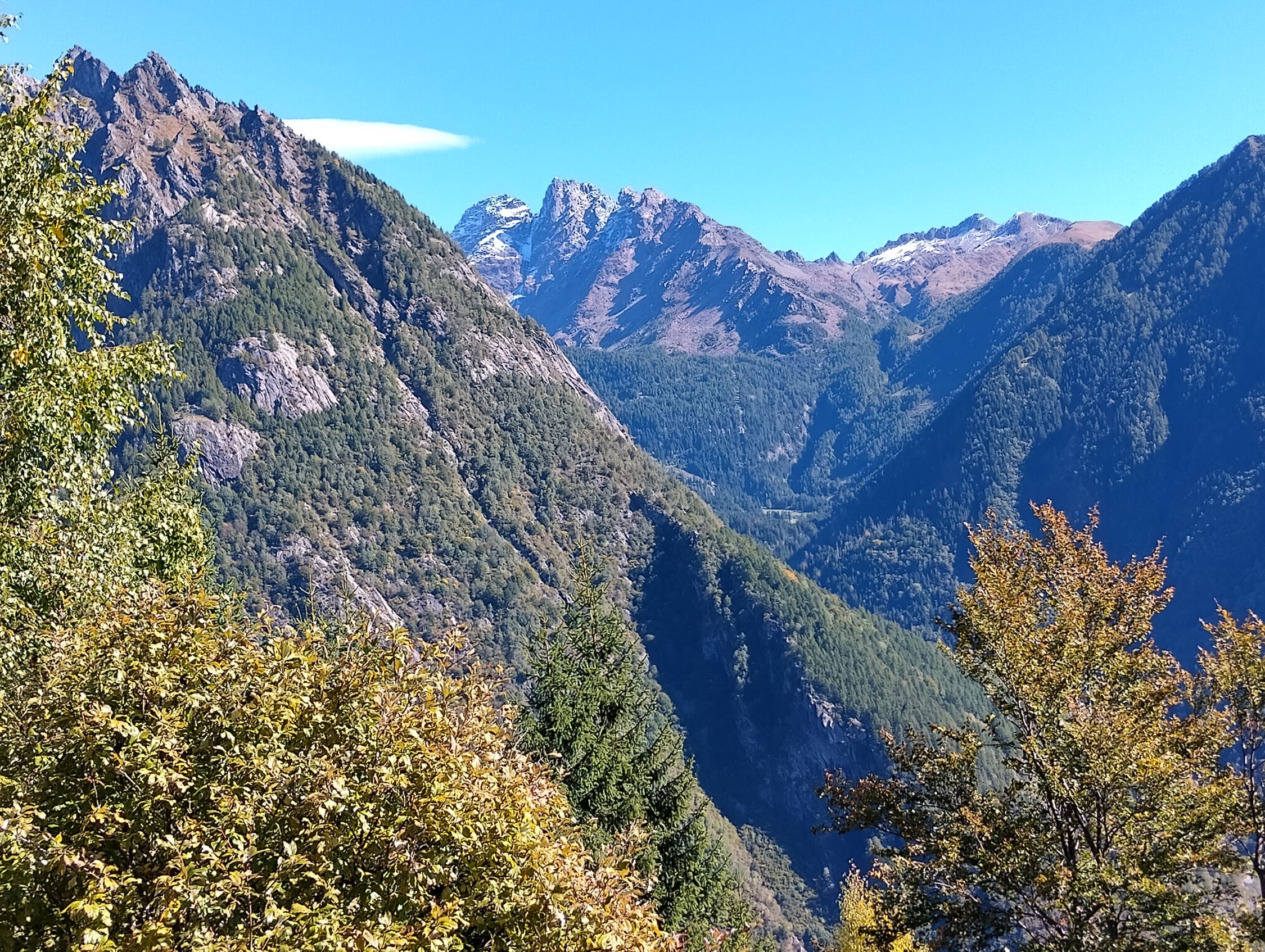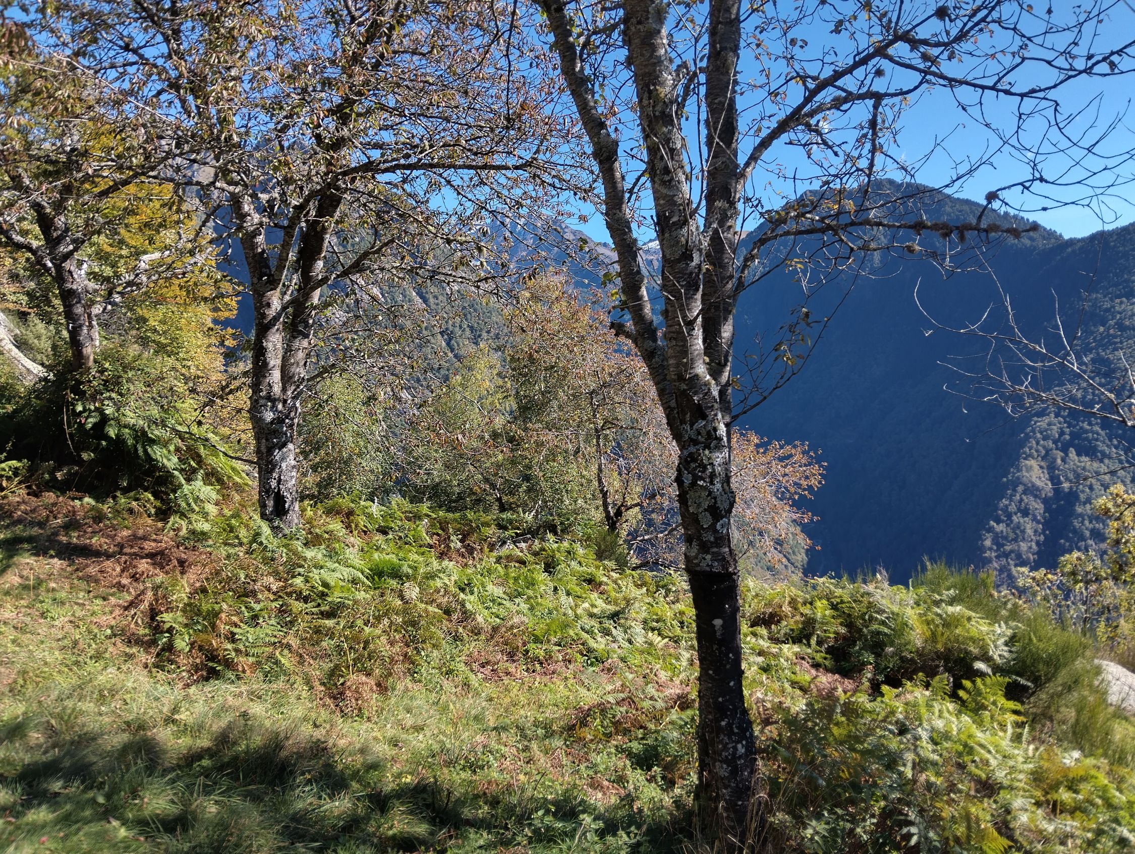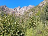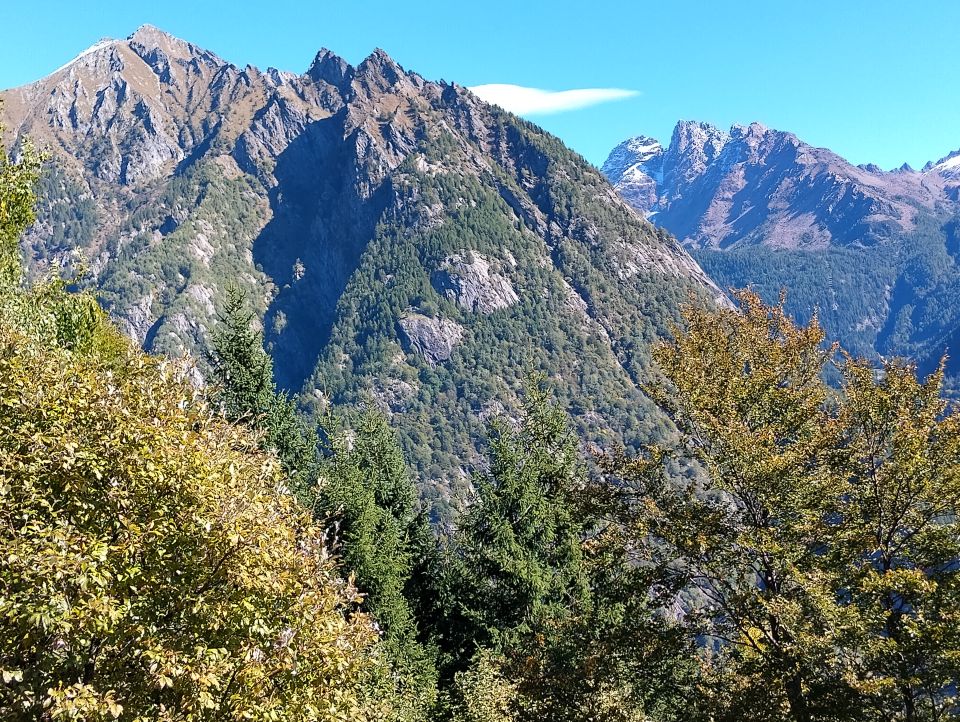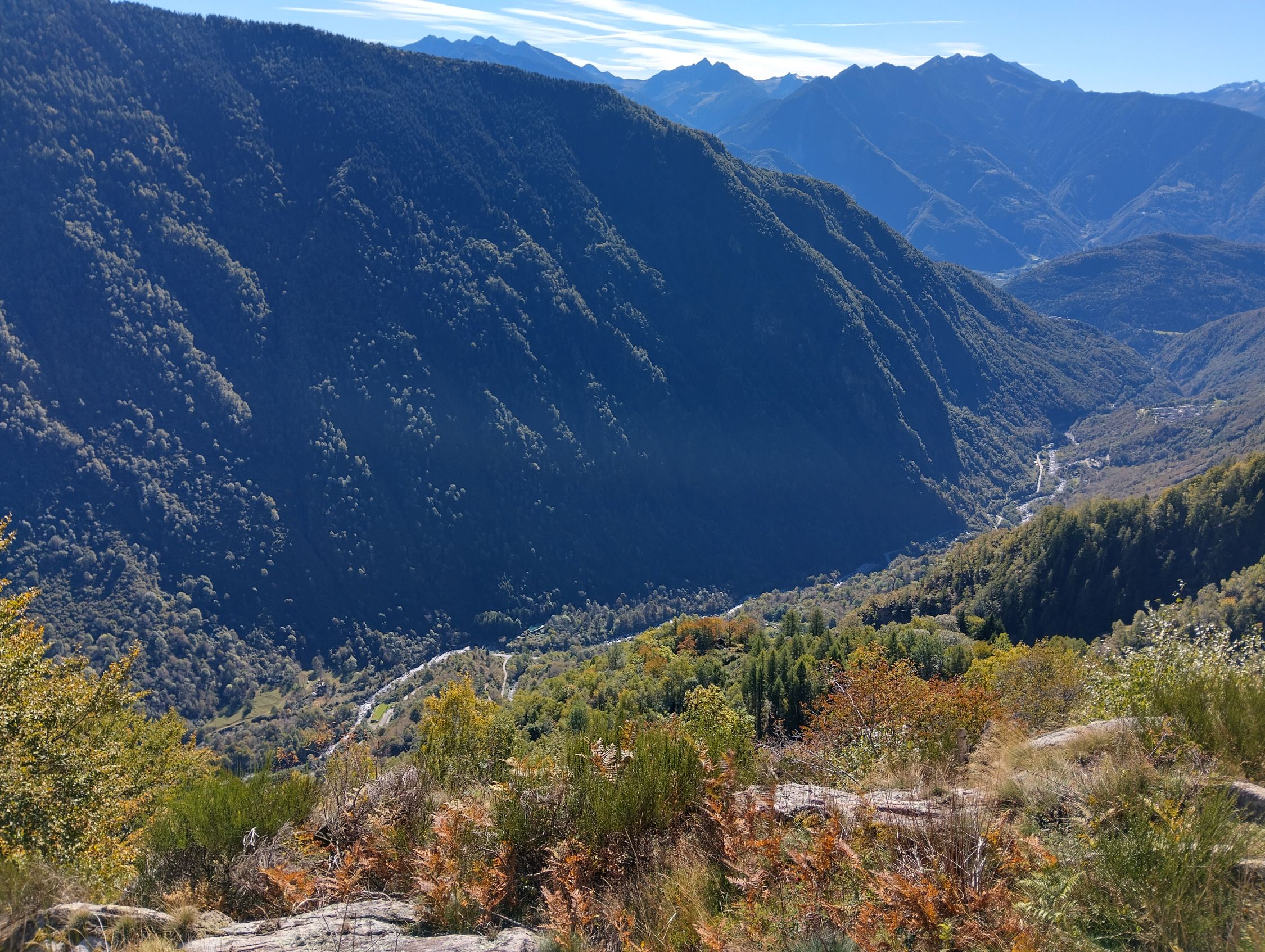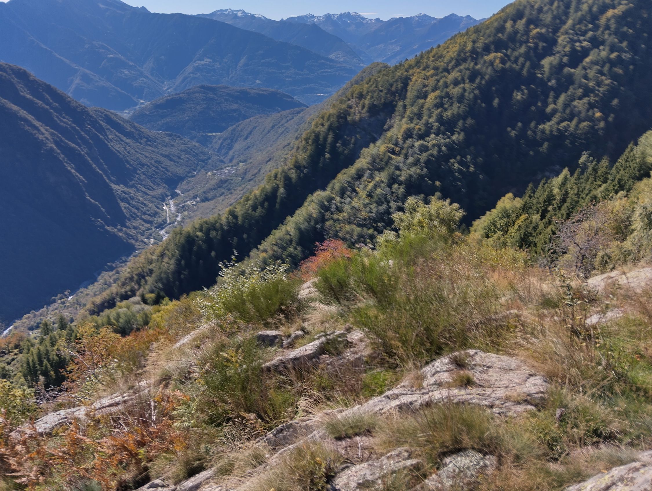 Das Hauptziel erreicht ist gemogelt. Wir wollten eigentlich auf dem alten Weg über Carponega - Sasso Bianco zum Lago Spluga. Wir konnten aber von Carponega den in der Schweizerischen Karte noch eingezeichneten Weg nicht finden. Etwas höher gibt es zwar einen Weg ins Tobel, der dem Schlauch für die Wasserversorgung folgt. Wie sahen aber keine akzeptable Möglichkeit, den Weg Richtung Saso Bianco zu finden, falls es Teile dazu überhaupt noch gibt. Die Felstrümmer durchsezte steile Flanke ist derart mit Macchia überwachsen, dass ein Passieren ohne Weg praktisch aussichtslos ist. Man kommt nur im Wald einigermassen voran ohne Weg, wenn es nicht zu steil wird.
