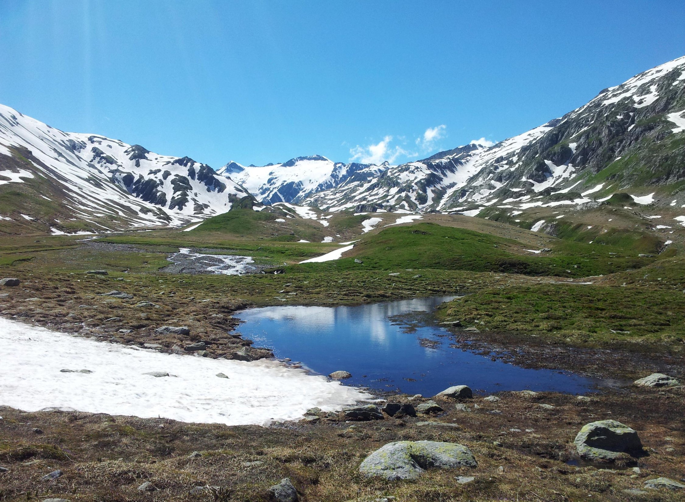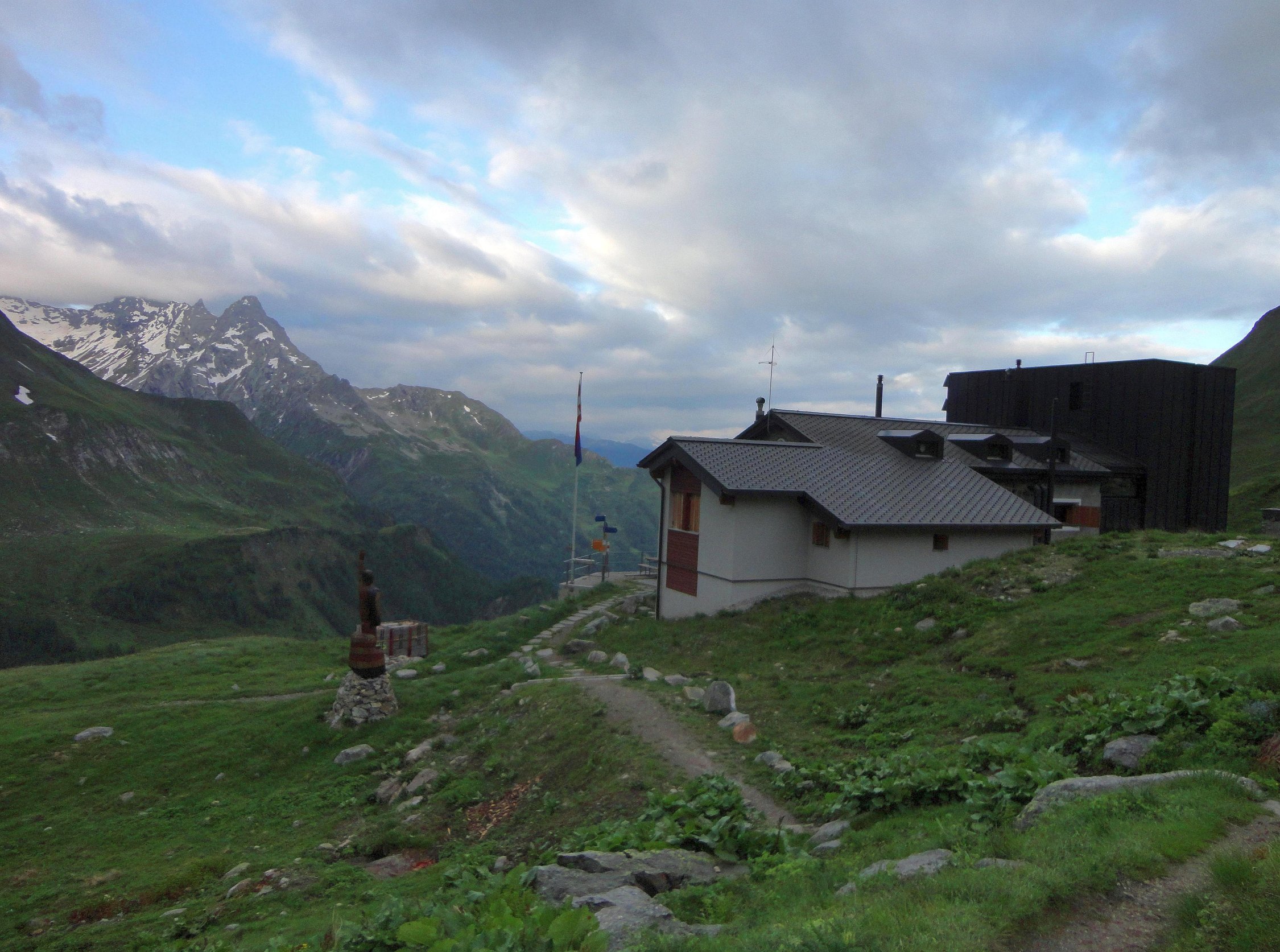 Wir sind tags zuvor von Puzzatsch (oberhalb von Vrin, wenige Parkplätze am Strassenende) über den Pass Diesrut und die Terrihütte zur Cap. Motterascio aufgestiegen. Die Greina-Ebene ist zur Zeit Idylle pur mit Tümpeln, Schneeflecken, Wasserfällen, Steinbockrudeln, regem Murmelverkehr und Blumenwiesen. Insofern liess sich das fehlende Gipfelpanorama ganz gut verschmerzen.