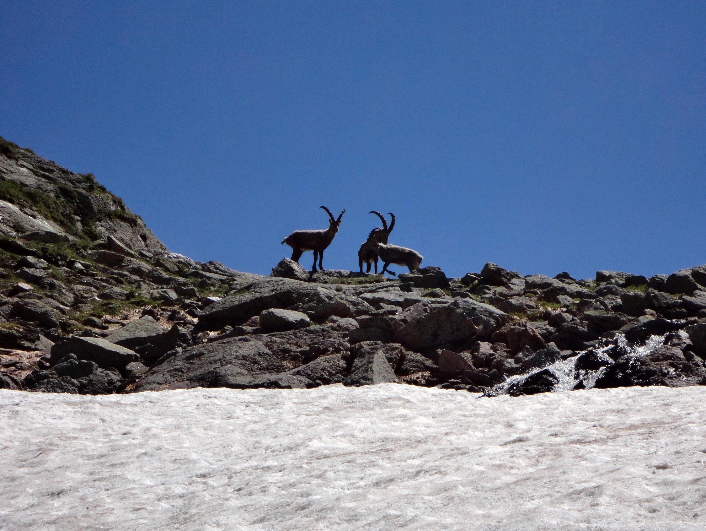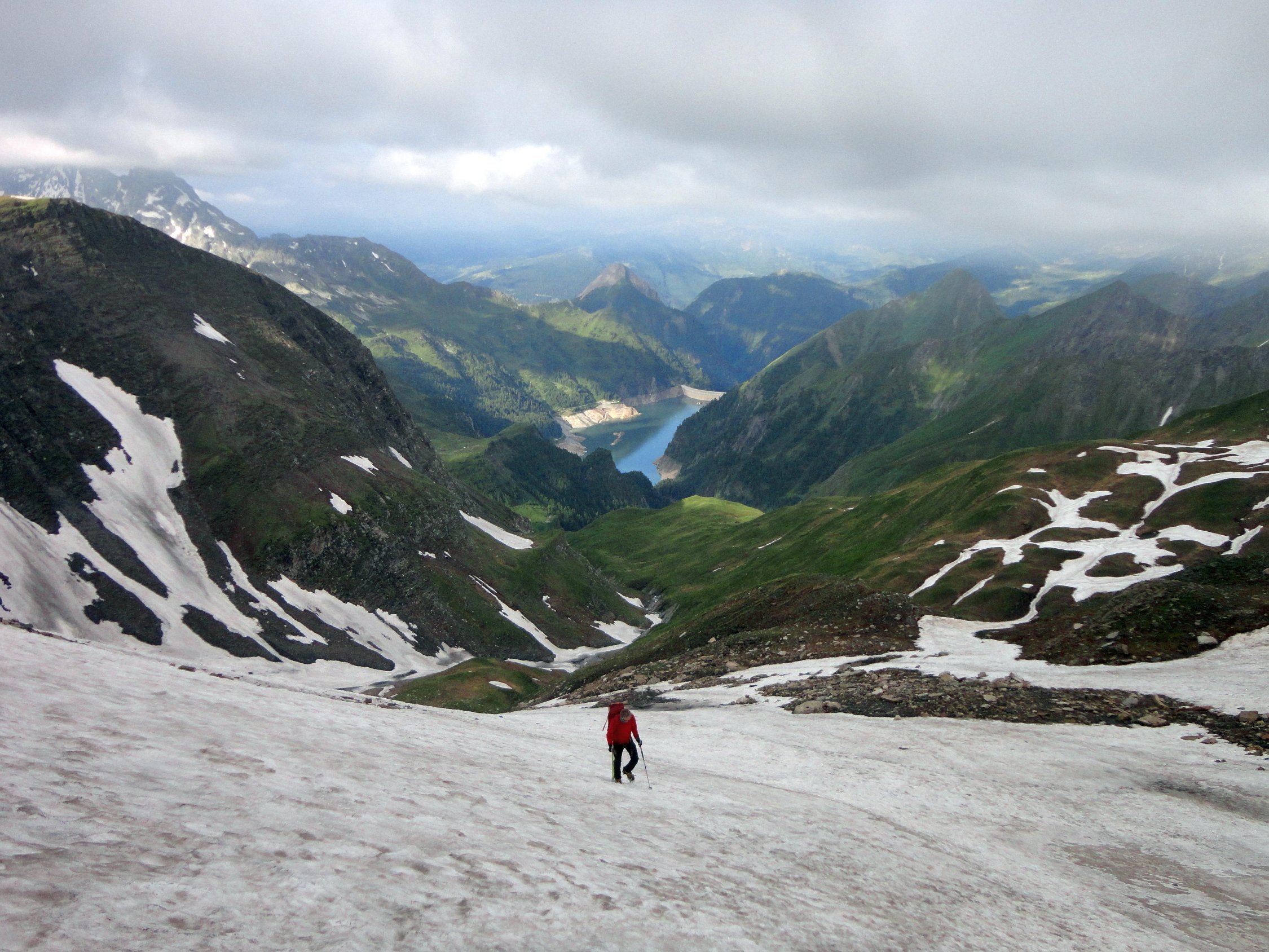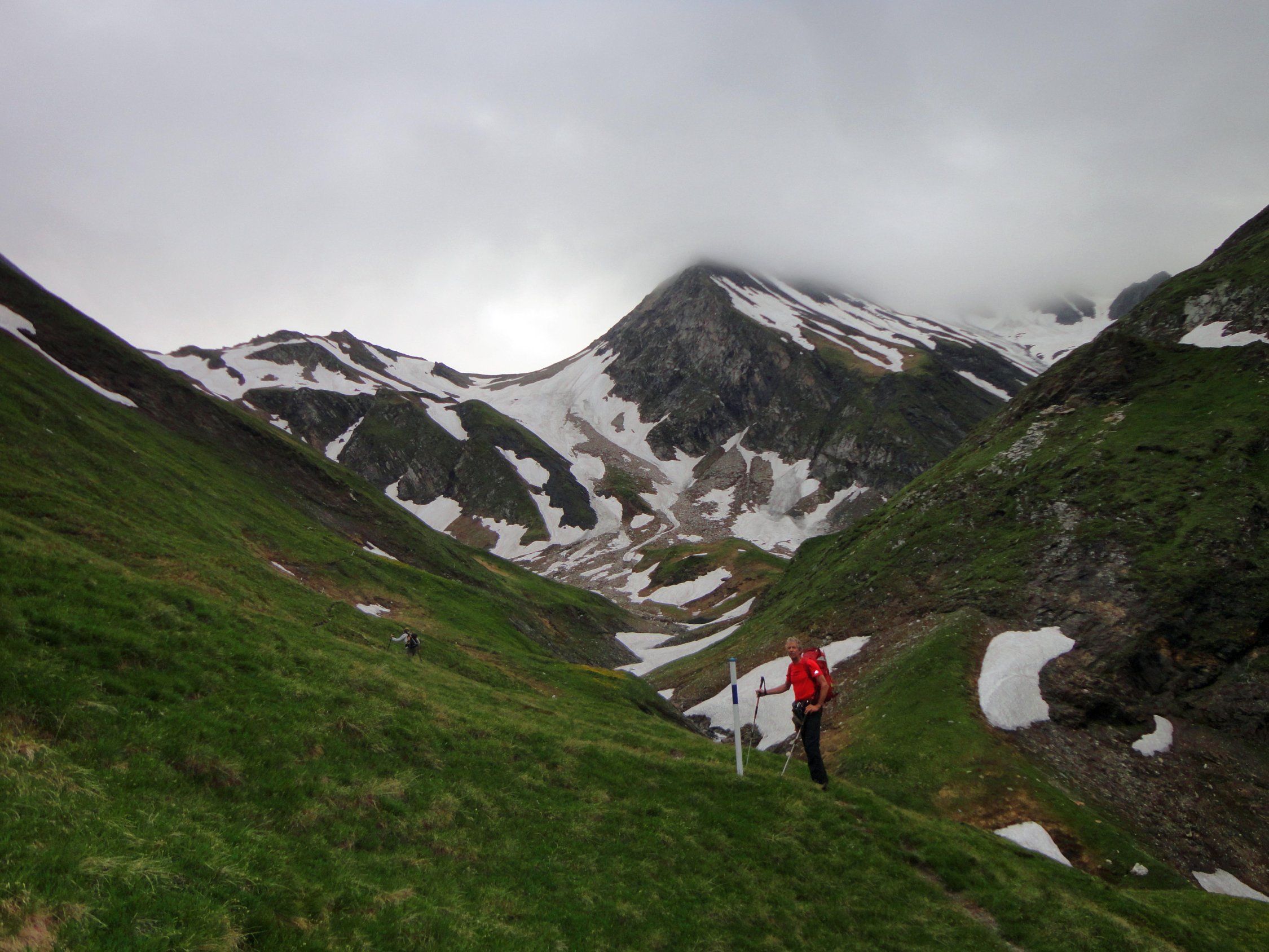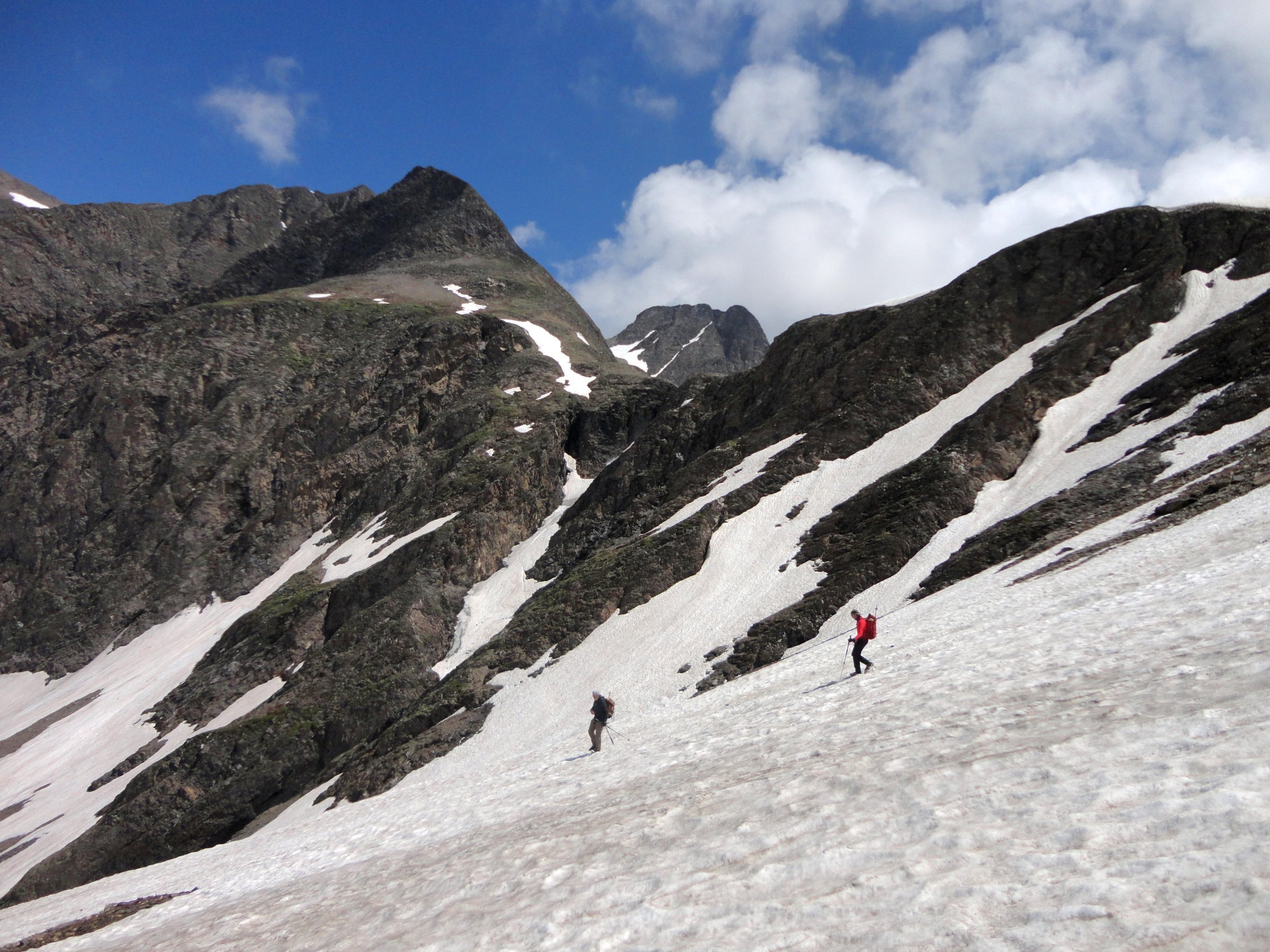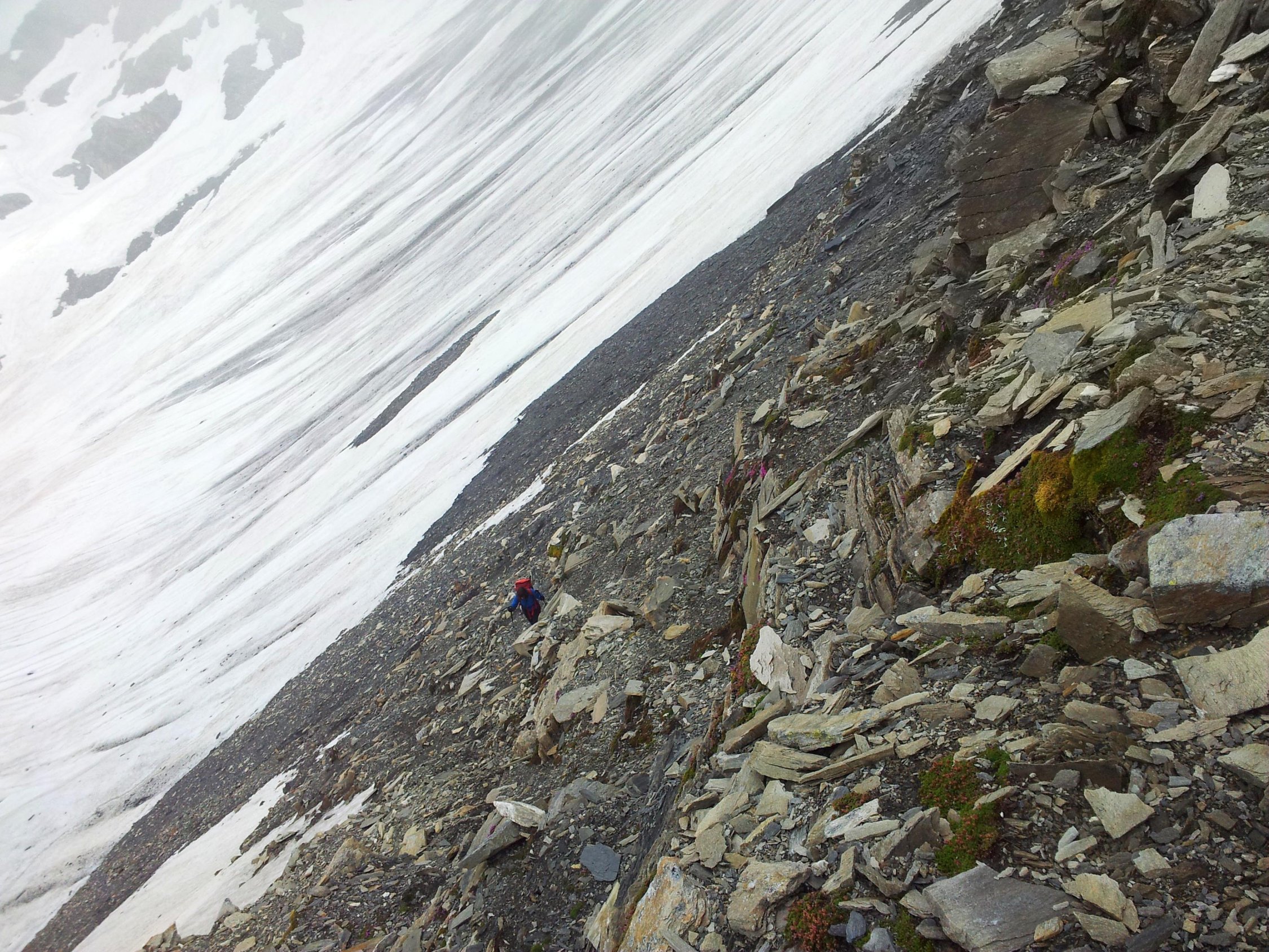 Auf der Südseite unterhalb des Sattels noch Restschneefelder über etwa 150 hm, auf der Nordseite noch Schnee bis in´s Val Canal auf ca. 2.400 m, Steigeisen und ggf. Pickel daher zweckmässig. Bei uns war der Schnee nach warmer Nacht allerdings so weich, dass man gut ohne Steigeisen in´s Val Canal absteigen konnte.