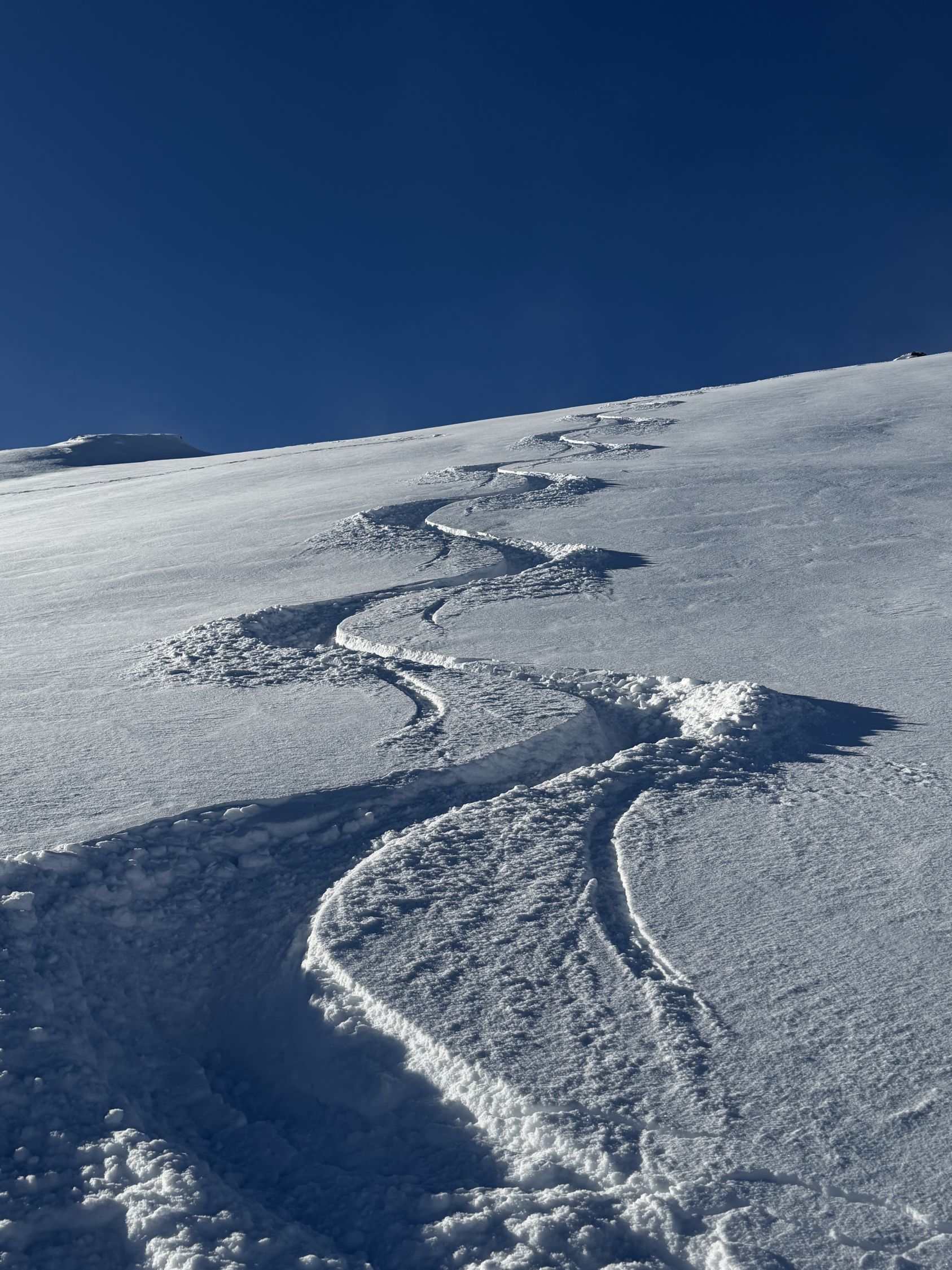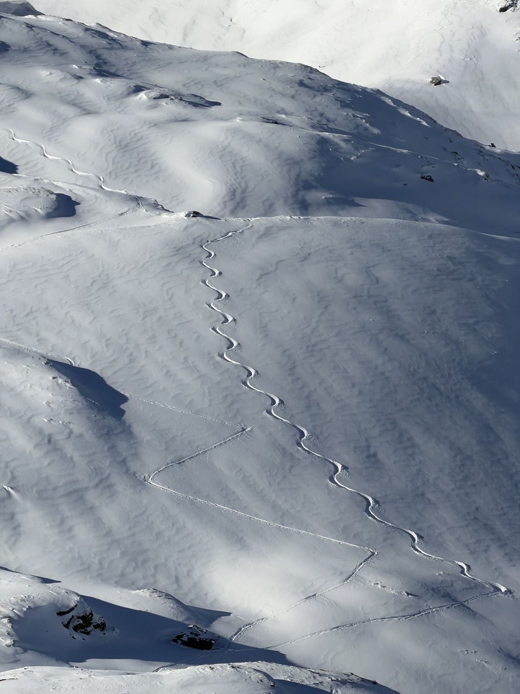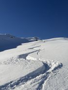 Unten noch sehr wenig Schnee und Steinskigelände (das Material muss einem egal sein) - oben Traumpulver und nur noch eine Person außer mir unterwegs.
