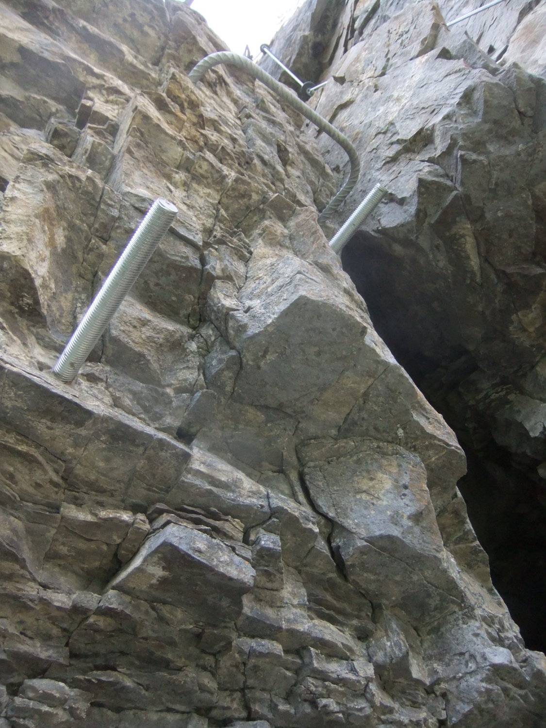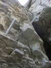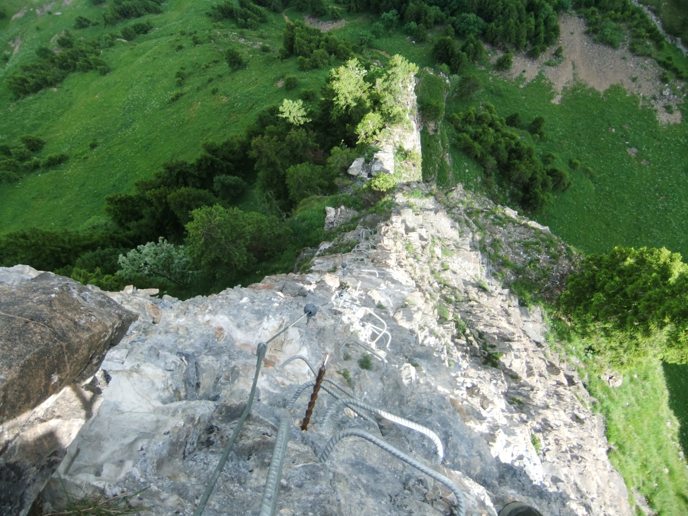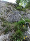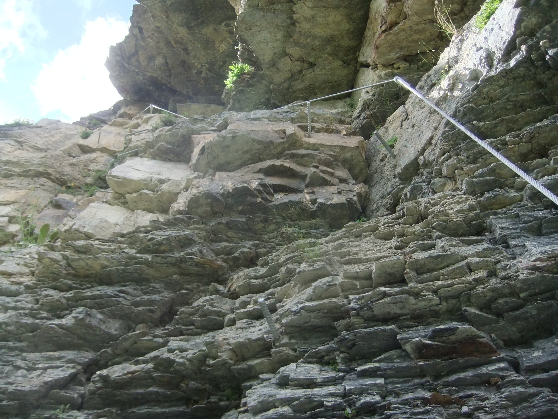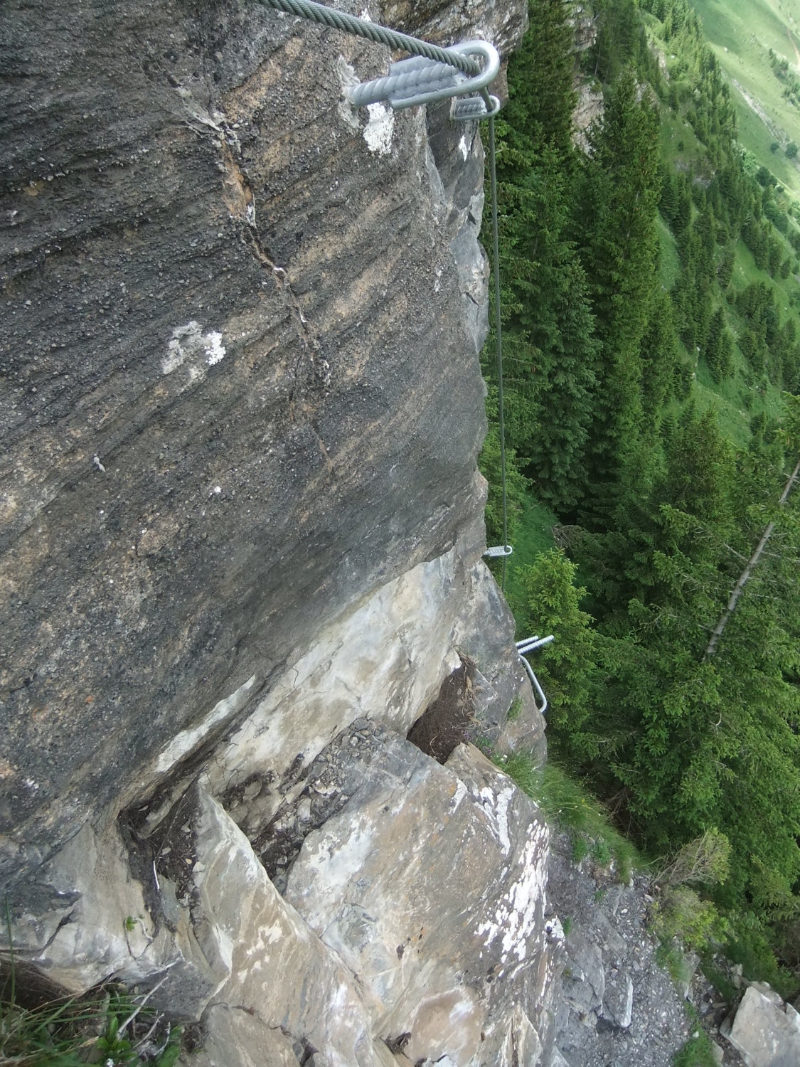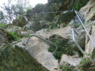 Wegen der vielen Felsbänder liegt dort viel Splitt und Gestein, welches unweigerlich von Vorausgängern, oder Tieren abgeräumt wird. Die Reisschüssel auf dem Kopf ist also wirklich wichtig. Ich habe aber gewisse Befürchtung, daß dieser Steig pflegeintensiv werden wird. Denn die großen Eisenbügel stecken in nicht gerade bombenfestem Gestein. Die in ungewöhnlicher Weise oftmals vertikal montierten Eisenbügel sind allerdings wesentlich resistenter gegenüber Schnee- und Geröllabgänge im Gegensatz zu horizontal eingedübelten. Mein Dank gilt allen Beteiligten und Befürwortern dieser Kletteranlage.