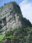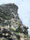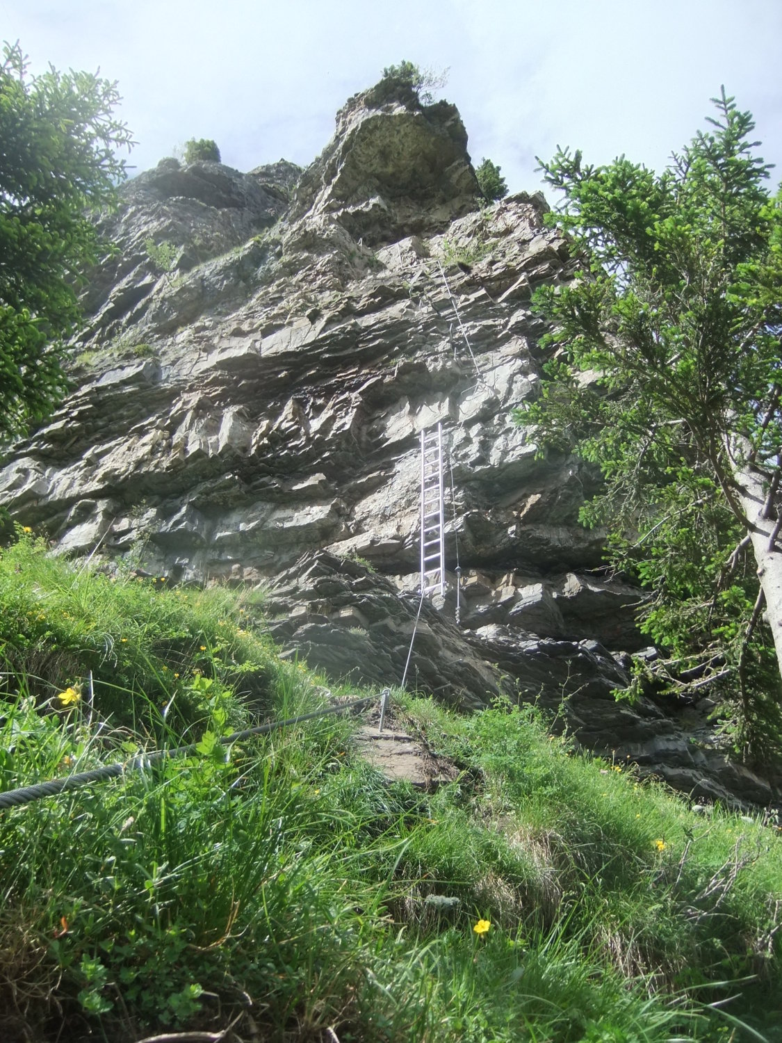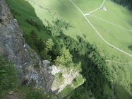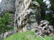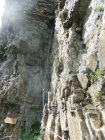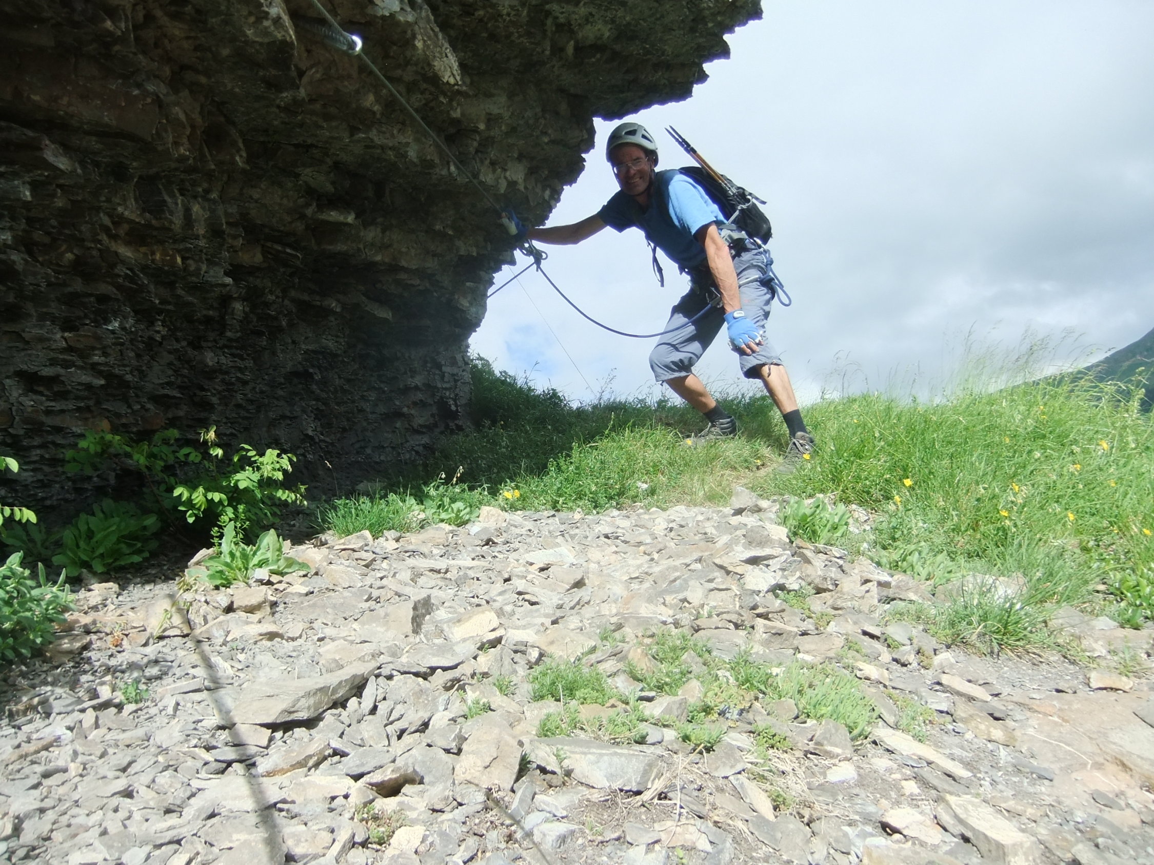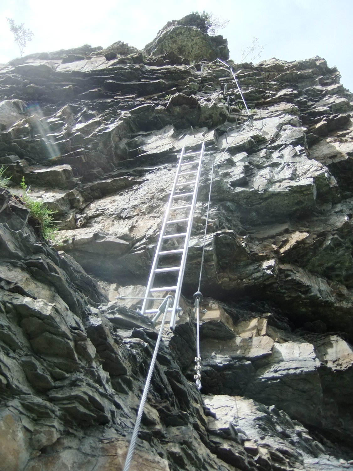 Wegen der vielen Felsbänder liegt dort viel Splitt und Gestein, welches unweigerlich von Vorausgängern, oder Tieren abgeräumt wird. Die Reisschüssel auf dem Kopf ist also wirklich wichtig. Ich habe aber gewisse Befürchtung, daß dieser Steig pflegeintensiv werden wird. Denn die großen Eisenbügel stecken in nicht gerade bombenfestem Gestein. Die in ungewöhnlicher Weise oftmals vertikal montierten Eisenbügel sind allerdings wesentlich resistenter gegenüber Schnee- und Geröllabgänge im Gegensatz zu horizontal eingedübelten. Mein Dank gilt allen Beteiligten und Befürwortern dieser Kletteranlage.
