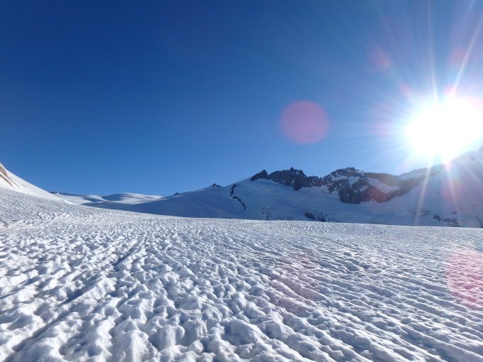 Nach einer klaren Nacht war der Schnee bis fast am Mittag hart.Ca 1 Stunde Ski tragen,sind aber in der Abfahrt bis 2350 Meter am Gletscherrand abgefahren(so hat sich der Rückmarsch auf ca. 30 Minuten beschränkt).Vom Gipfel bis ca 2900 Meter waren die Verhältnisse top.Im mittleren Teil etwas aufgeweichte Rüttelpiste!