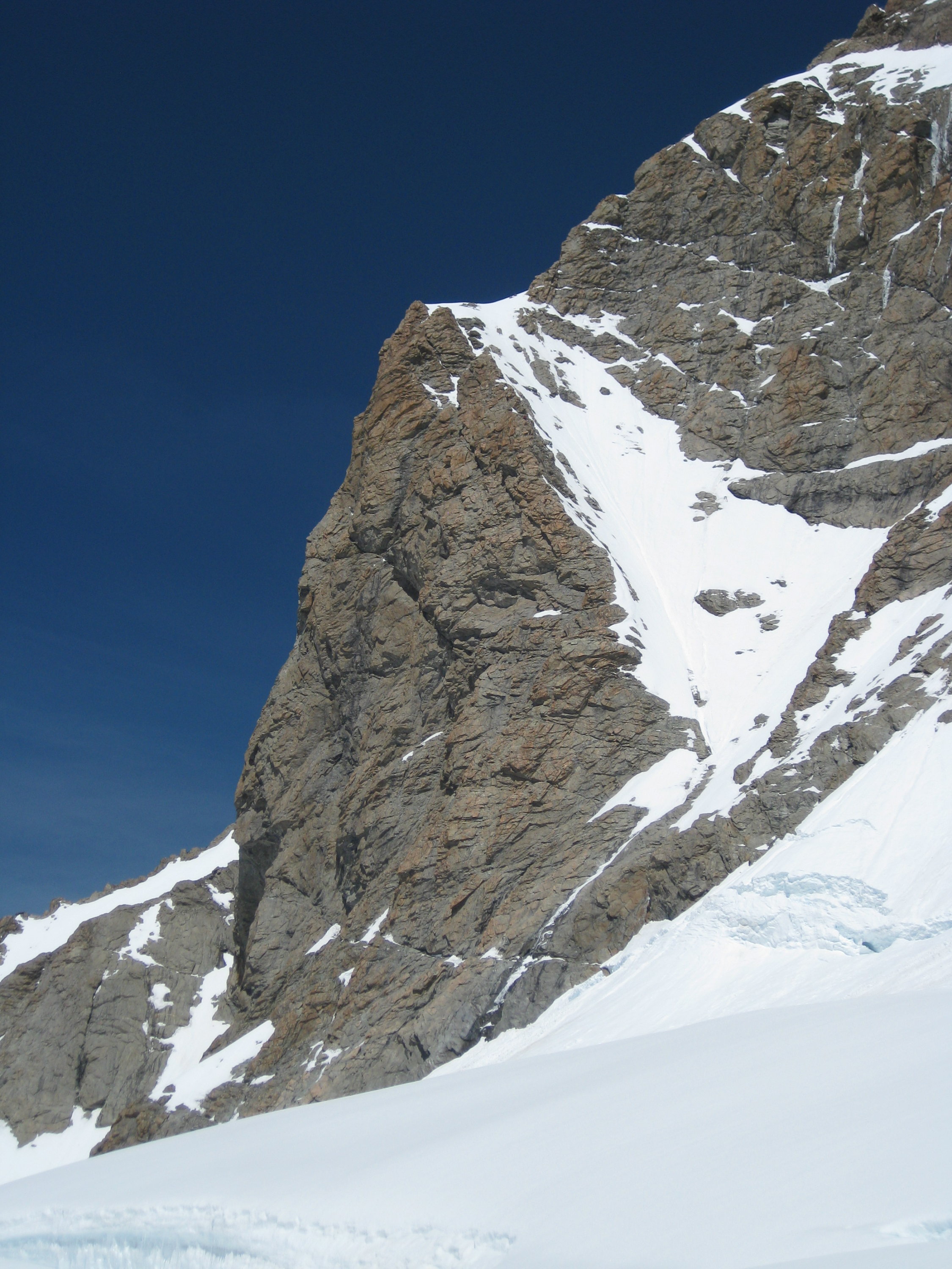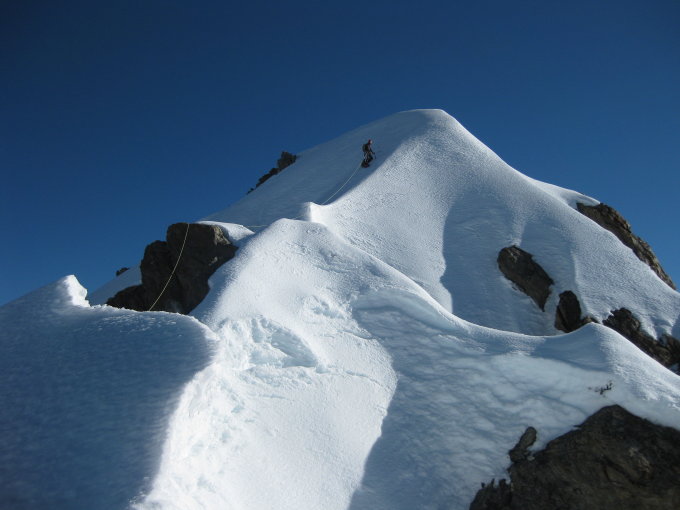 Es liegt noch viel Schnee, auch am Grat, den wir komplett mit Steigeisen geklettert sind. Die Querung zum Gletscher war gut. Kein Blankeis. Haken waren teilweise noch eingeschneit, was insbesondere für den Einstieg nach der Randkluft gilt. Bei Sonnerneinstrahlung rumpelt es ein wenig. Am besten beim Abstieg auf dem Fels bleiben.