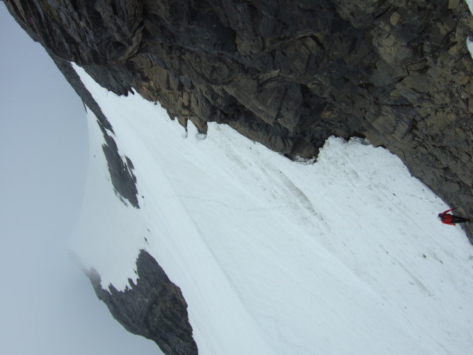 Sowohl in den Bändern, als auch in der Ausstiegsflanke gegen den Grat für diese Jahreszeit sehr viel Schnee. Besonders in den Bändern muss teilweise bis ca. 50° und anhaltend über Schneereste gequert werden. Die Ketten in der Firnflanke sind noch komplett eingeschneit. Am Grat auf Wächten achten. Der Schnee ist teilweise verfirnt, muss aber auch zum Teil bis zur Hüfte durchwühlt werden. Mit der jetzt angelegten Spur sicher einfacher zu begehen. Besonders die Routenfindung nach den Bändern bei Nebel sollte bei diesen Verhältnissen nicht unterschätzt werden. Heute war bis auf den Gipfel nur Nebelsuppe
