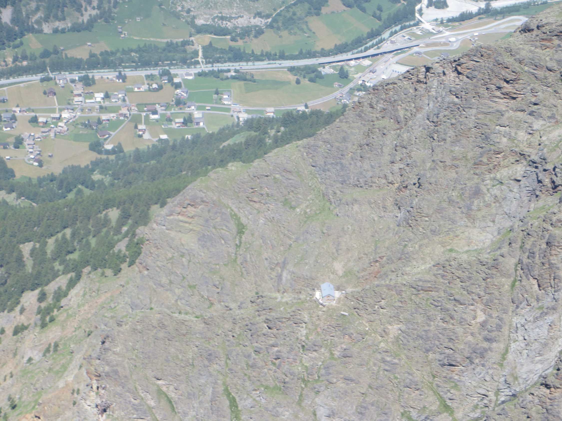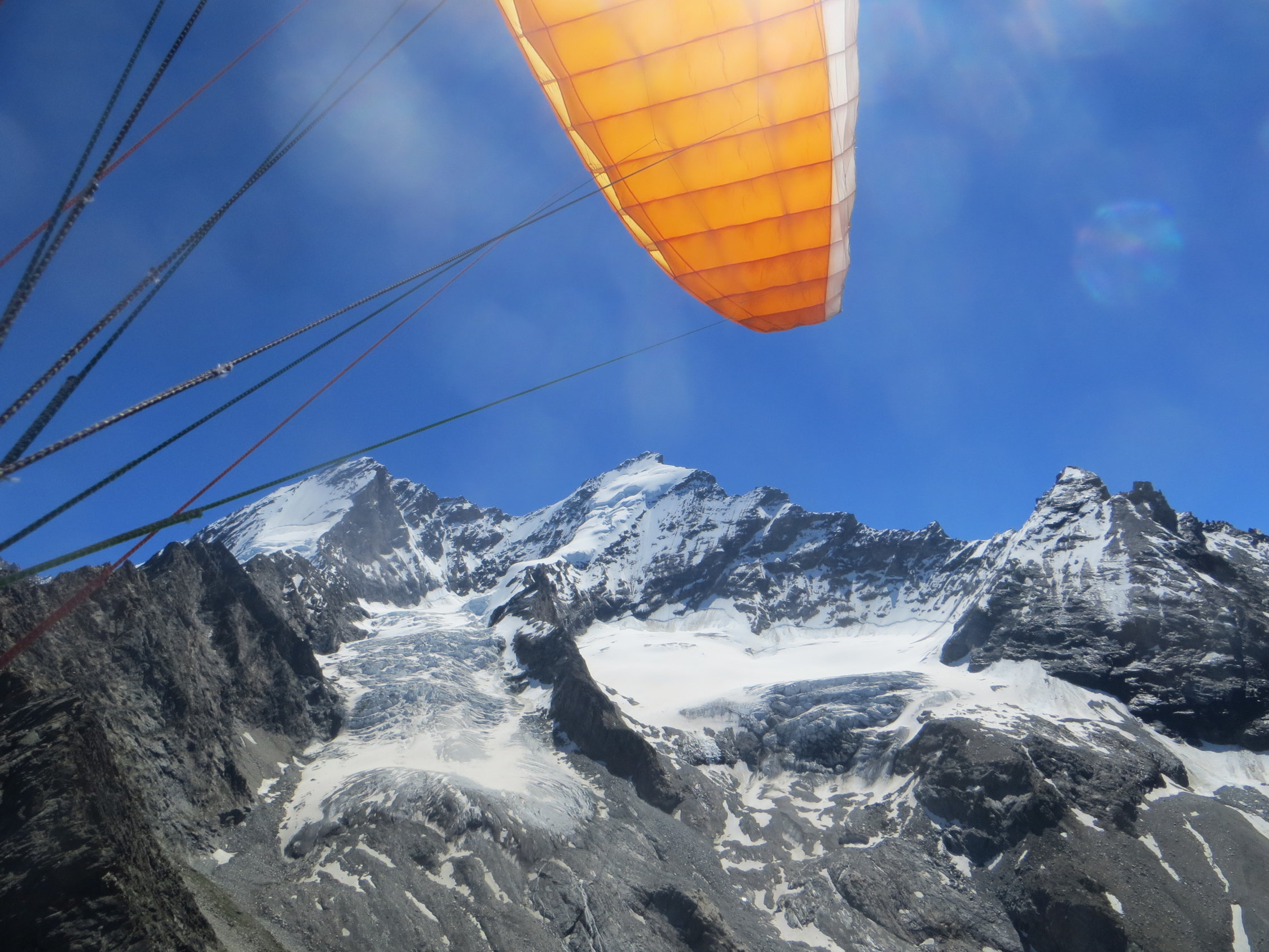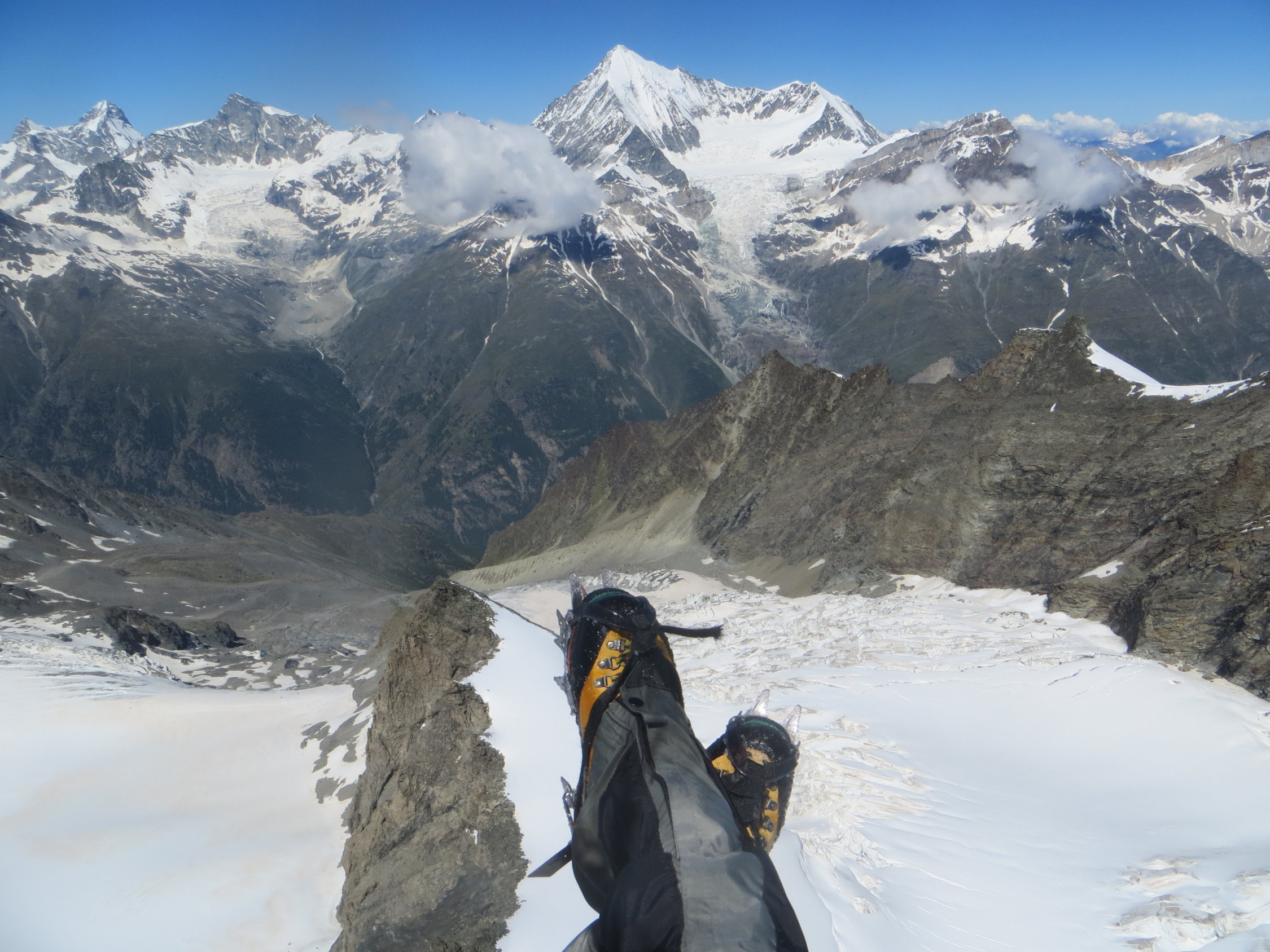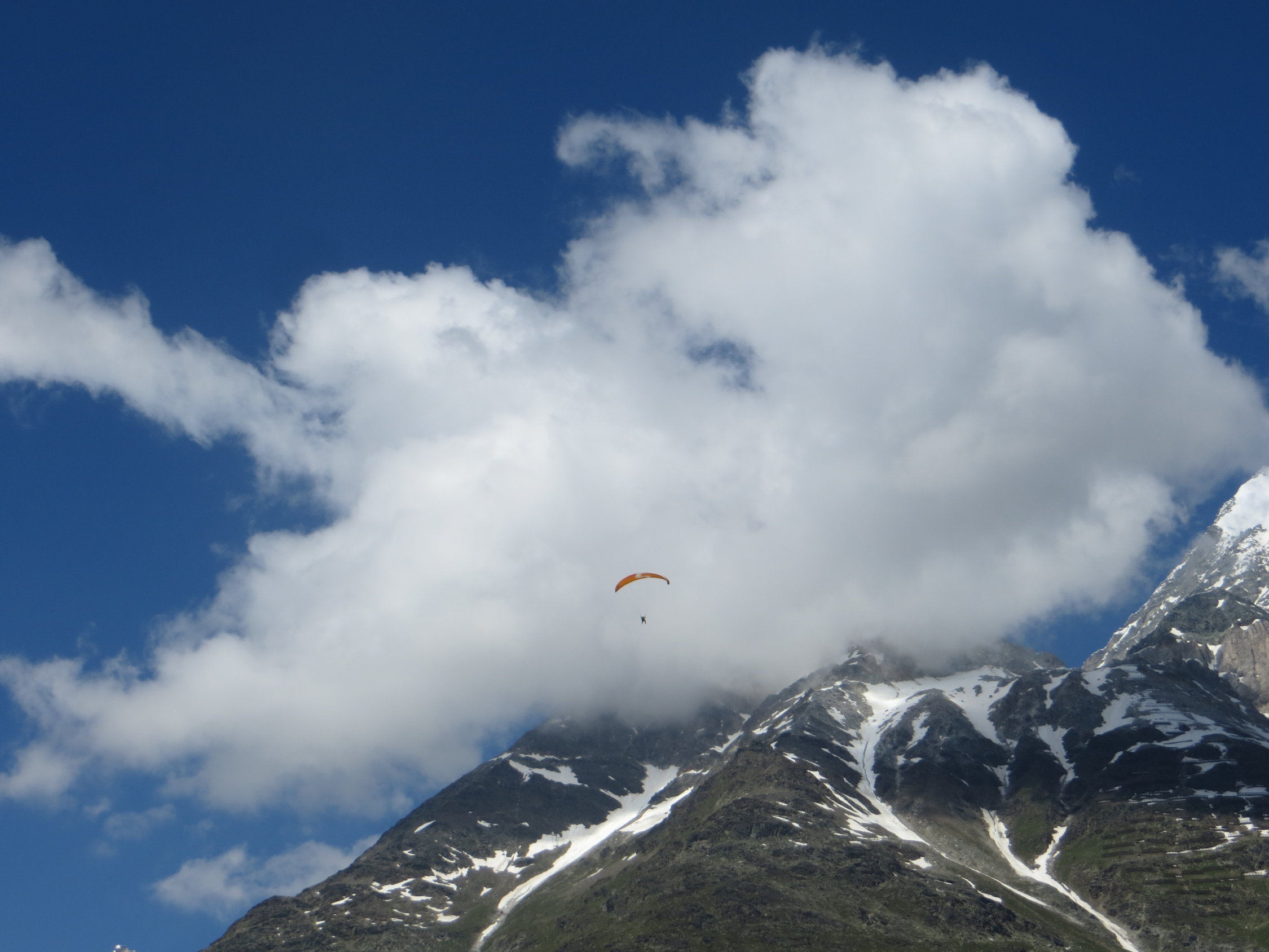Wir sind im Abstieg auf 3900m mit dem Gleitschirm bei besten Verhältnissen gestartet und waren so knieschonend vor 12 in Randa beim Bier auf der Terasse... :-) Herzlichen Dank an Stefan und seine Hüttencrew - mit drei Hüttenmitarbeitern für uns 3 Gäste hatten wir 5*-Service als ideale Vorbereitung für die Tour.