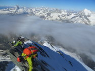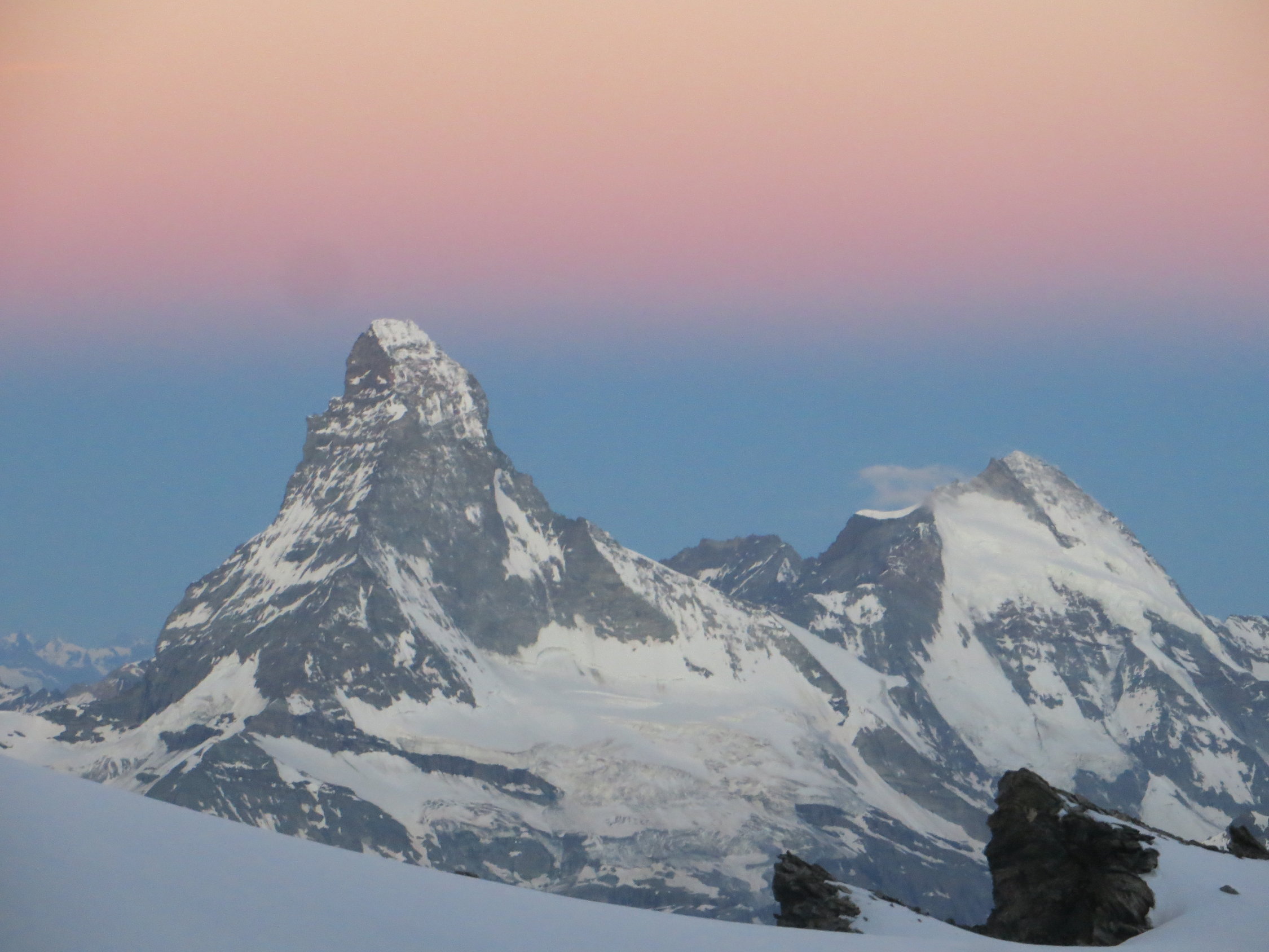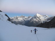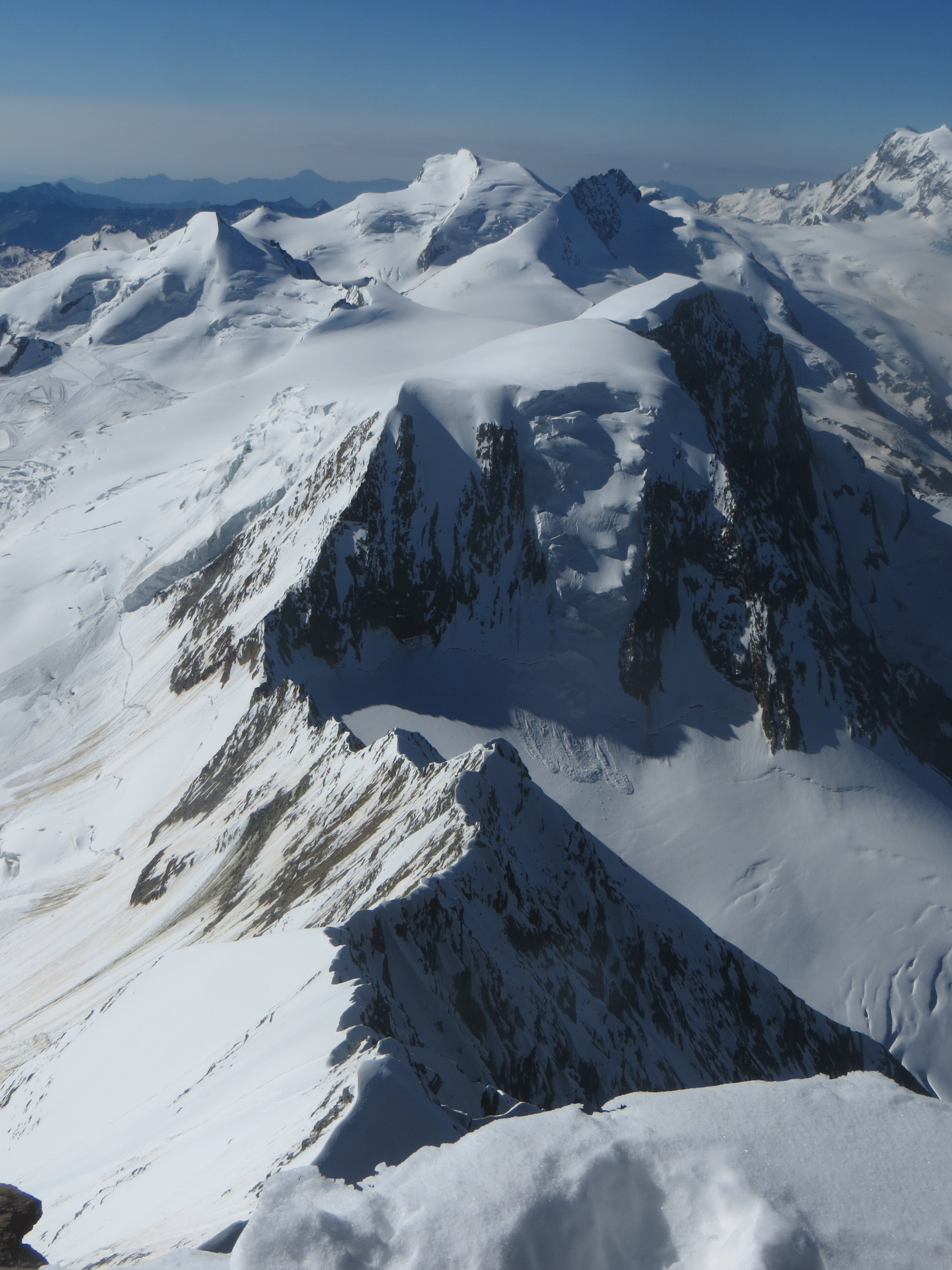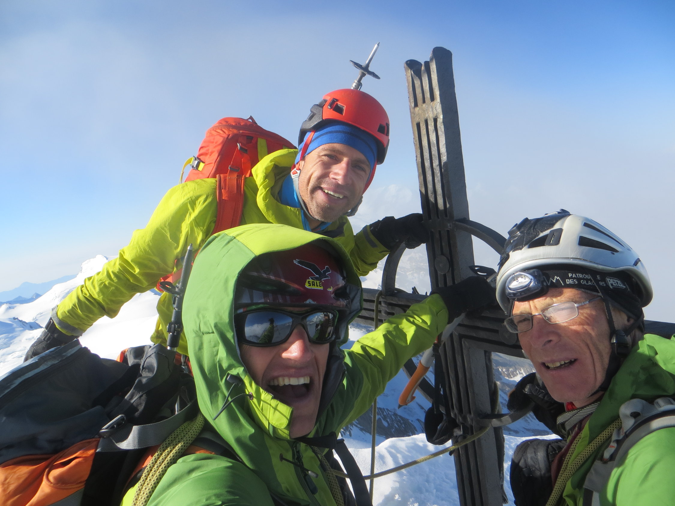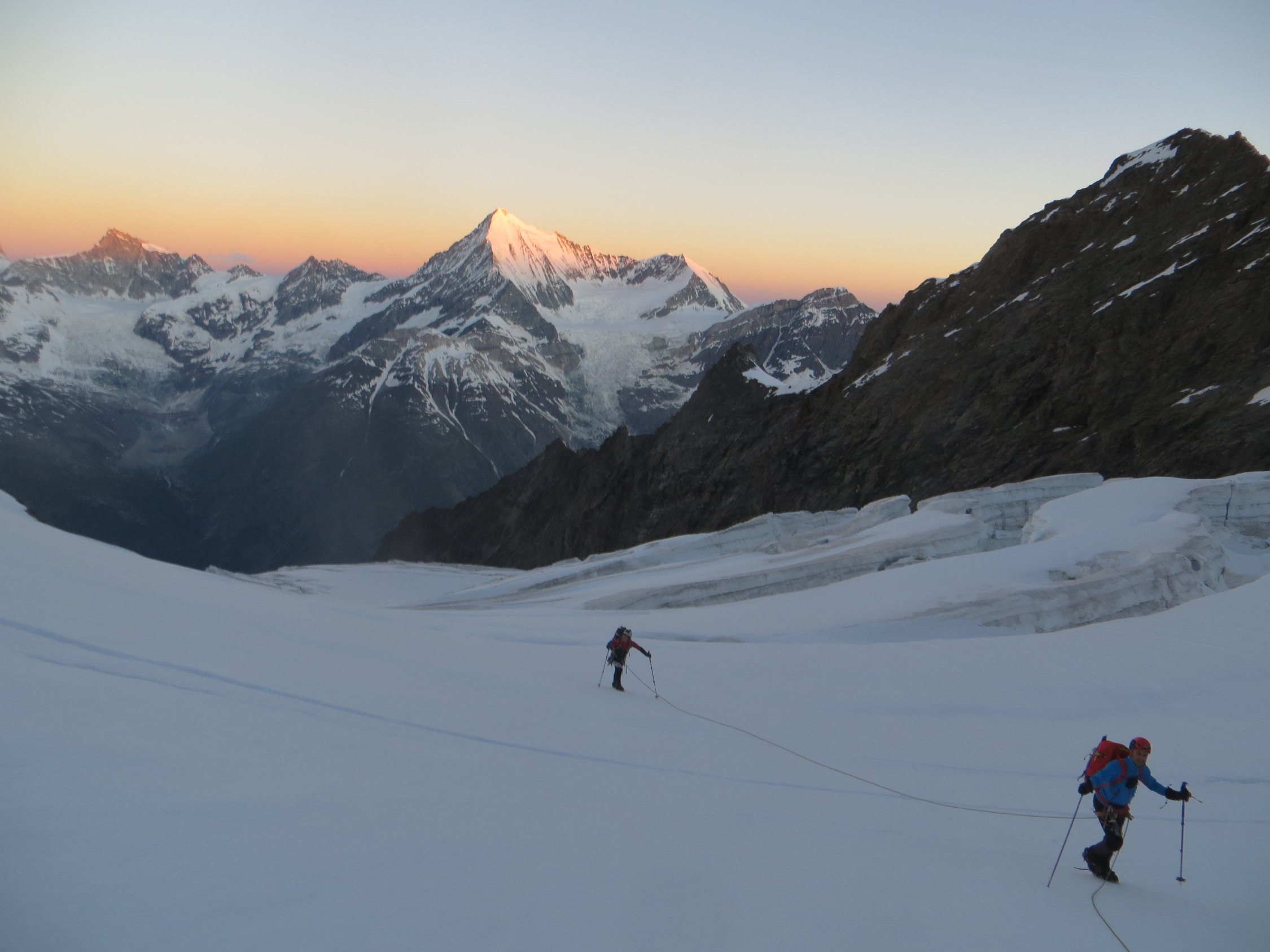 Wir sind im Abstieg auf 3900m mit dem Gleitschirm bei besten Verhältnissen gestartet und waren so knieschonend vor 12 in Randa beim Bier auf der Terasse... :-) Herzlichen Dank an Stefan und seine Hüttencrew - mit drei Hüttenmitarbeitern für uns 3 Gäste hatten wir 5*-Service als ideale Vorbereitung für die Tour.