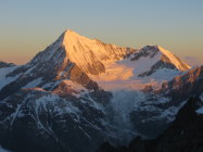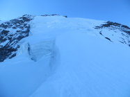Kingletscher ab 3200m noch genügend eingeschneit. NW-Flanke in 5* Trittfirn, nie blank und max. knöcheltief. Es gibt zurzeit 2 valable Varianten durch die Flanke (Hüttenwart Stefan fragen - er hat's im Griff! :-) ) Felsgrat auf letzten 100hm trocken wo anzupacken. Insgesamt wohl kaum möglich bessere Verhältnisse anzutreffen... Bei den momentan hohen Temperaturen empfiehlt es sich entweder sehr früh (01.00 Uhr?) loszugehen, um dann wieder über den Kingletscher abzusteigen, oder aber später im Abstieg die Kinfelsenroute abzuklettern (Spaltensturzgefahr auf Kingletscher nicht zu unterschätzen).
