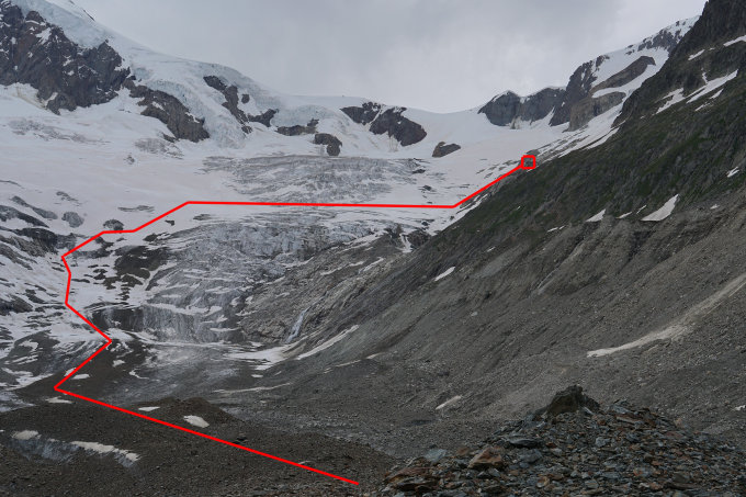 Bei Querung Aletschgletscher direkter Weg zum Mittelaletschtal nicht zu empfehlen, entweder nördlich oder südlich queren, derzeit erschien beim Zeitaufwandsvergleich die nördliche Route deutlich effektiver.