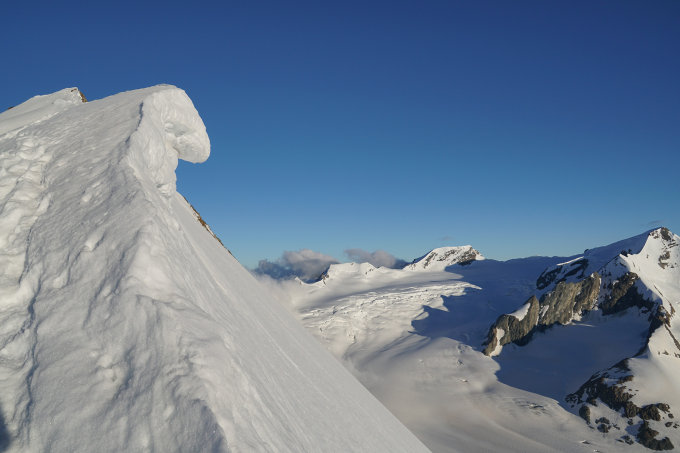 Danach folgender Grat nur gering, d.h. unkritisch verwächtet. Vorsicht bei Abstieg bzgl. Aufweichung. Vorgipfel kurze Stellen Blankeis unter dünner Firnauflage, derzeit am besten nach links ausqueren und am Grat auf den Vorgipfel.
