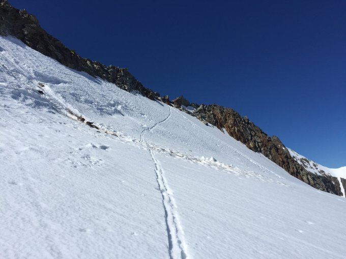 Skier konnten wir beim Beginn des Gletschers auf ca. 2200 anziehen. Beim "c" des Steigletschers mussten wir kurz die Steigeisen montieren, da dort der Gletscher auf ein paar Meter blank war. Kurz danach konnten wir aber die Skier wieder montieren. Ab dann ohne Probleme bis zum Einstieg des Grates.