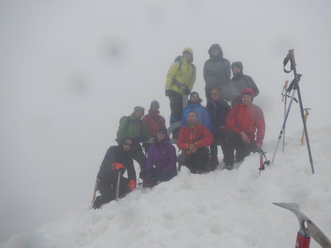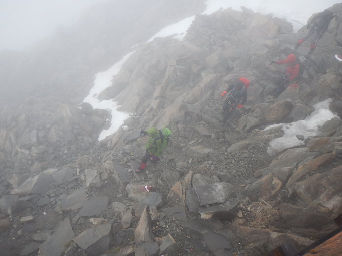 Kesselwandferner gut eingeschneit, keine Spalte zu sehen. Entgegen der guten Wettervorhersage schlechtes, nasskaltes Wetter, zuweilen kaum Sicht. Im Brandenburger Haus etwas aufgewärmt und Kleidung getrocknet, dann auf weiterhin guter Spur zu Guslarjoch und Fluchtkogel. Im Abstieg zu Vernagthütte erste kleine Spalten zu sehen, aber ebenfalls gut eingeschneit und problemlos ohne Steigeisen begehbar