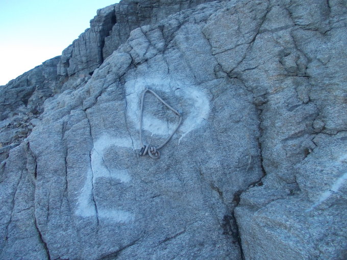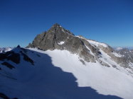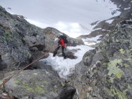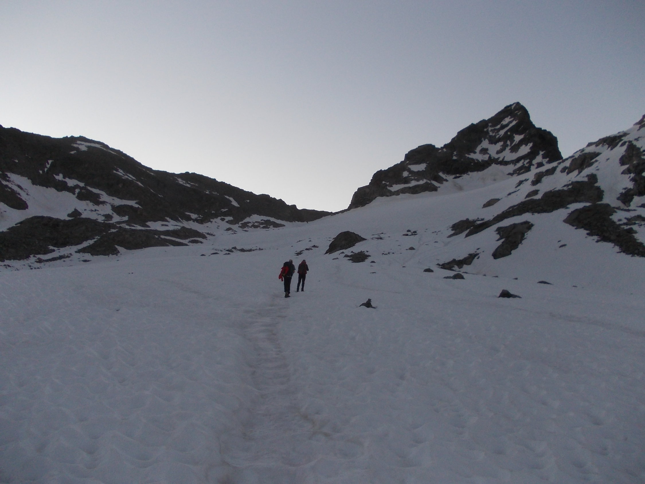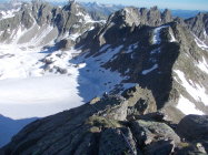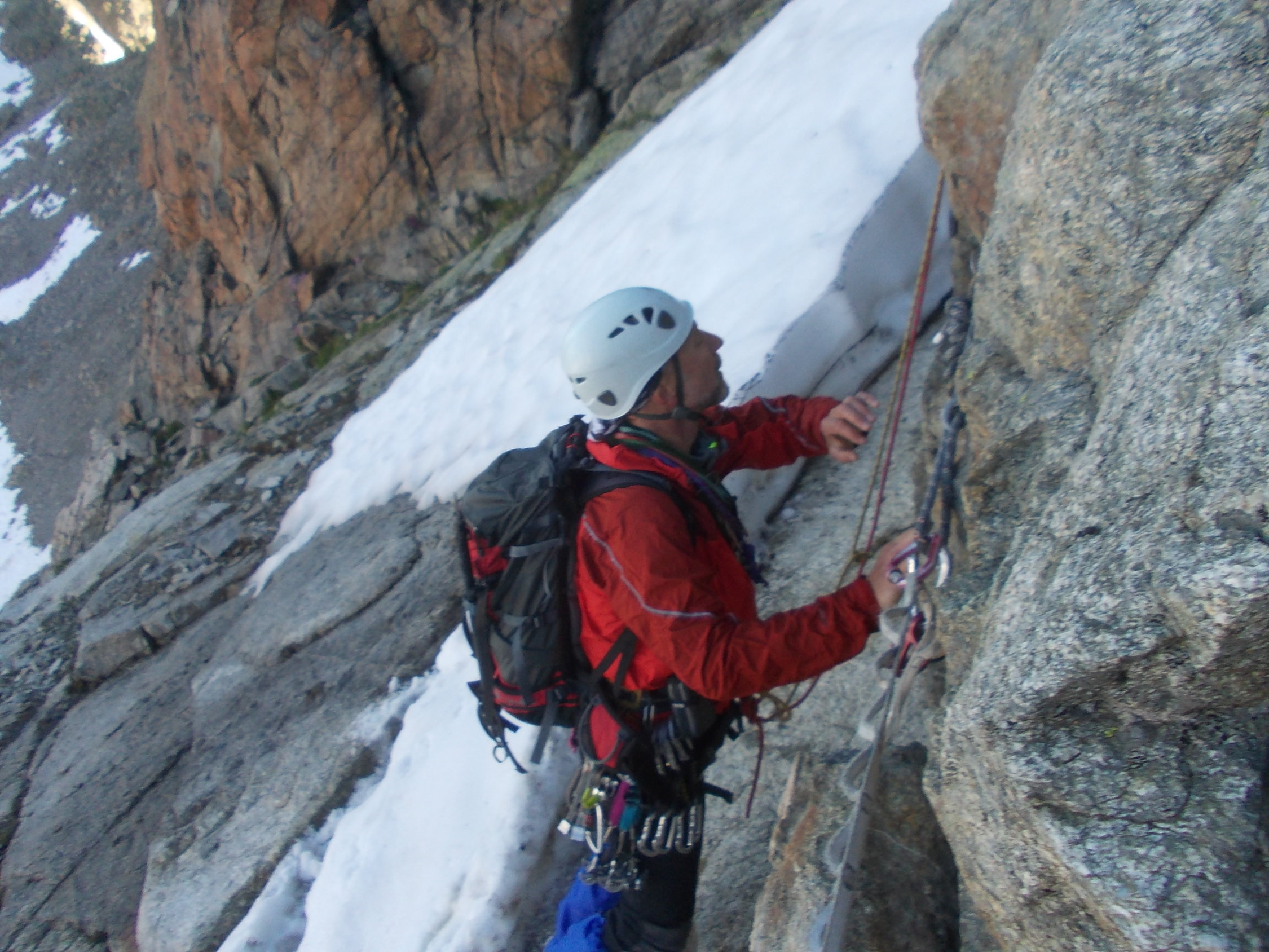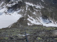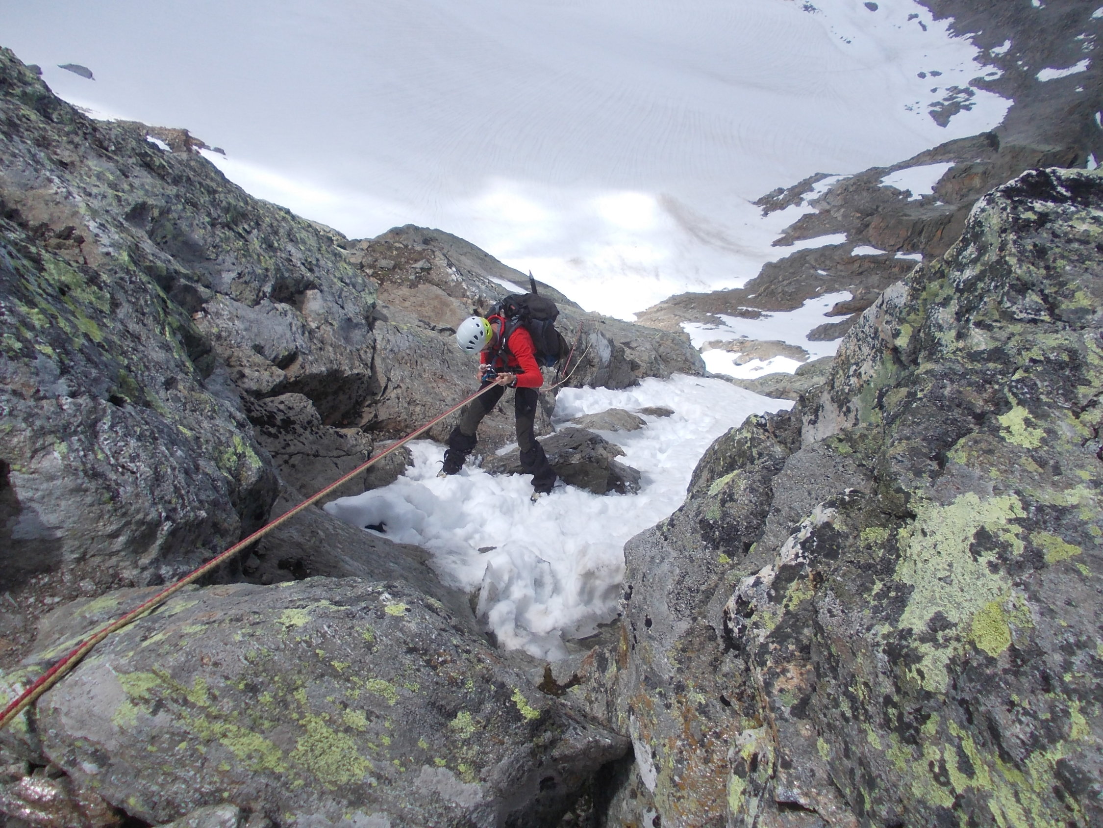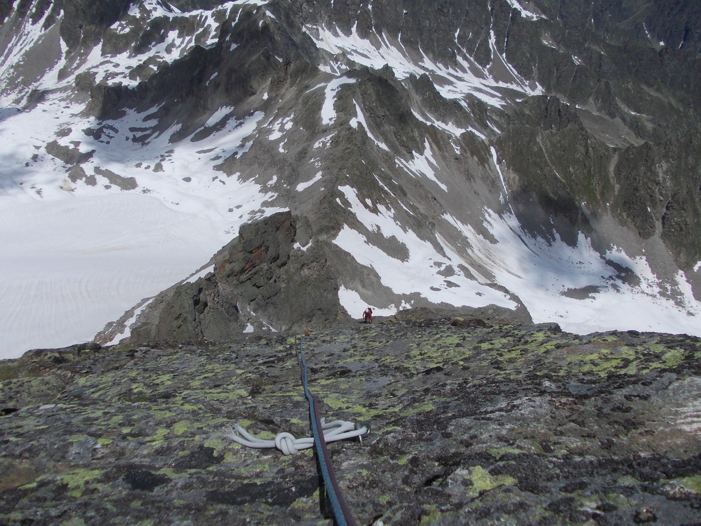 Auf die Steigeisen kann bei entsprechender Wärme verzichtet werden, nicht aber auf den Pickel, da nach Ausgehen des Seils vom letzten Abseilstand her über ein sehr steiles Firnfeld abgestiegen werden muß.