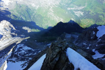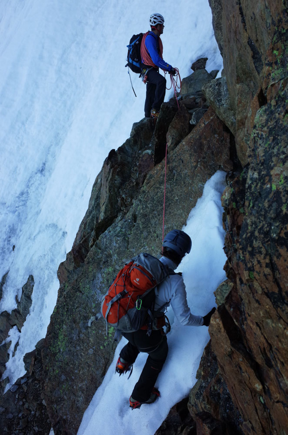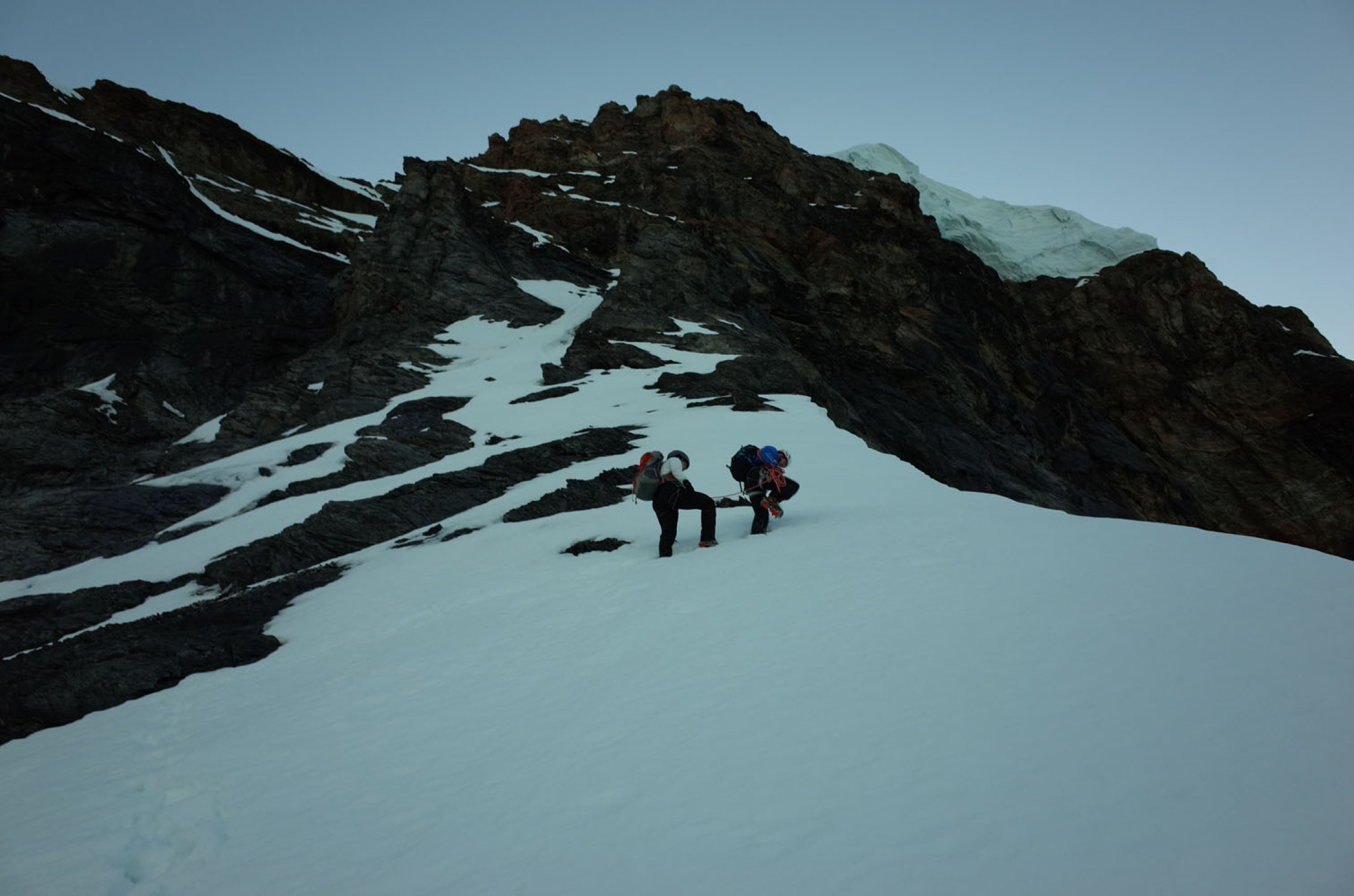 Die Wegfindung in der abschüssigen Kalkplattenflanke war nicht einfach und es lohnte sich, die Route bis auf eine Höhe von ca. 3400m am Vortag zu erkunden. Vorsicht bei mehreren Seilschaften, diese Passage ist steinschlägig.