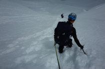 Solange noch soviel Schnee liegt, dürfte die abschüssige Kalkplattenflanke (3150m-3400m) bei kalten Nächten mit gefrierendem Schmelzwasser ziemlich heikel werden.