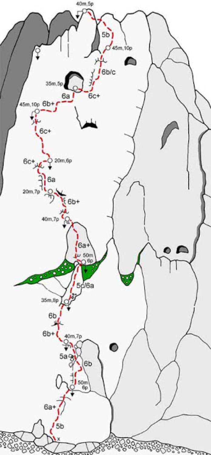Material: 12 Express, evtl. Camalots 0.3-0.75, 2x50m-Seile.