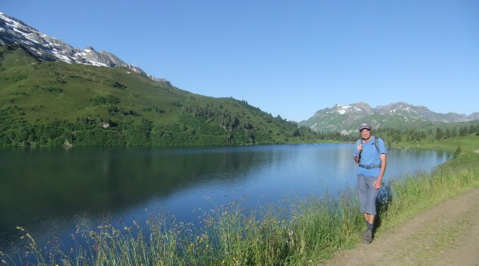 Bilderbuchwetter. Wolkenlos. Mittags bei 32°C nach der Tour gönnte ich mir ein Bad im flachen Engstlensee beim kleinen Wehr. Da war ich nicht der Einzige.