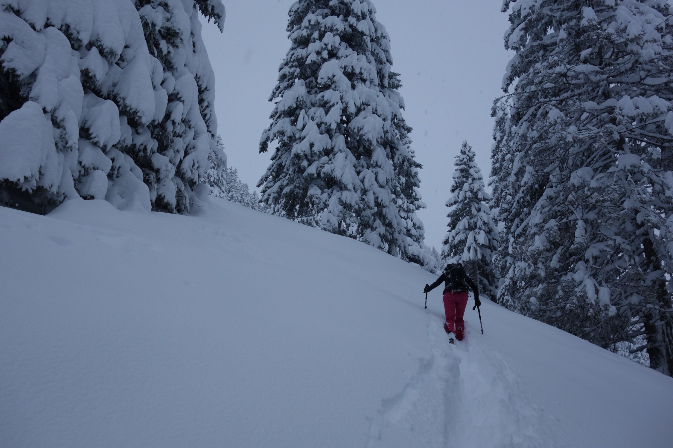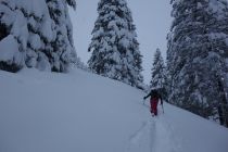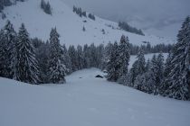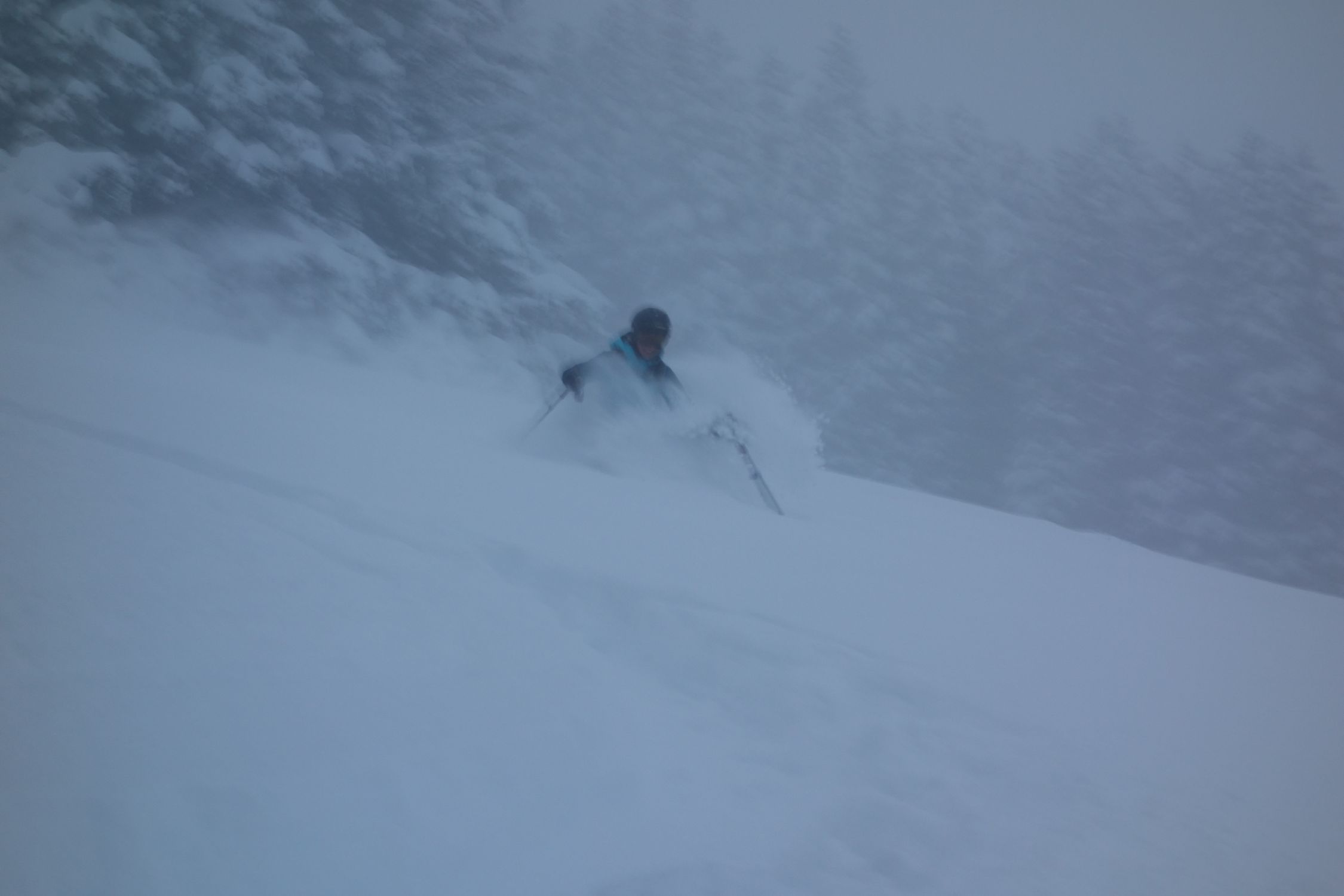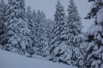 Bei der Talstation 20–30 cm, ab 1300 m 30–40 cm und über 1700 m 50+ cm Neuschnee. Wir waren ganz alleine unterwegs und die Spurarbeit war manchmal streng, aber es hat sich sehr gelohnt: Eine Tiefschneeabfahrt über den Dürrenegg-Hang in Verhältnissen, wie ich sie auf dieser Höhe selten erlebt habe – mit Pulverwellen bis zur Skibrille usw.