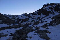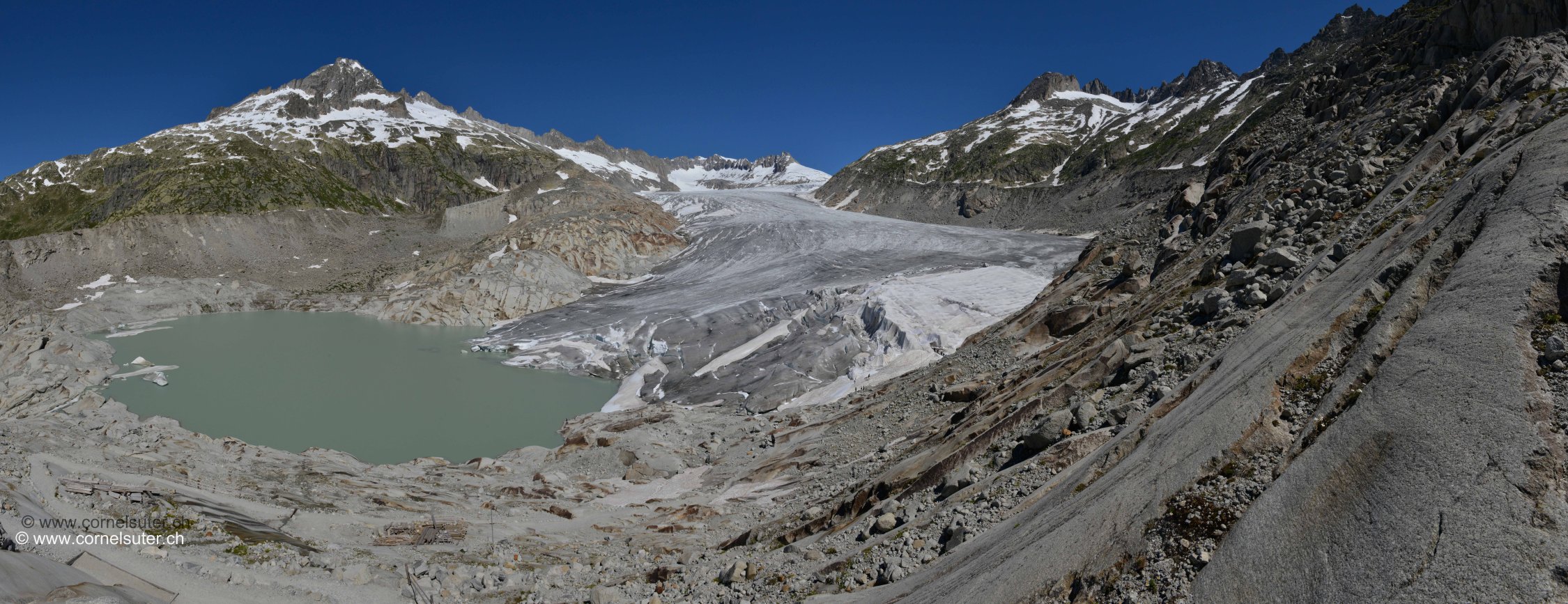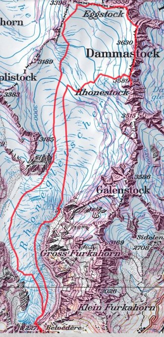 Start der Tour um 4:10 Uhr beim Belvedere, die Ski kann man hier oder zu Hause bereits auf den Rucksack binden. Ab Belvedere müssen die Schi getragen werden bis ins Gebiet der Abzweigung zum Galenstock, bedeutet 3km und 1h. In dieser Geröllmulde noch ein paar wenige Altschneefelder, kurz mal die Ski tragen über das Geröll. Etwas unterhalb des Pt.2769 wieder auf den Gletscher hinüber gequert, ab da ist es geschafft, Schnee wie tief im Winter. Mit den Ski gerade noch tragend, zu Fuss nicht. Angekommen im Grossfirn Aufstieg zum Hinterer Rhonestock 3588m, teils hart mit vereisten Schuppen, mit Harscheisen gut zu steigen. Angekommen beim Rhonejoch, Skidepot, zu Fuss mit Steigeisen, griffig, zum Rhonestock.