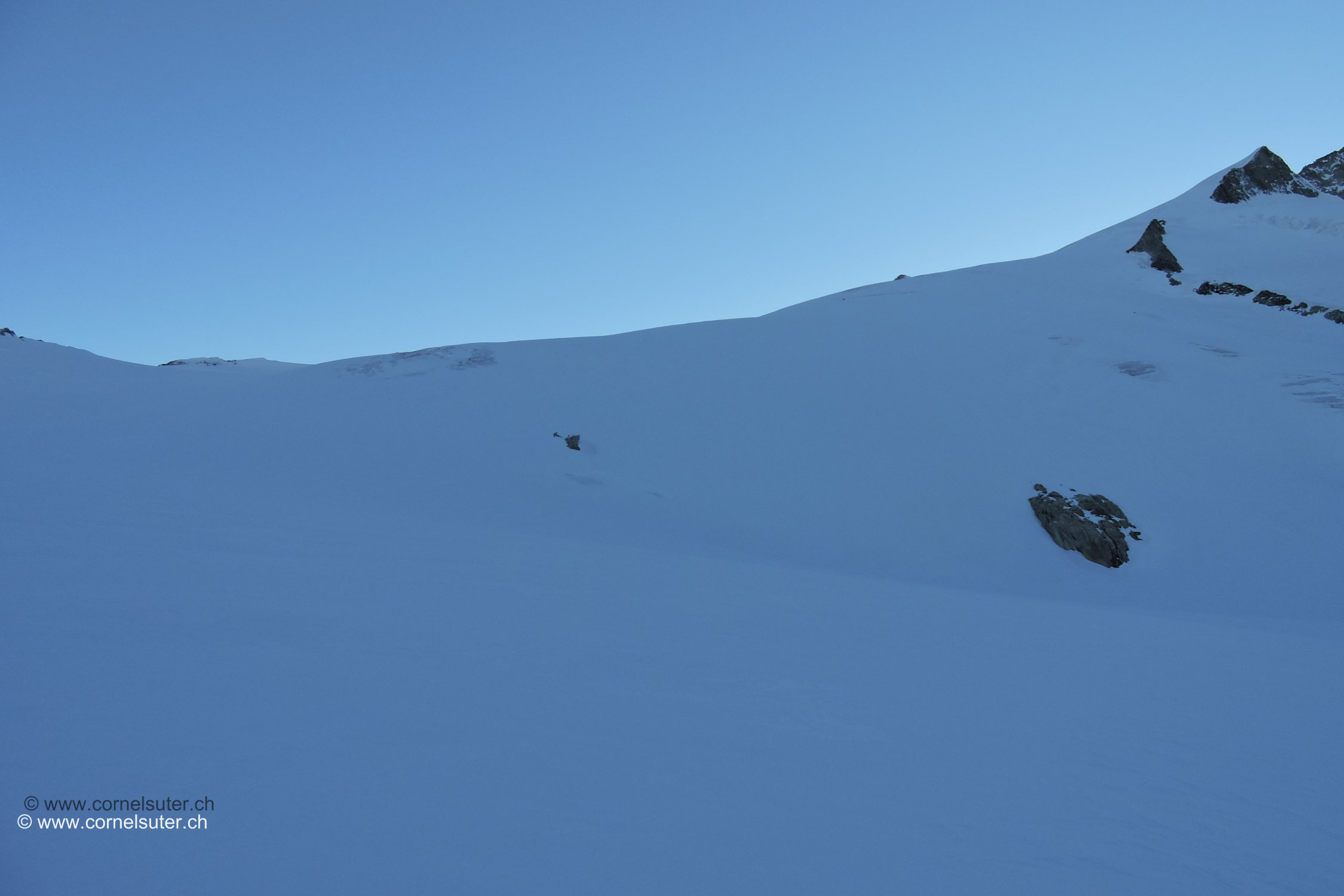 Abfahrt auf teils Wind gepresstem Schnee, ab dem Grossfirn weich und das schieben beginnt.