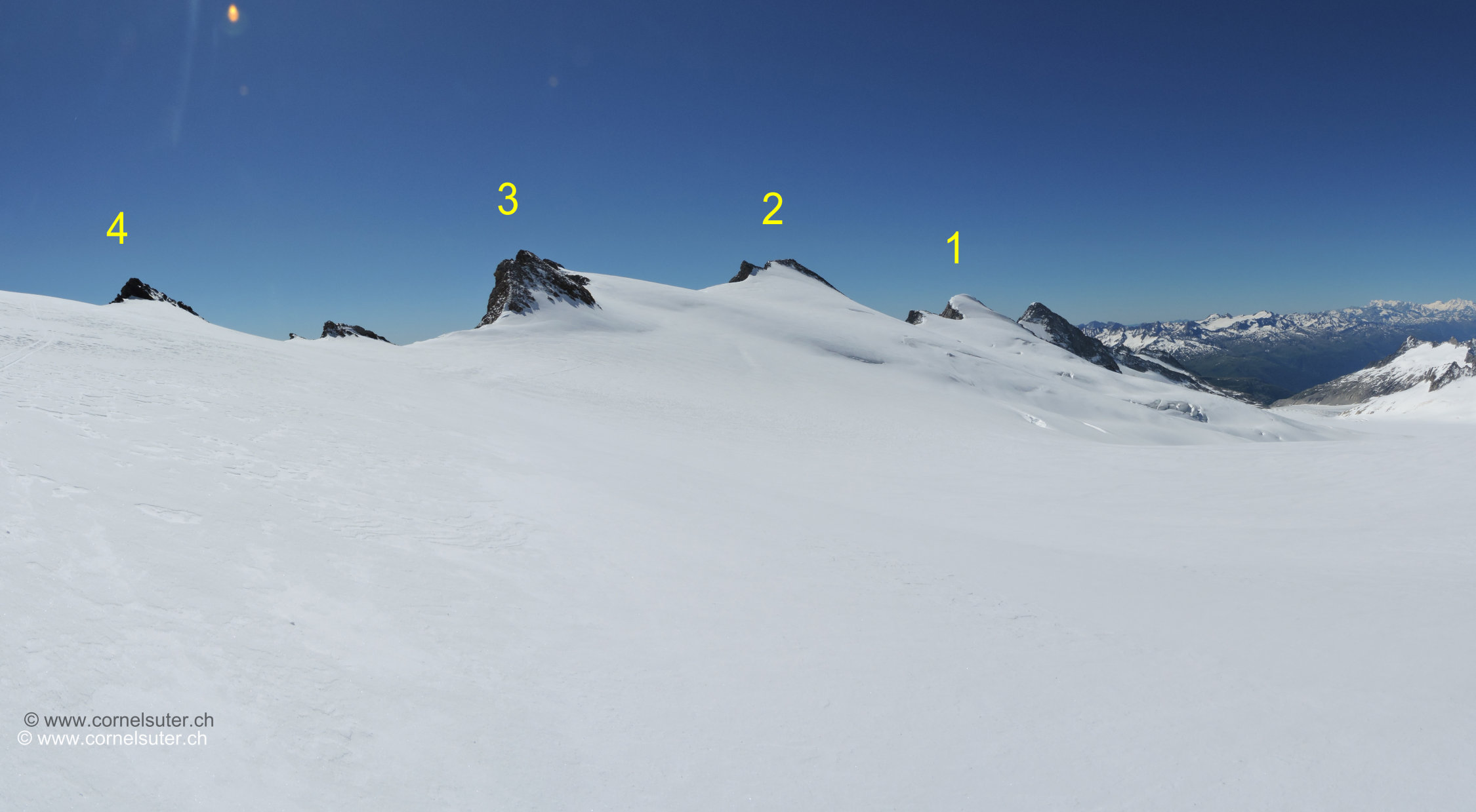 Ab dem Dammastock ohne nennenswerte Ereignisse auf den Schneestock 3608m und Anschliessend auf den Eggstock 3554m.