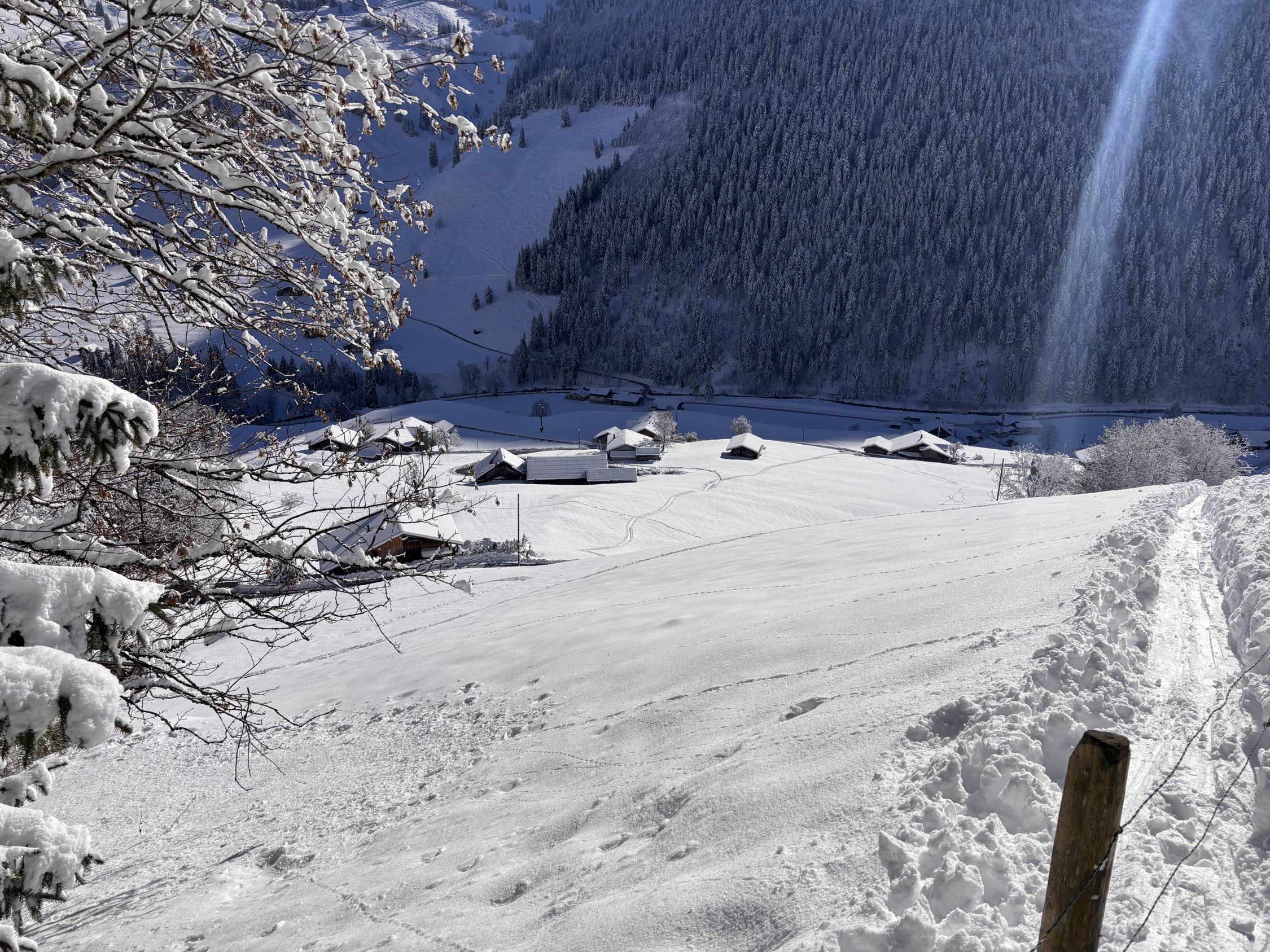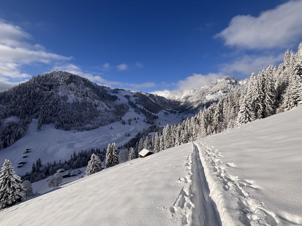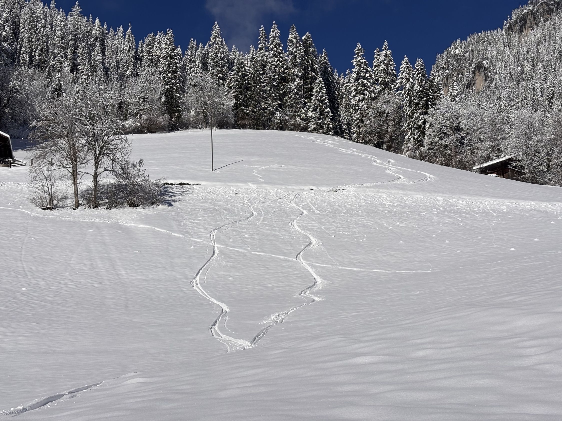 Unterhalb von zirka 1'400m dann ohne Unterlage, aber immerhin rund 40 - 50cm Pulver, bis nach Zwischenflüh hinunter wird der Schnee dann weniger, aber immer noch gut fahrbar. Den einzigen Steinkontakt hatten wir oberhalb der Brüüscht (ca. 1'600m) in einer Waldquerung - dank Steinski aber sehr verschmerzbar.