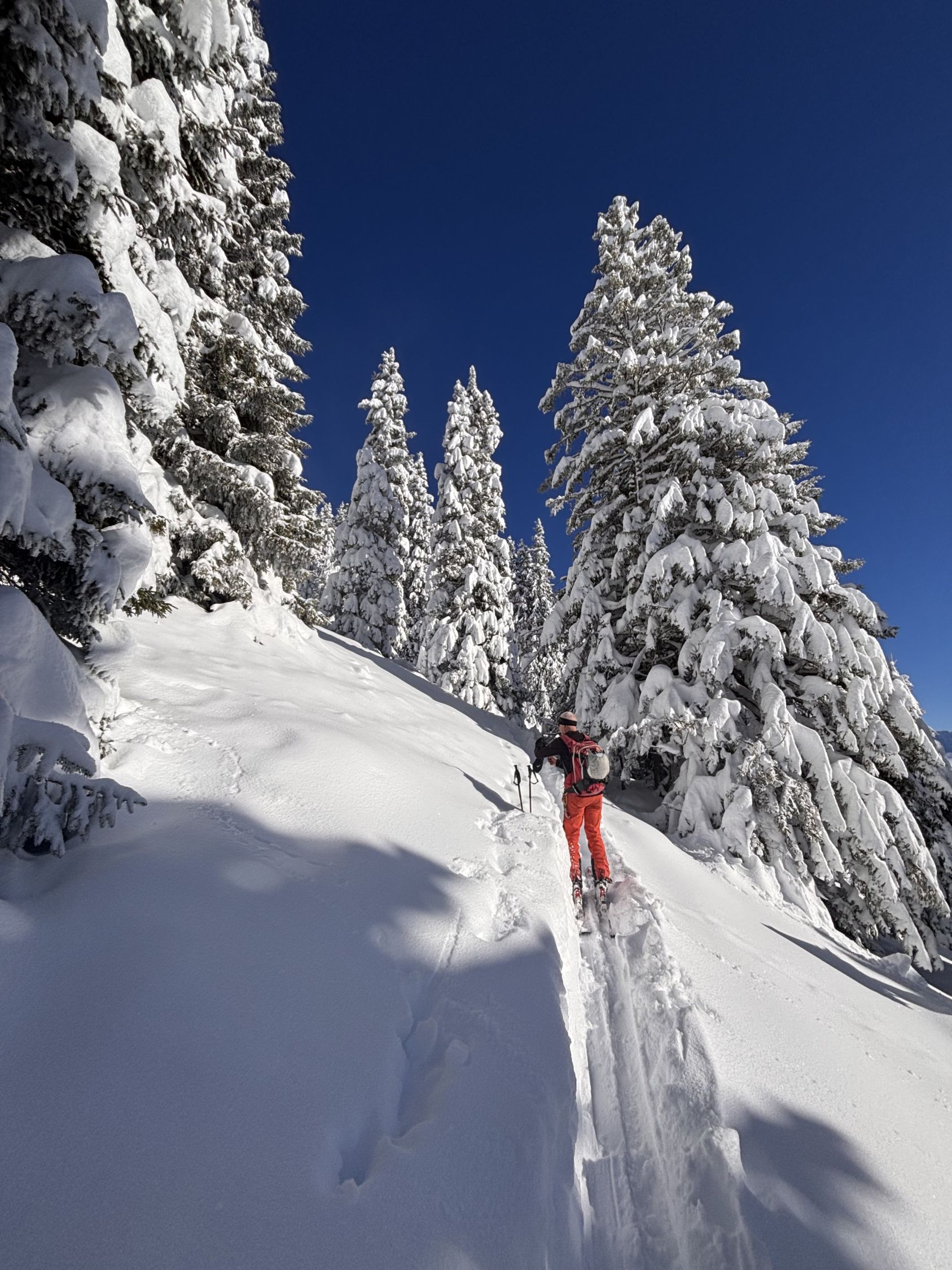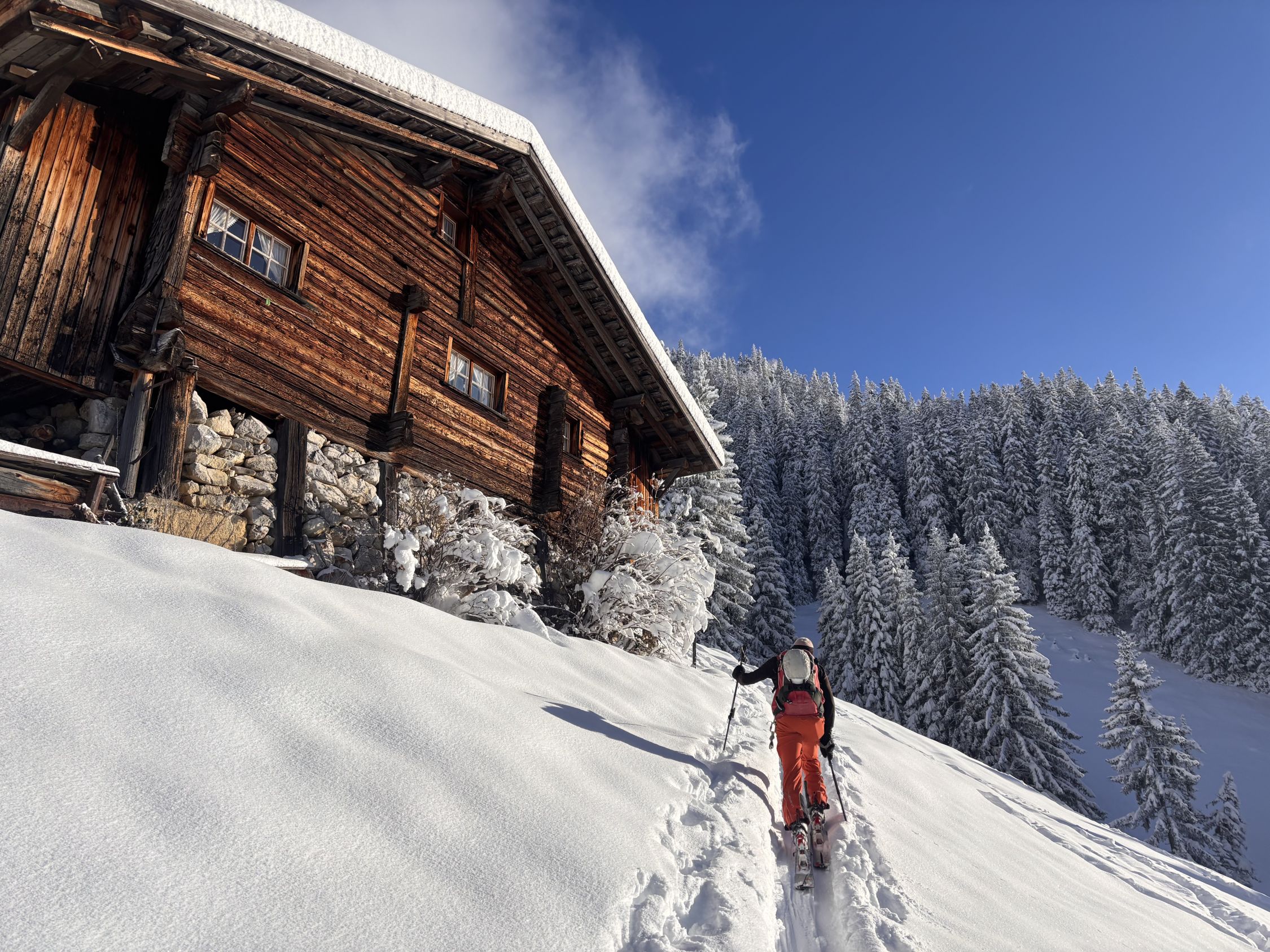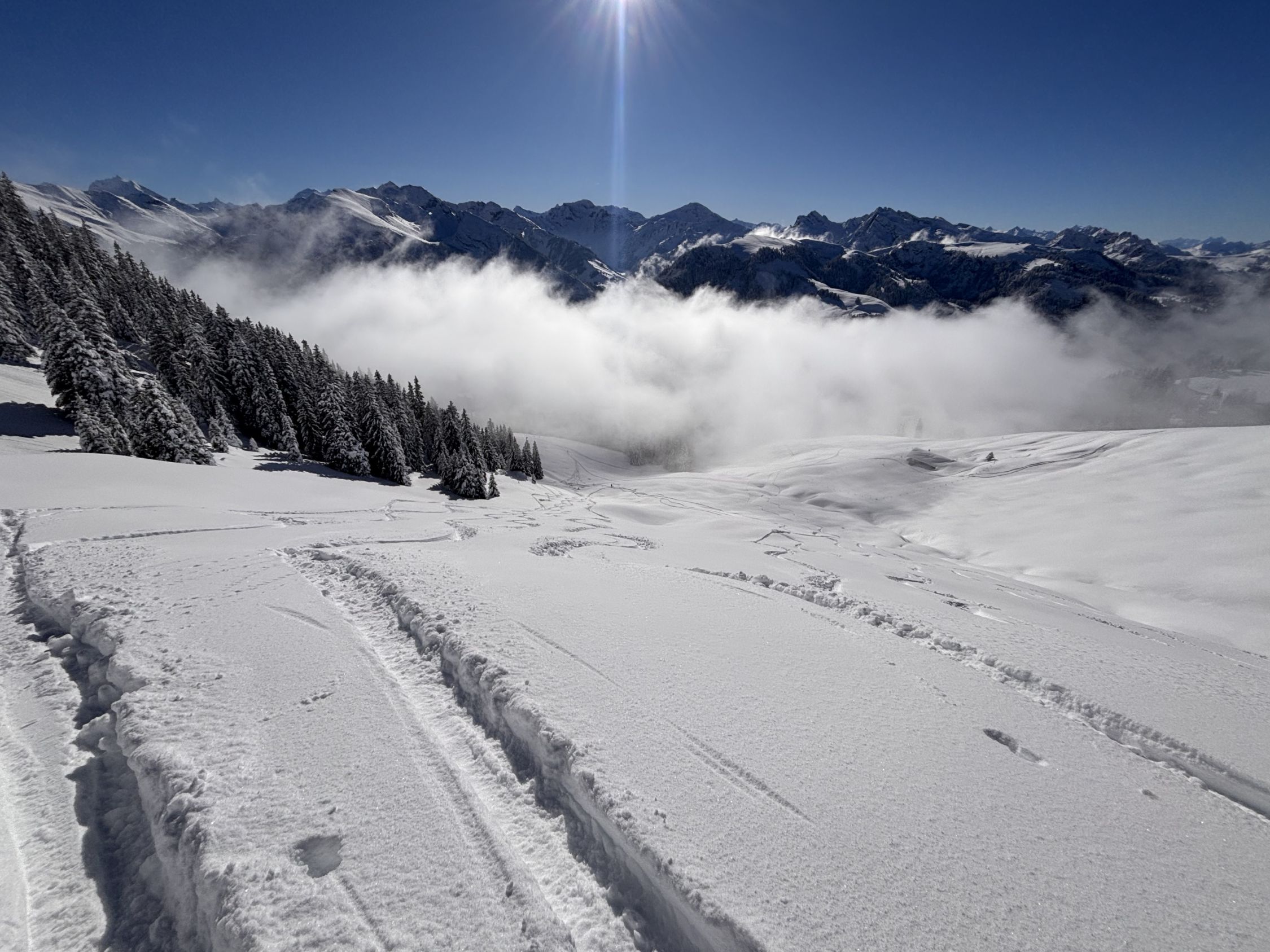 Unterhalb von zirka 1'400m dann ohne Unterlage, aber immerhin rund 40 - 50cm Pulver, bis nach Zwischenflüh hinunter wird der Schnee dann weniger, aber immer noch gut fahrbar. Den einzigen Steinkontakt hatten wir oberhalb der Brüüscht (ca. 1'600m) in einer Waldquerung - dank Steinski aber sehr verschmerzbar.