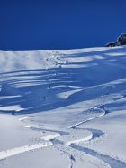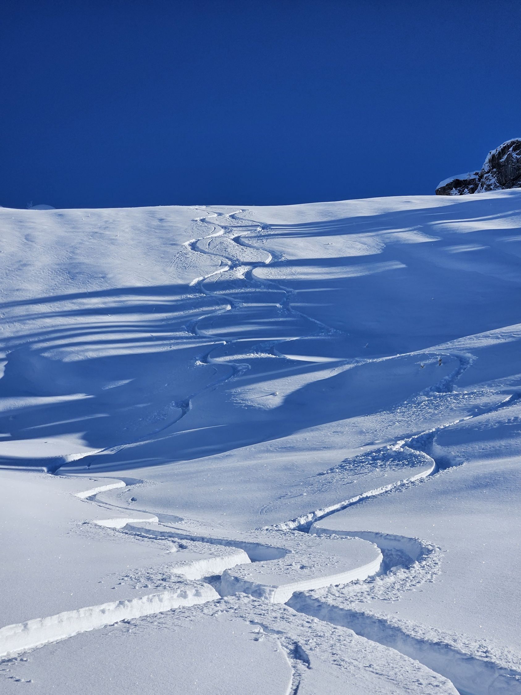 Oben wunderschöner Pulver, kaum Gefahr für Bodenkontakt. Unten reicht die Schneemenge aus, um über die flachen Wiesen abzufahren.