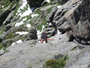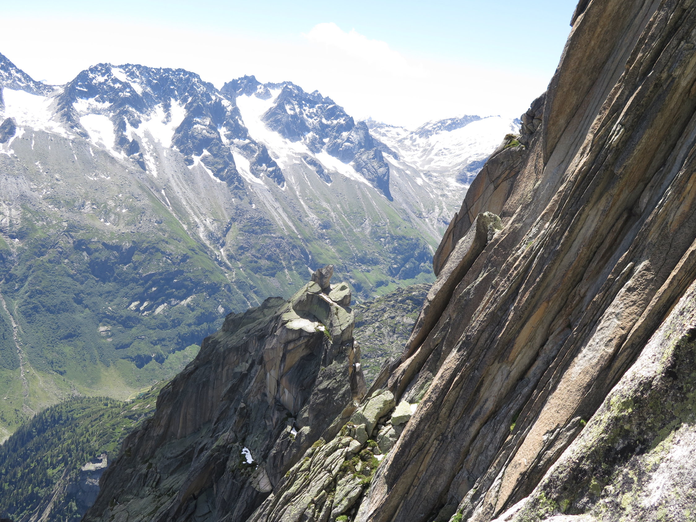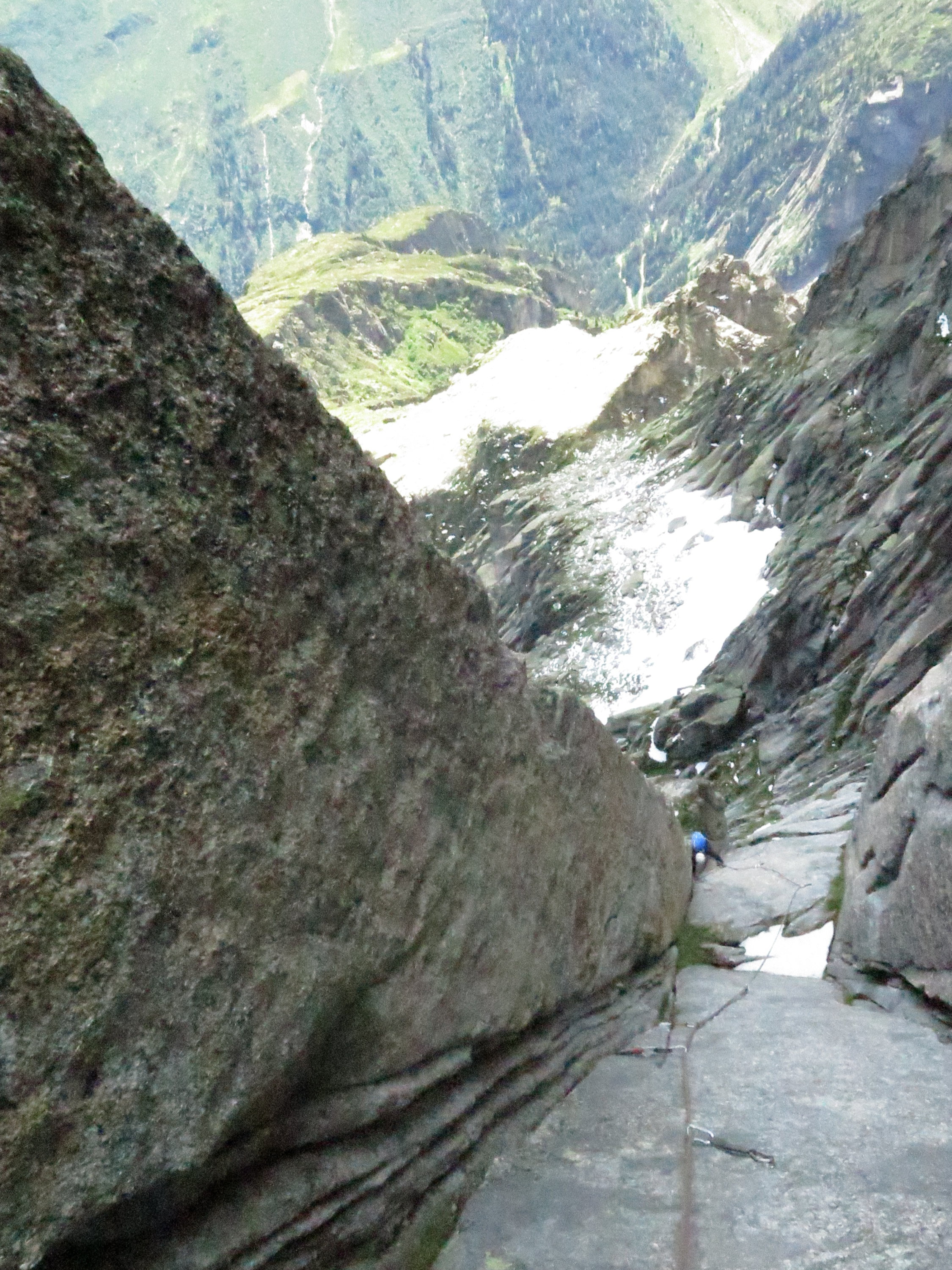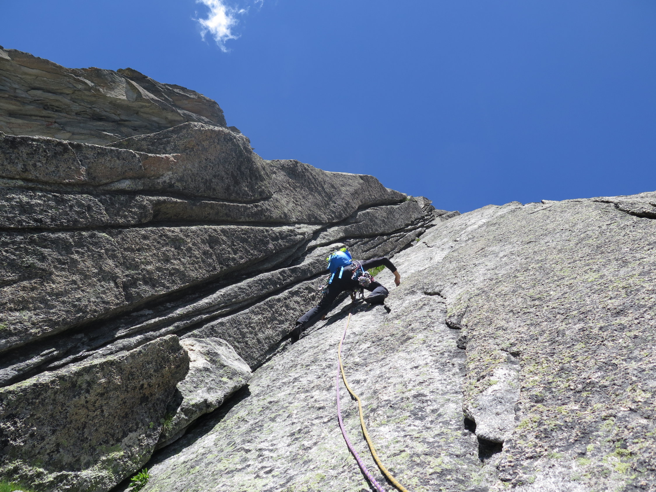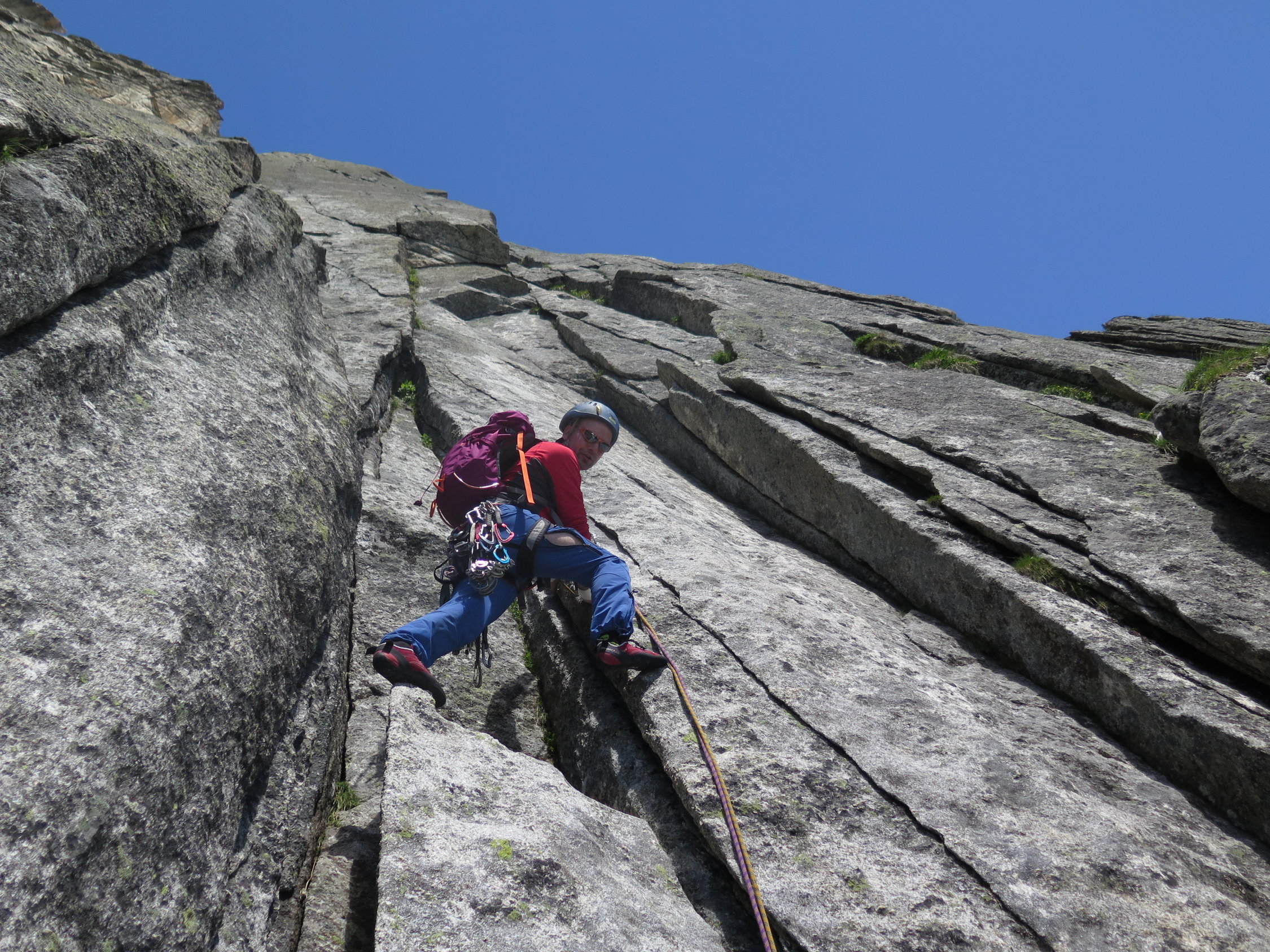 Die Schwierigkeiten sind recht anhaltend, die SL teils recht streng bewertet (in neuem Remy-Führer inzwischen wohl mit 6a bewertet). Stellen wie der senkrechte Piazriss links von der Kante zum Schluss der letzten 5c+-SL (falls das die richtige Lösung war) sind zwingend zu klettern, einen Friend aus der Kletterposition zu legen wäre dort sehr anstrengend, ein Pendelsturz ungut. Friends bis Gr. 3 und ab und zu Keile notwendig, Absicherung mit Bohrhaken an den meisten Stellen gut.