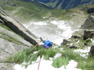 Wir sind vom Tal aus gestartet, haben , obwohl wir dieses Mal keine Hüttengäste waren, vom Hüttenwirt Hans Berger einige nützliche Infos bekommen, den Einstieg hat er uns über sein Fernrohr gezeigt. Einer Seilschaft, die ihm aus der Tour heraus mit einem Problem bei der Routenfindung angerufen hat, hat er umfassend geholfen. Einfach ein unglaublich hilfsbereiter, kundiger und netter Hüttenwirt, vielen Dank!