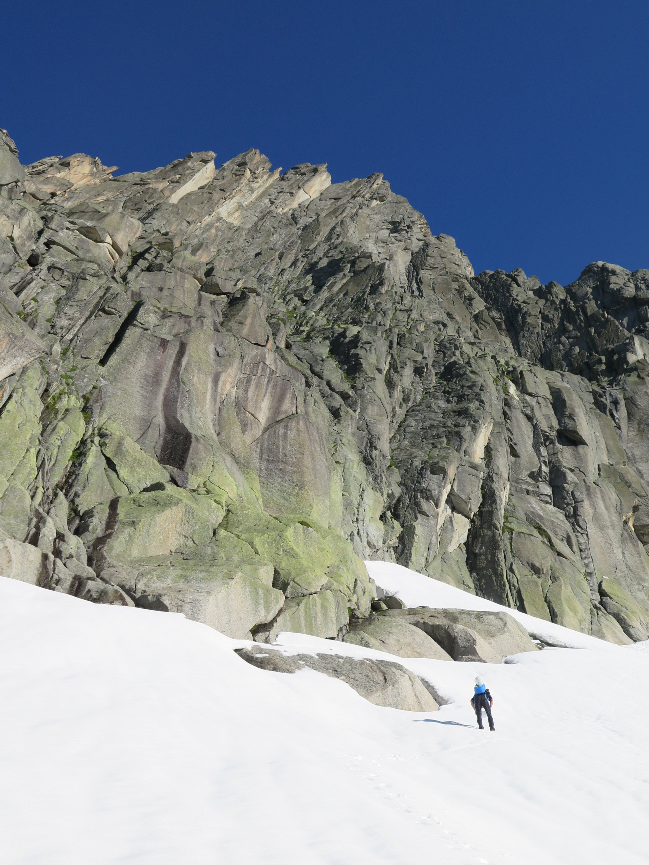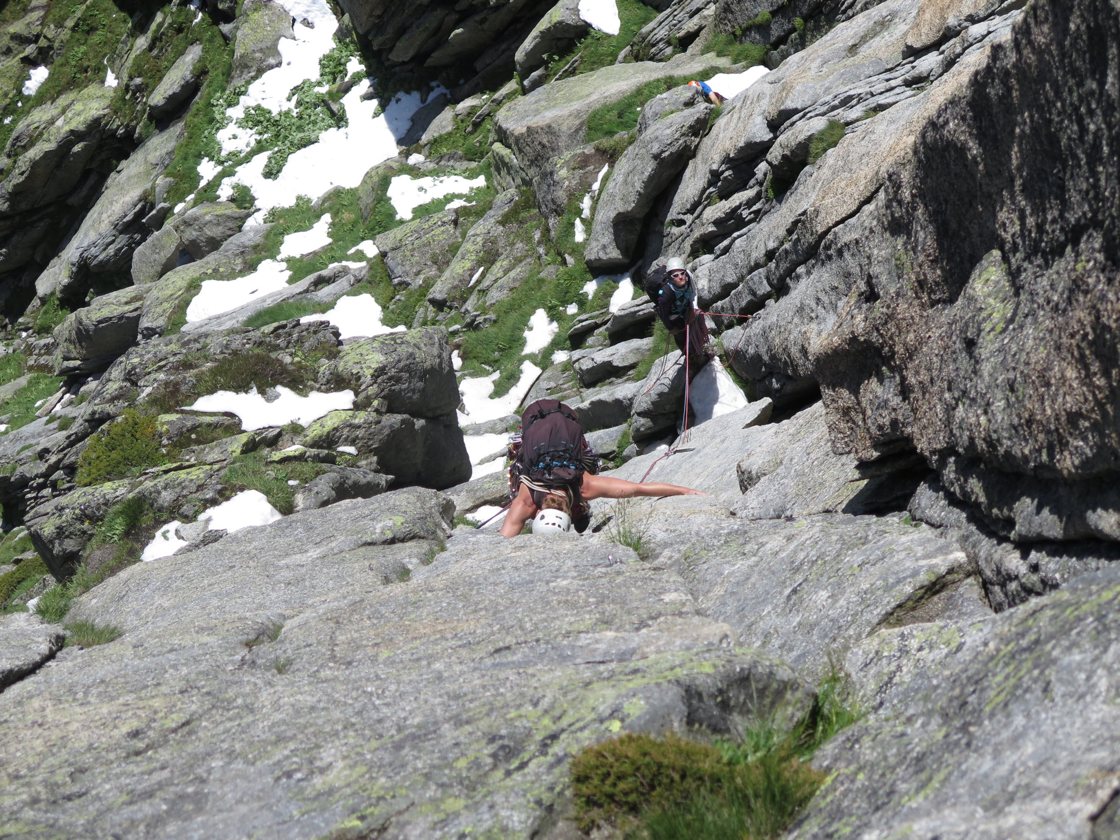 Für Zustieg wären am Sonntag Steigeisen oder ein Pickel angenehm gewesen. Harter Schnee mit nassem Neuschnee als Auflage, dadurch recht rutschig. Bergschrund gut zu überwinden, aber tief. In den unteren SL (v.a. SL 2-5) noch recht viel Neuschnee und Schmelzwasser bei Bändern, somit dort etwas unangenehm aber machbar.