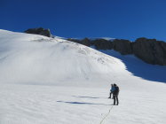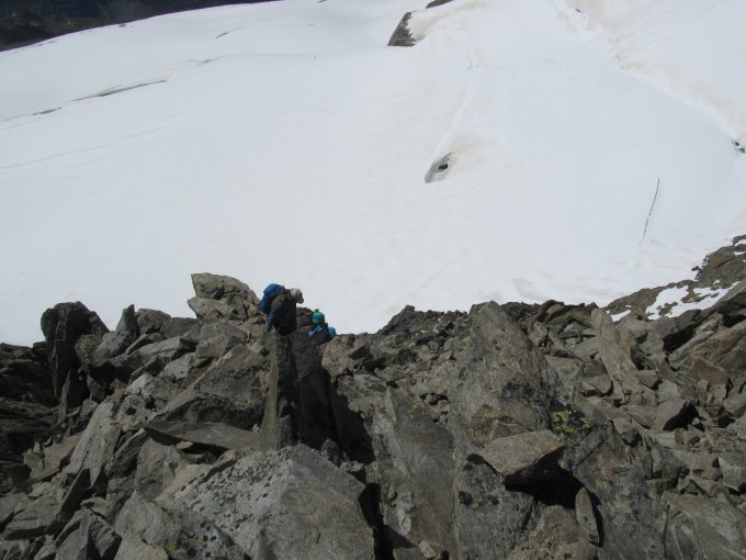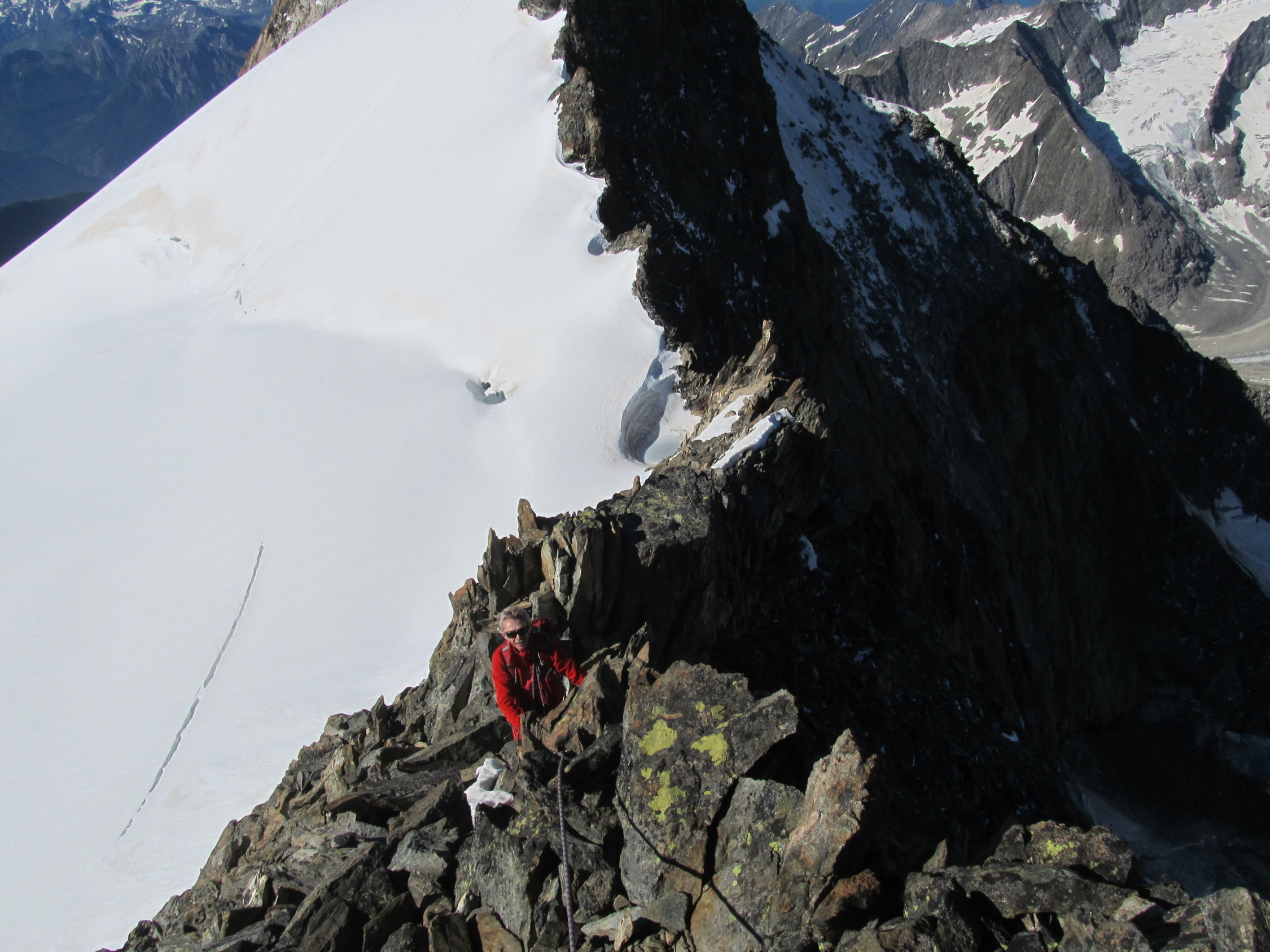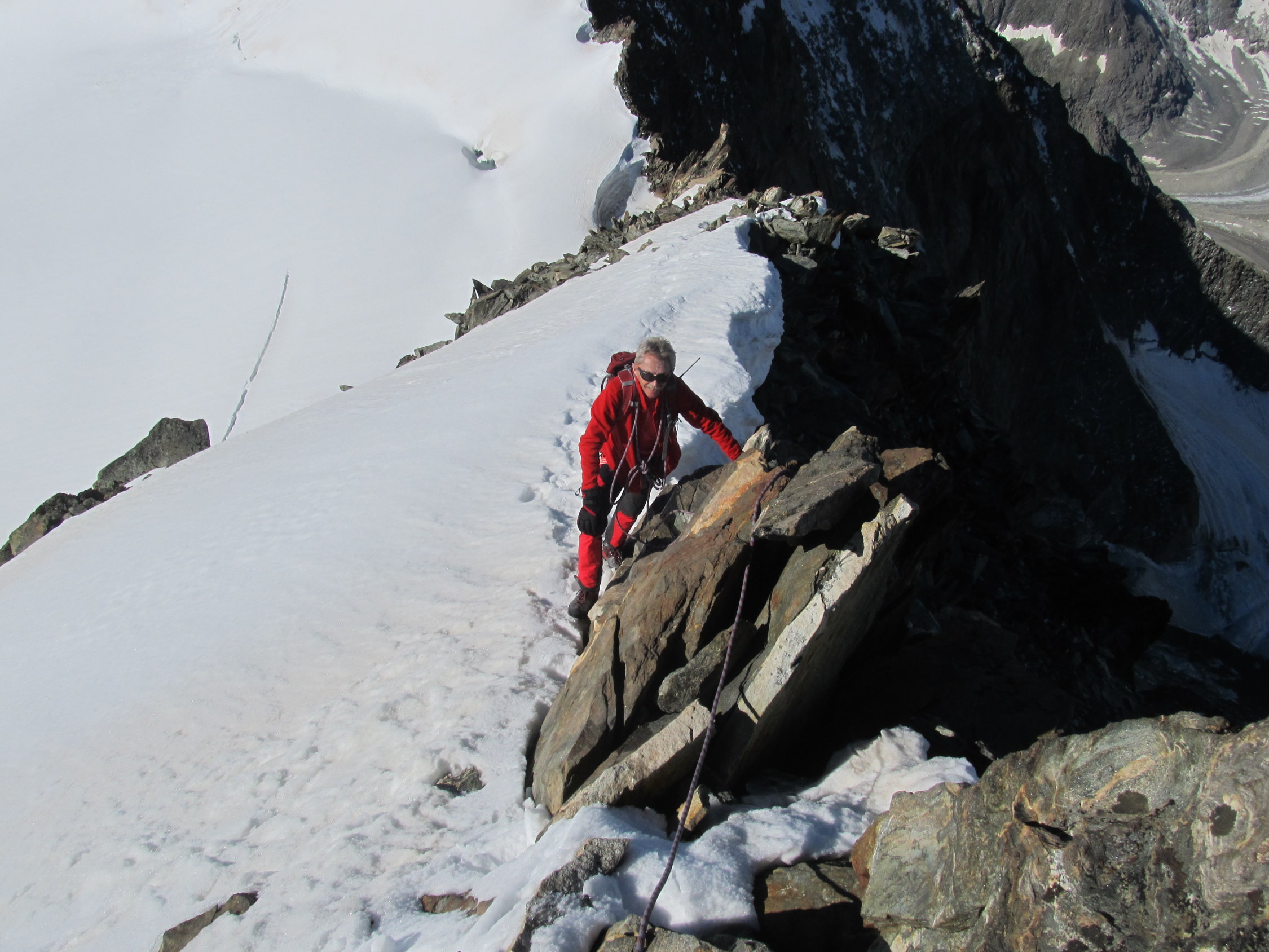 Am Grat ein längeres Schneestück, lässt sich mit dem 30 m - Seil gut sichern, speziell im Abstieg, wenn der Schnee weich ist.