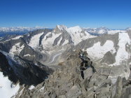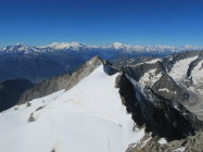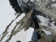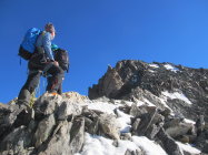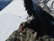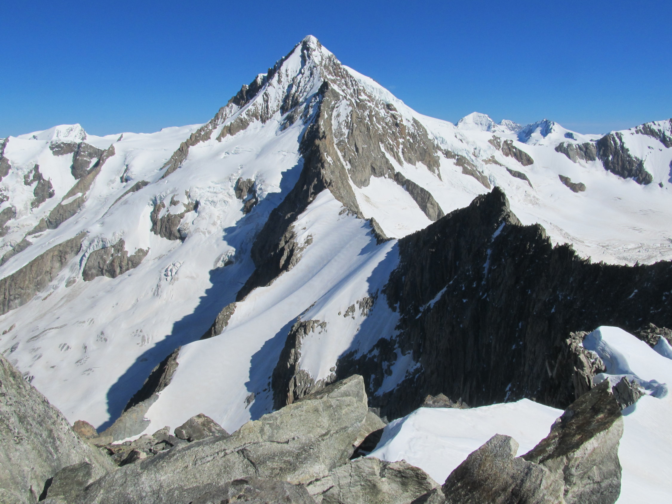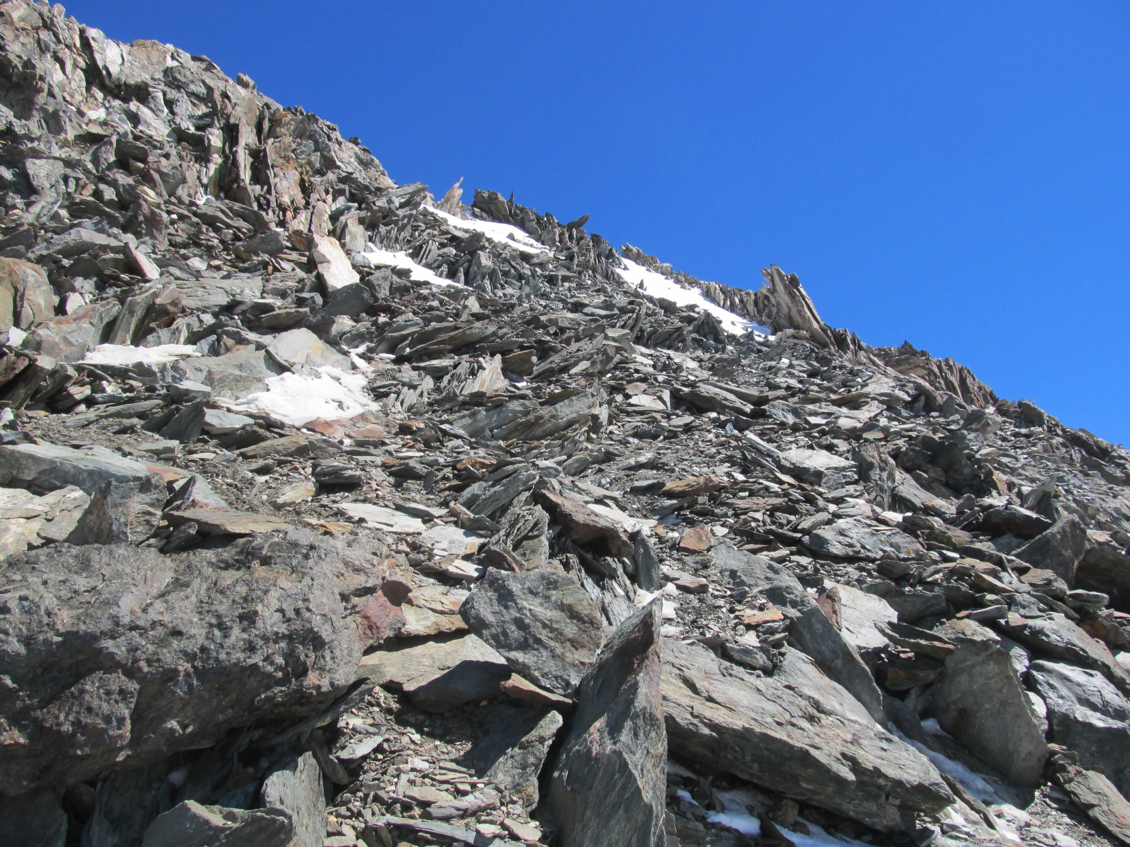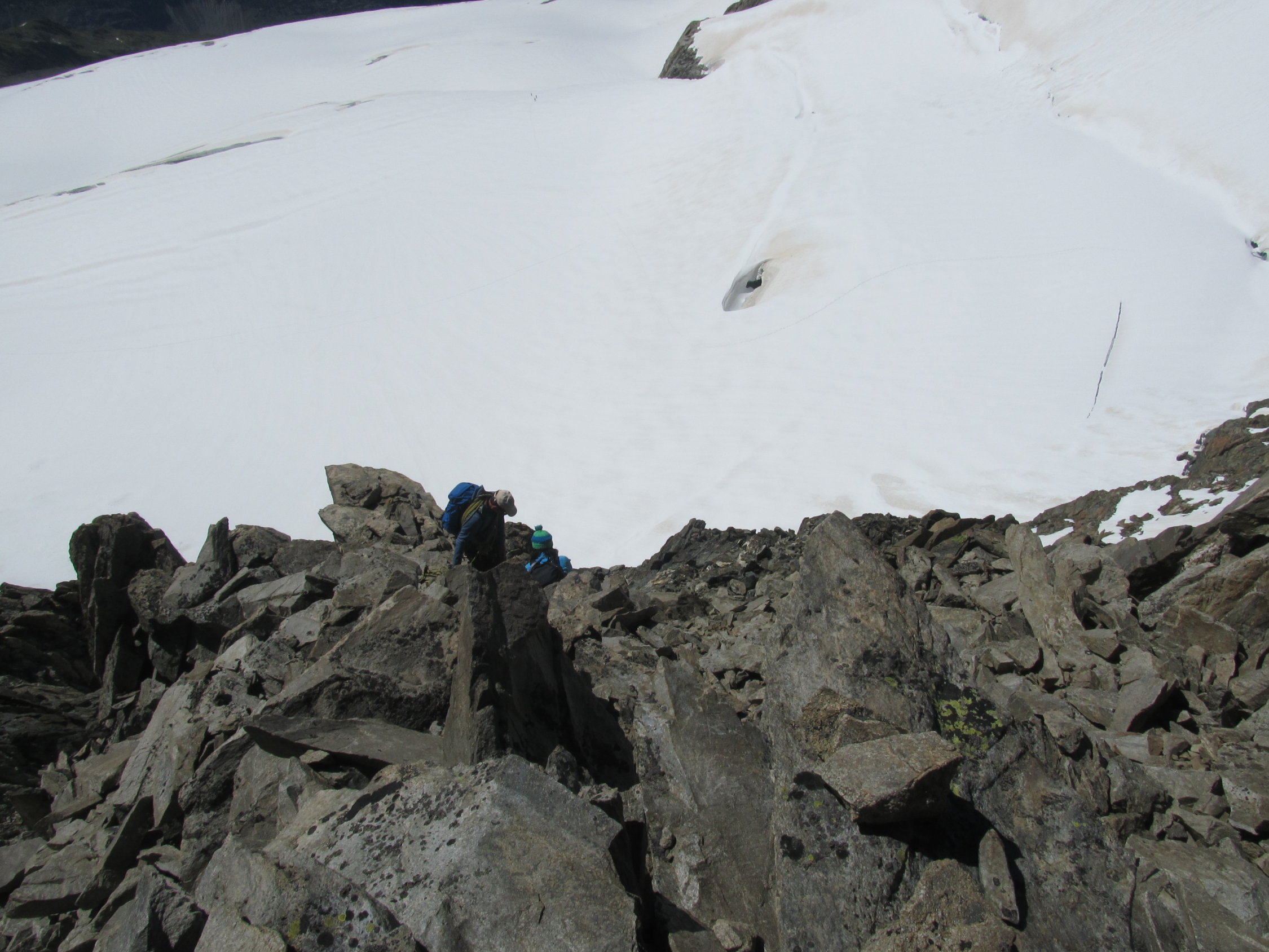 Schwierigkeiten am Grat lassen sich rechts umgehen, Spuren sind meist sichtbar. Geschätzt, die oberen 2/3 vom Felsaufstieg bewegt man sich in der Flanke und da ist nicht immer alles fest. Für den Gratabstieg genügend Zeit einrechnen. Mit 2 Seilschaften ist doppelte Vorsicht geboten, dass das unten kletternde Paar nicht in die Schusslinie gerät.