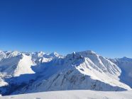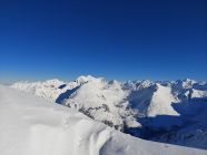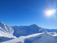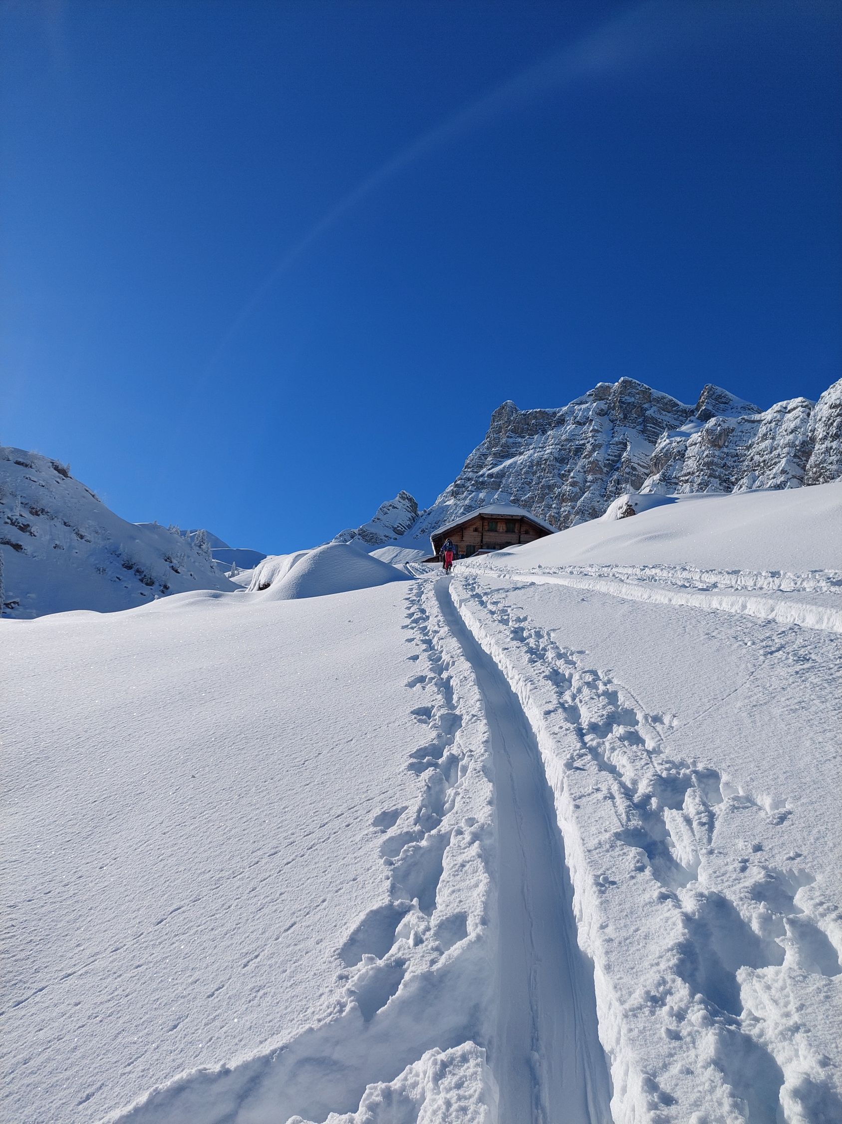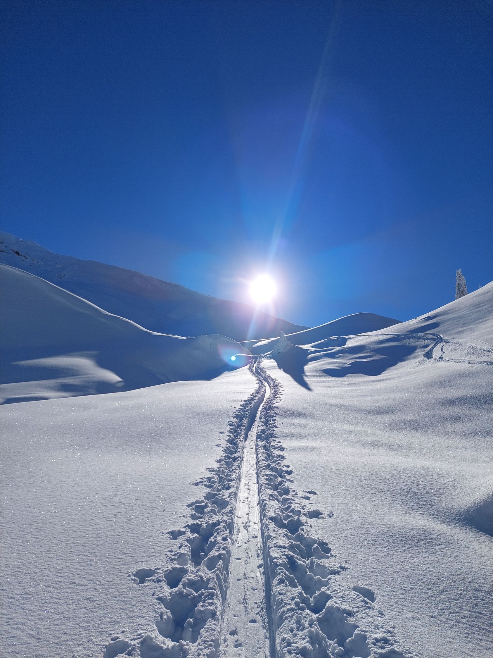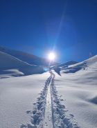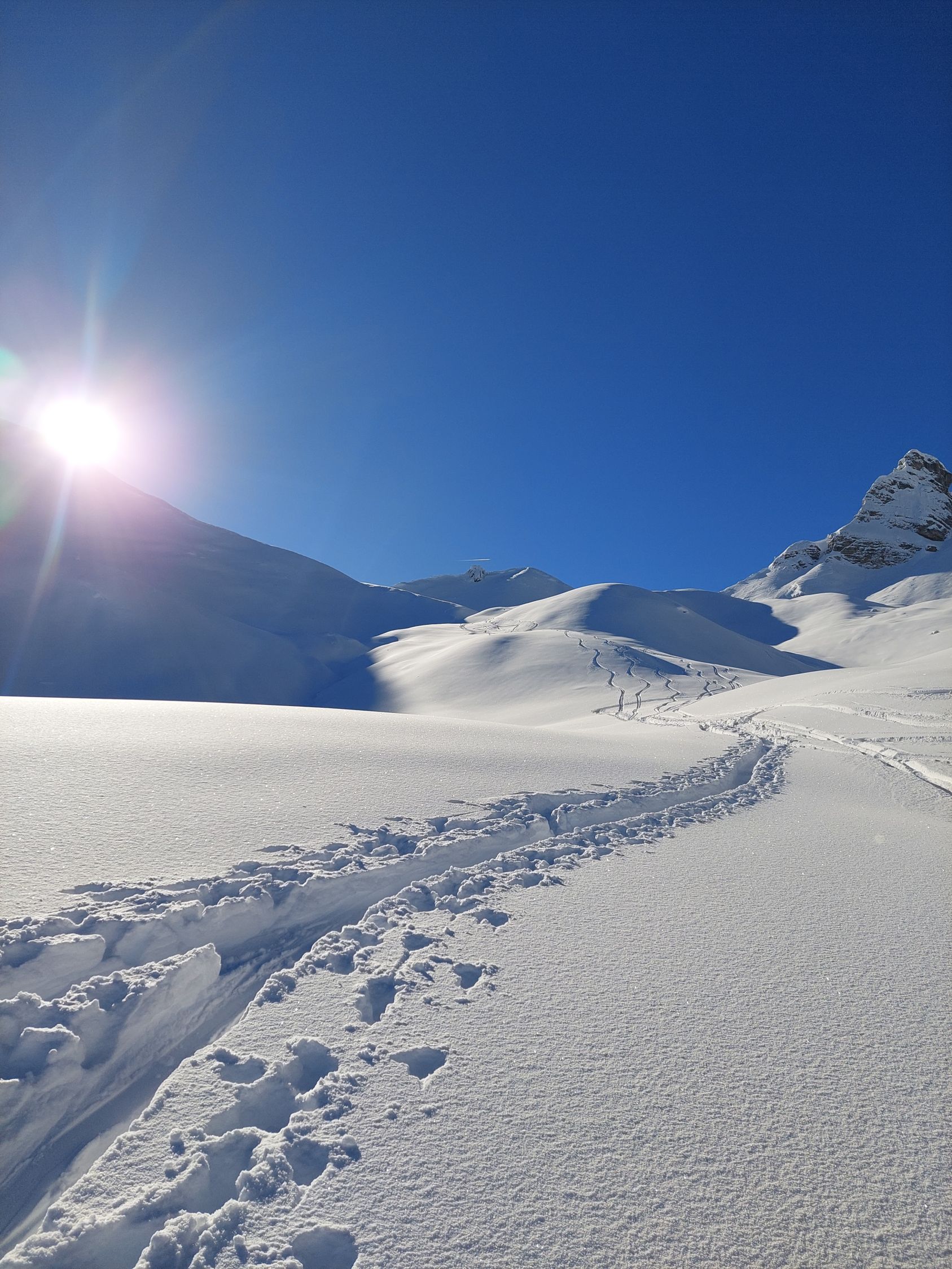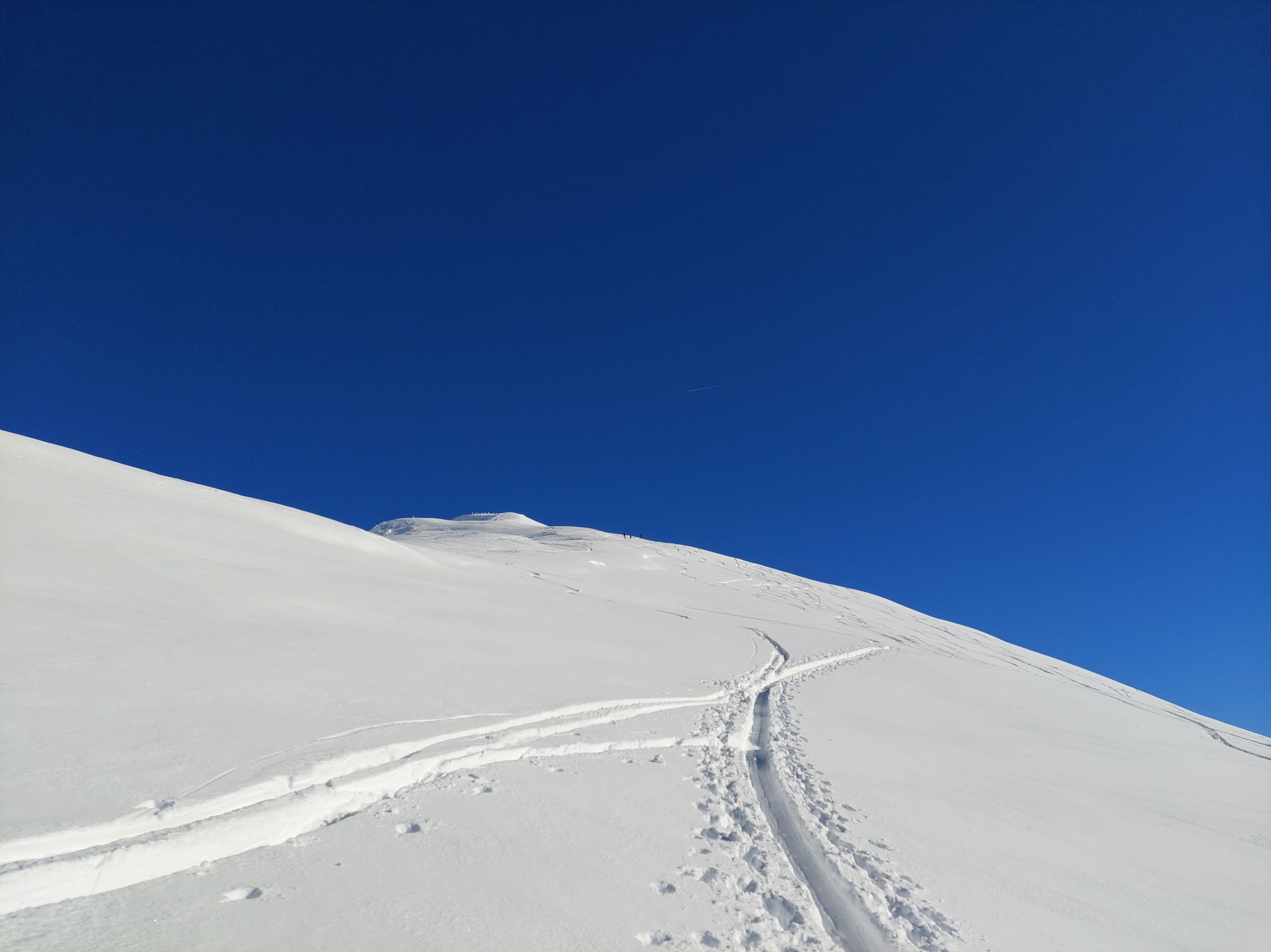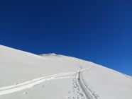 Abfahrt: In der Flanke bis zum Grimmifurggi hatte es reichlich gesetzten Pulver. Ab Grimmifurggi bis Alp Grimmi hat es sehr viel Schnee. Die Hänge sind zu flach, um schöne Bögen zu ziehen, daher fuhren die meisten Türeler der Aufstiegsspur entlang zur Alphütte hinunter. Der Waldweg ist gut eingeschneit, es hat aber wie fast immer zwei bis drei Stellen, die vorsichtig (Steine) befahren werden müssen.