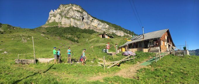Er befahl uns, die Wanderstöcke, die für ihn ohnehin unnötig sind, in den Rucksack zu packen, damit wir die Hände für die Kletterei frei hatten. Beni war erleichtert, als alle gut unten ankamen und wir gemütlich über die Wiesen bis zur Alpwirtschaft wandern konnten.