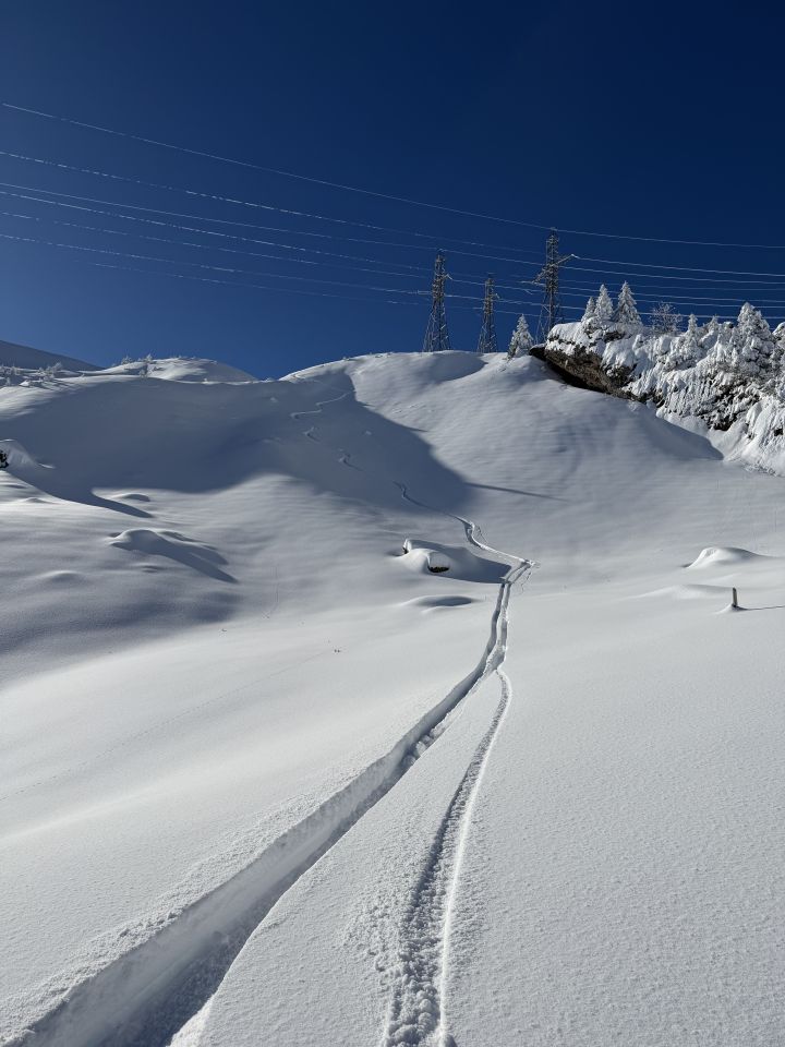 20cm Neuschnee unten, oben bis 40cm. Dank dem Spurer bis zur Fluonalp und Dank an den Türeler aus Rothenburg für die Spurarbeit danach.