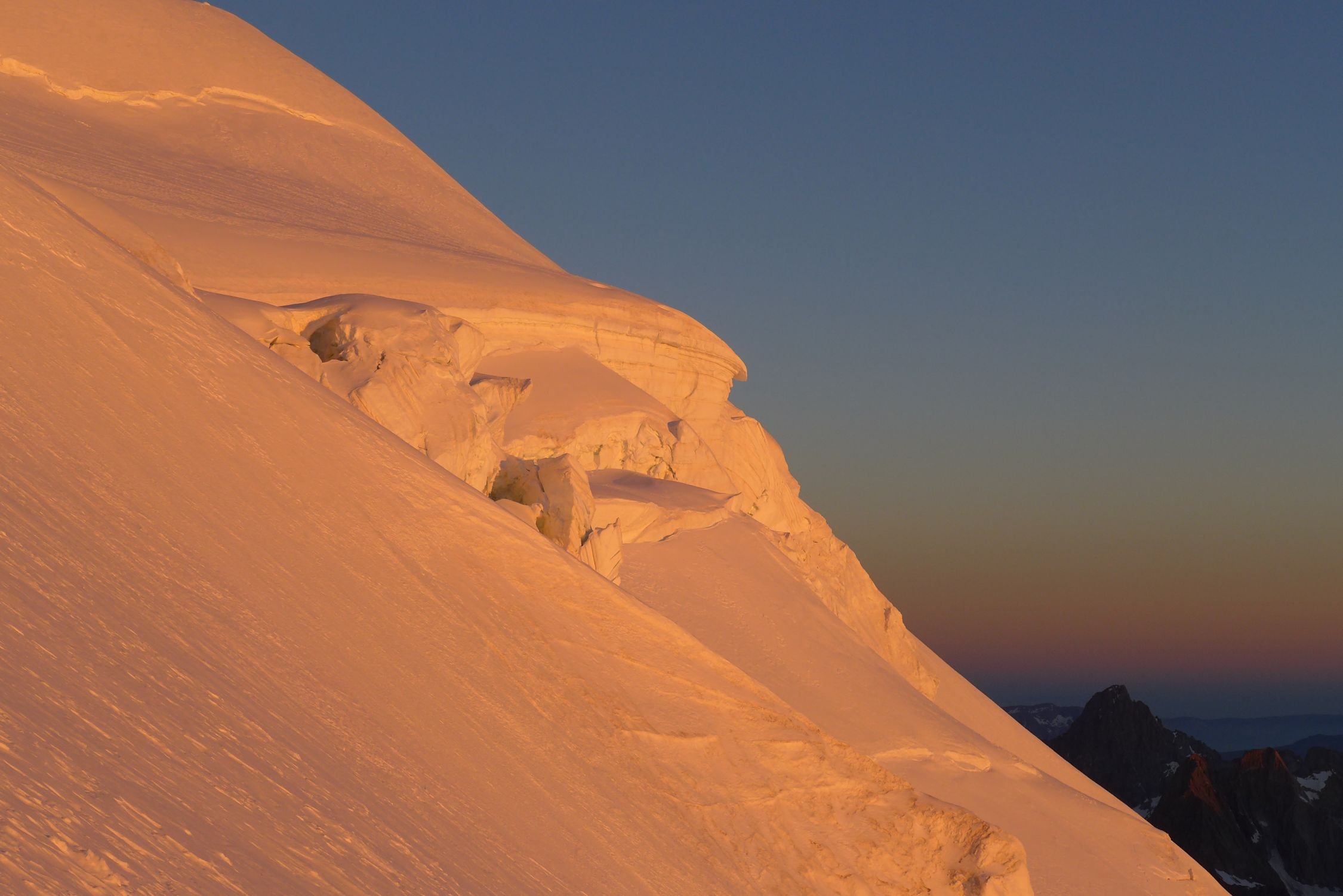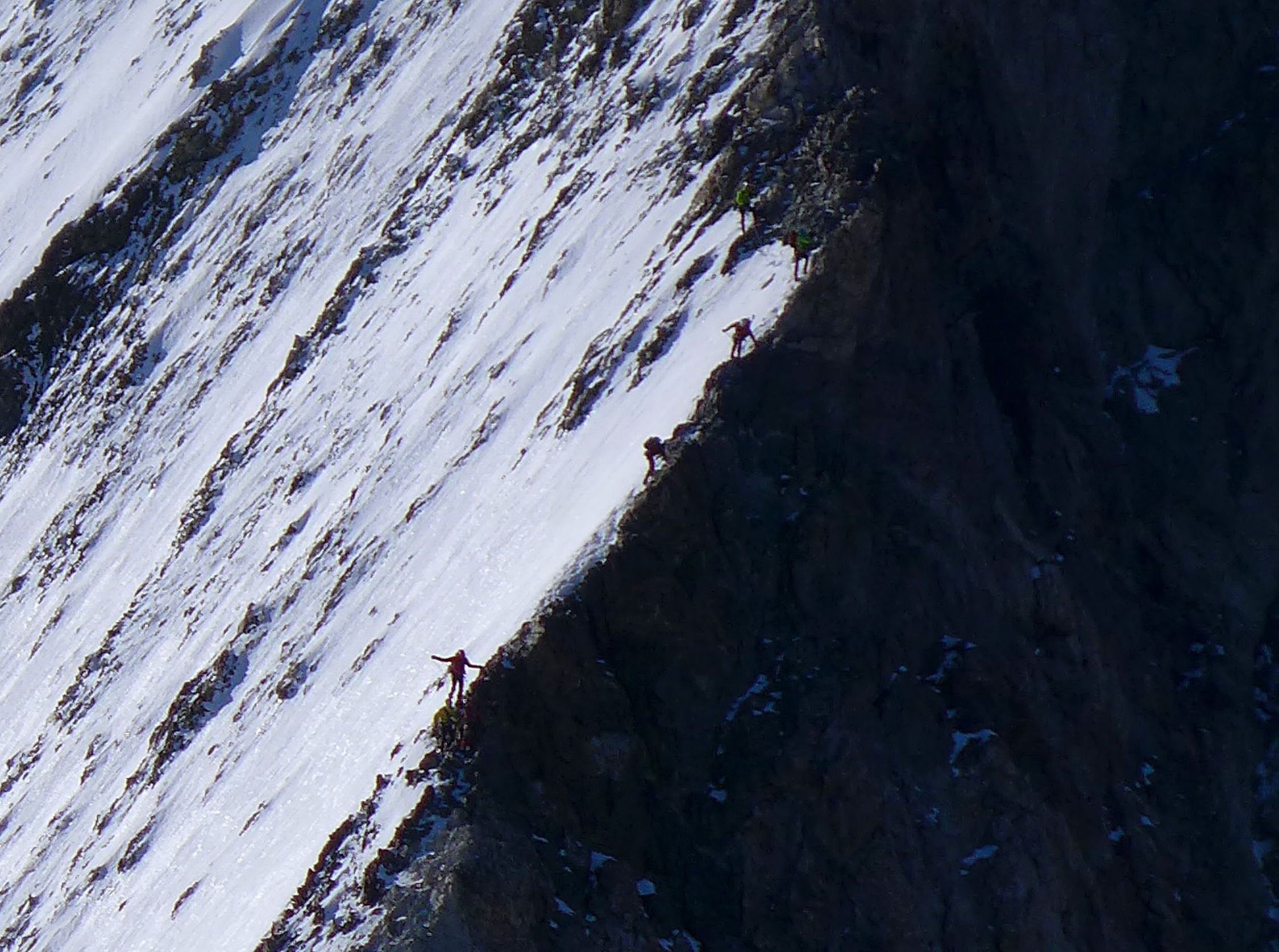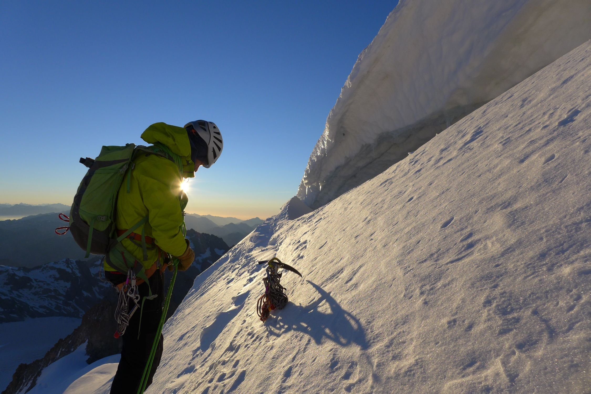 Beste Bedingungen. Gletscher ab ca. 2900m vollständig schneebedeckt, keine Spalten sichtbar(!). Coolidge-Couloir in sehr hartem Schnee, jedoch kein Blankeis. Keine einzige Eisschraube gesetzt.