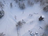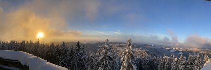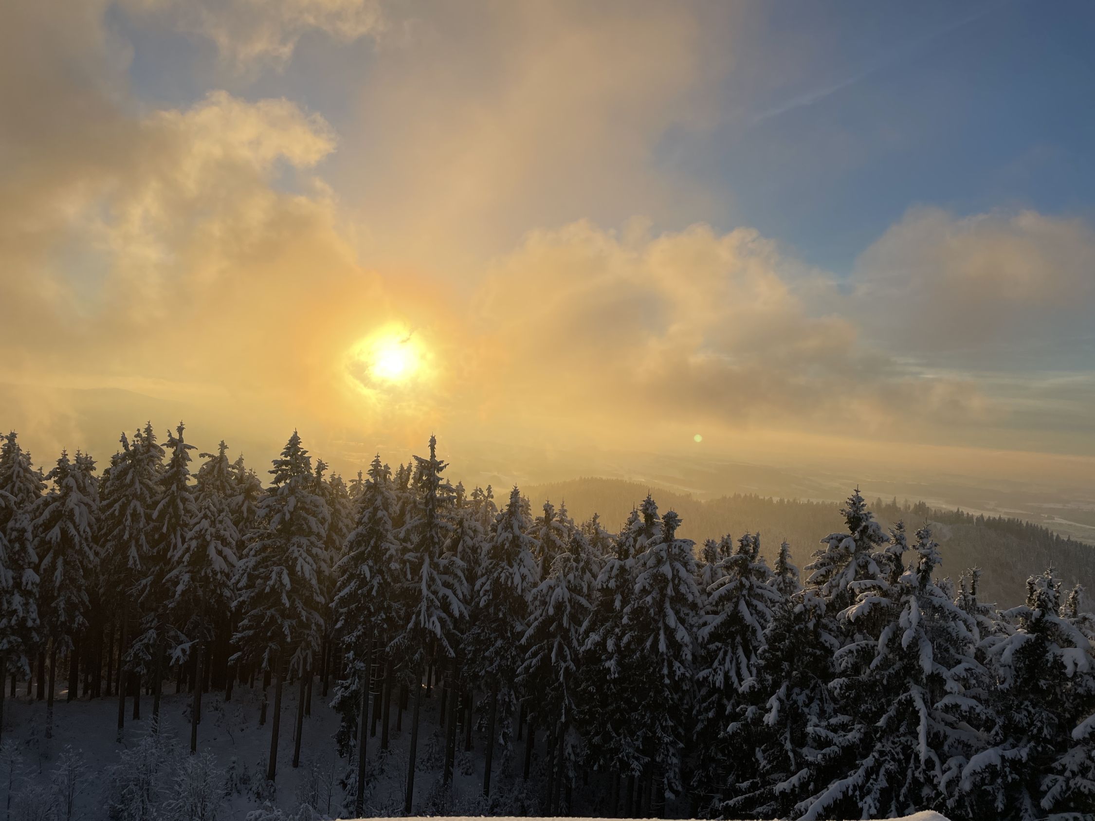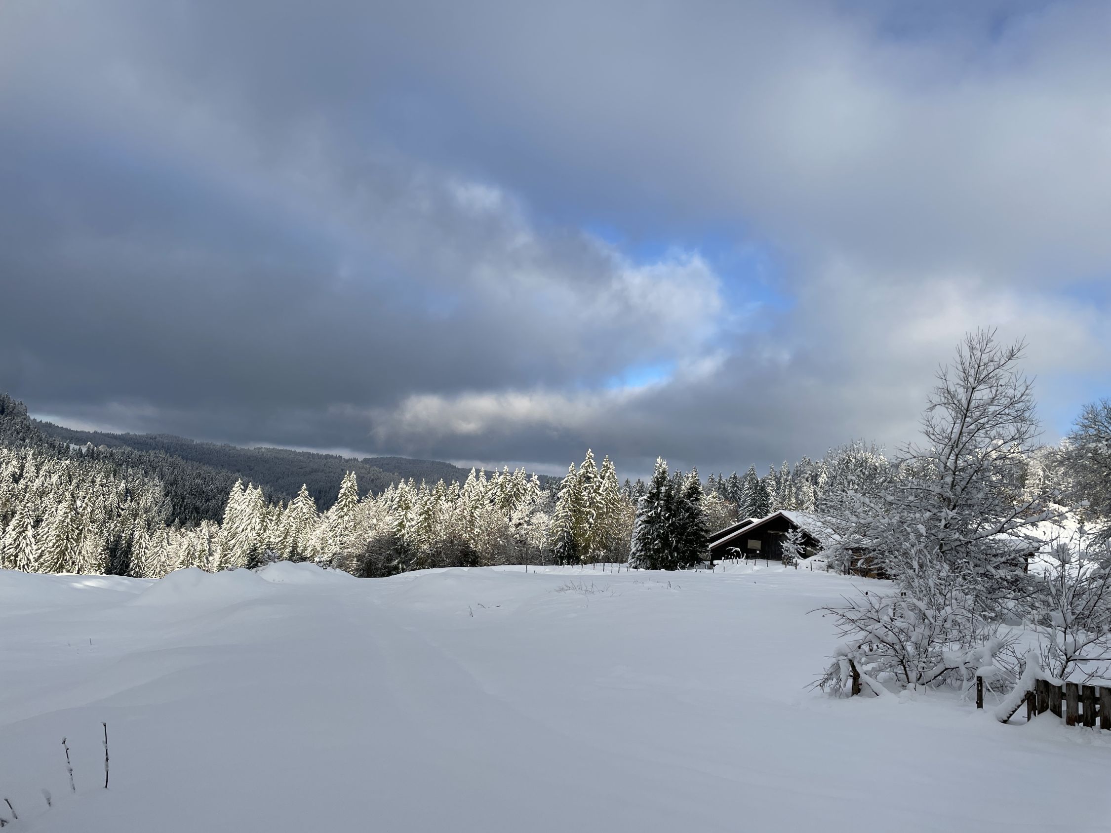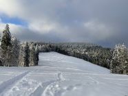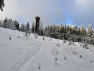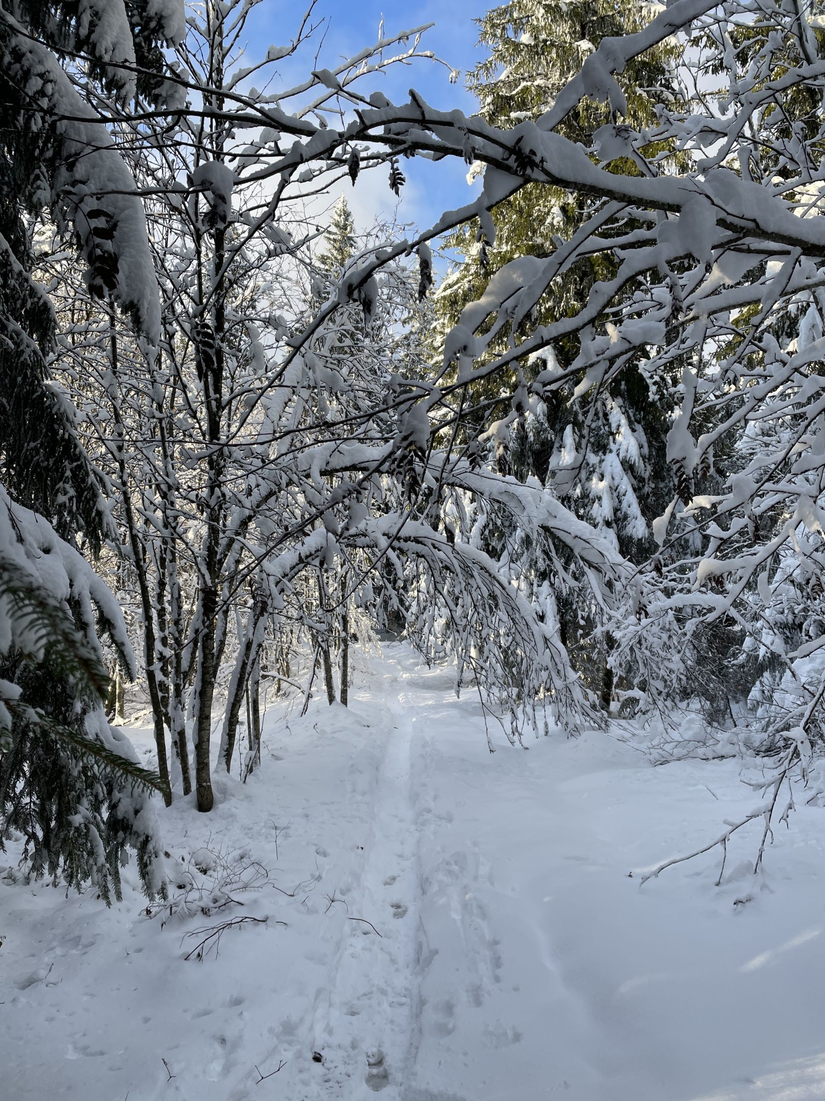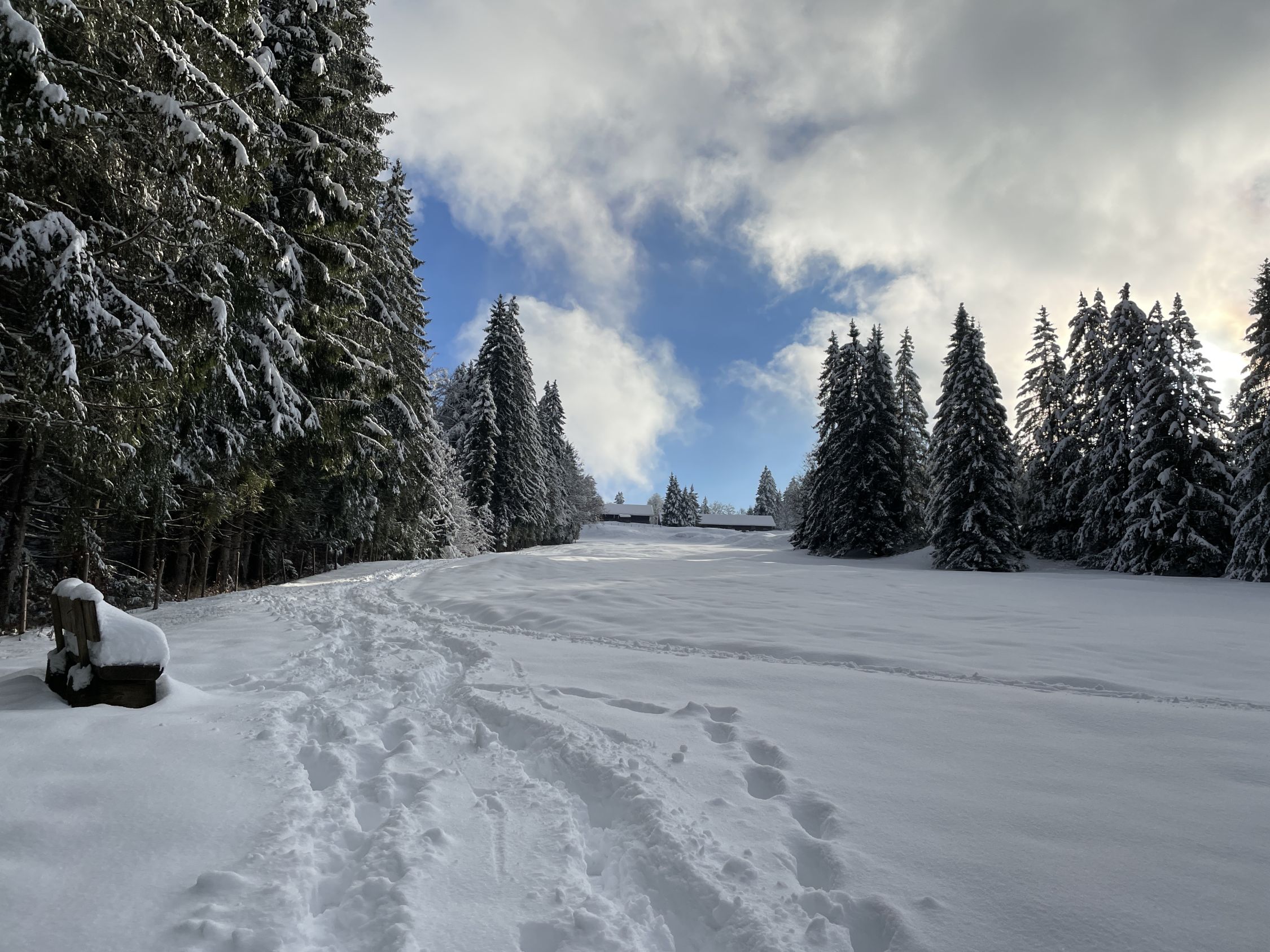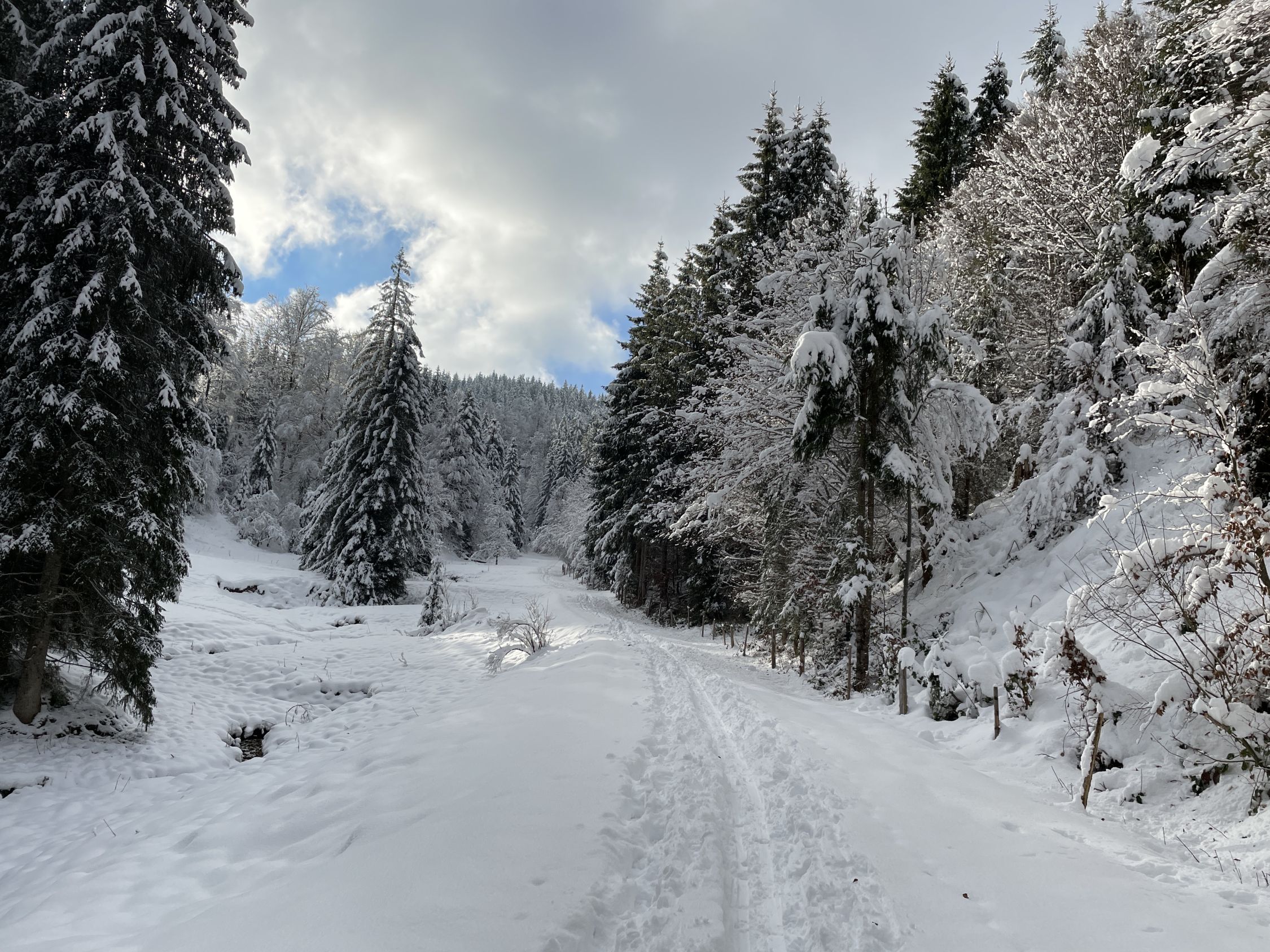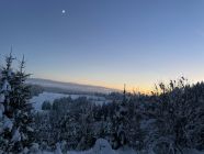 Später Tourenbeginn um 13:30 Uhr bei -1°C, am Abend dann -5°C. Wegen meinem Handicap im linken Bein, wollte ich darauf hoffen, dass die Wege heute schon gespurt wurden. Dafür nahm ich in Kauf, die letzte Stunde auf Forstwegen mit Stirnlampe zu laufen, zumal der Halbmond im wolkenlosen Himmel leuchtete. Schon am Auto auf dem überschneiten Schotter-Parkplatz konnte man die Schneeschuhe anschnallen. Es lagen 20 cm Pulverschnee der letzten 2 Tage. Oben ab der Alpe wurden es dann schon 30 cm. Auf den Wegen gab es in der Tat schon Laufspuren. Auf dem Glasmacherweg kam erst am Abend eine Spur von einem Schneescooter hinzu, wie auf dem Rückweg sah.