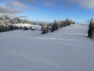 Sicherheitshalber hatte ich heute aufgrund aktueller Situation bei mir meine Teleskop-Unterarm-Gehstützen am Rucksack dabei für den Fall, falls die Schmerzen im linken Bein zu stark werden würden, um dann den „Schongang“ für dieses Bein einlegen zu können. Ich konnte die Tour aber vollständig mit den Skistöcken absolvieren. Vor mir startete auf dem Glasmacherweg ein Pärchen mit LL-Ski und Hund zur Alpe. In der Alpe Wenger Egg war jemand anwesend. Abends auf dem Rückweg sah ich Licht aus deren Fenstern. Ihren Sommerbetrieb (Jausenstation) nimmt die Alpe jedoch erst ab 1. Mai auf. Unterwegs kamen mir 3 Leute entgegen, die sich über meine Krücken am Rucksack wunderten, jedoch nach kurzer Erklärung mir Respekt zollten. Ich benötigte für die Tour die doppelte Zeit, wie sie auf den Wegweisern für den Sommer angegeben sind, also im Durchschnitt 1,9 km/h.