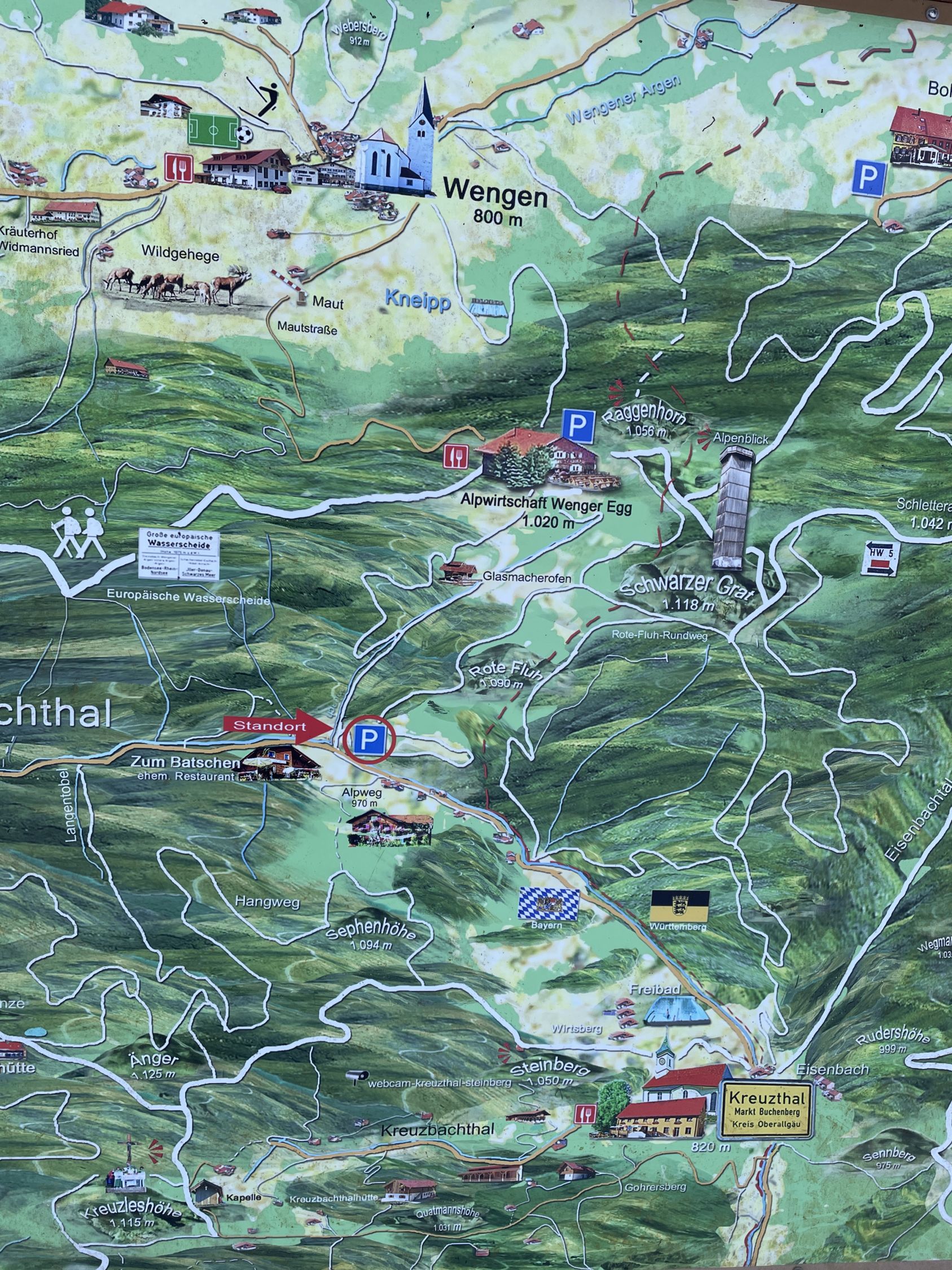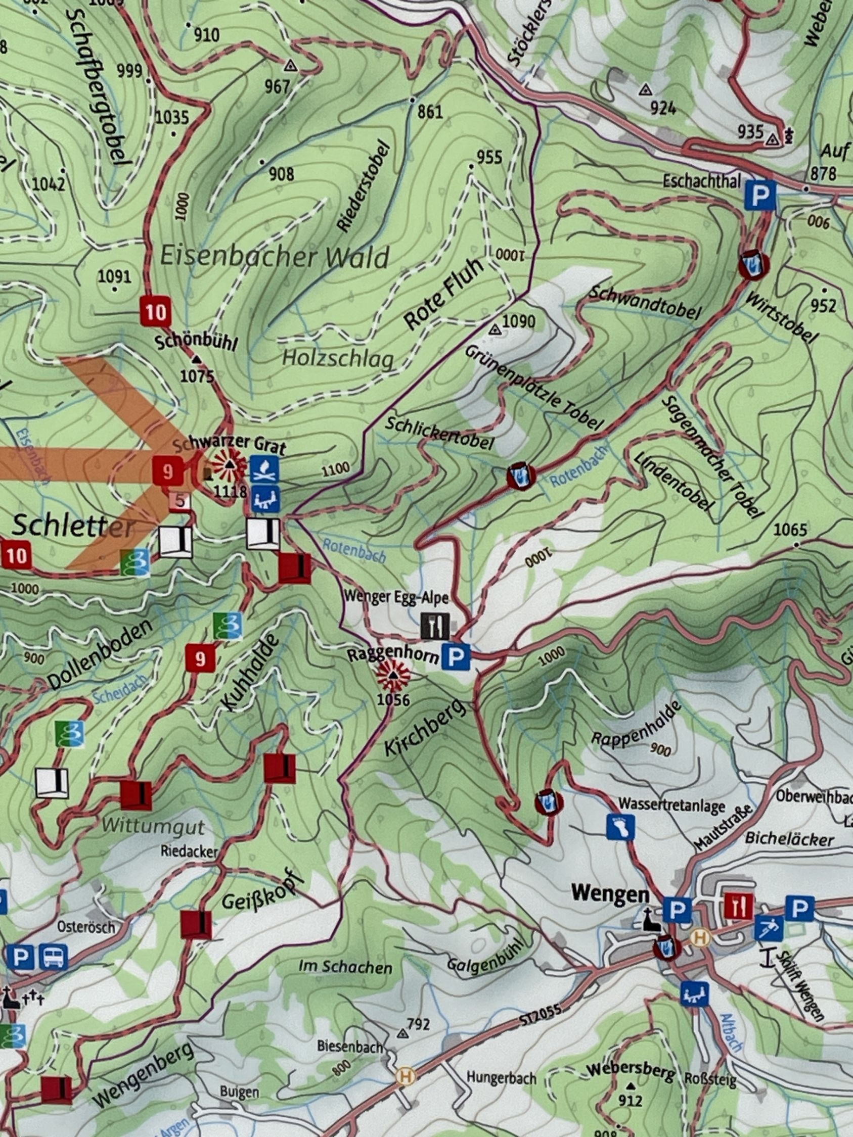 Batschen (Quellenried) – Glasmacherweg – P 892 - Glasmacherofen (P 944) – Wenger Egg Alpe – Raggenhorn – Scheittach – Schwarzer Grat – Schlickertobel – Grünenplätzle Tobel – Schwandtobel - Batschen